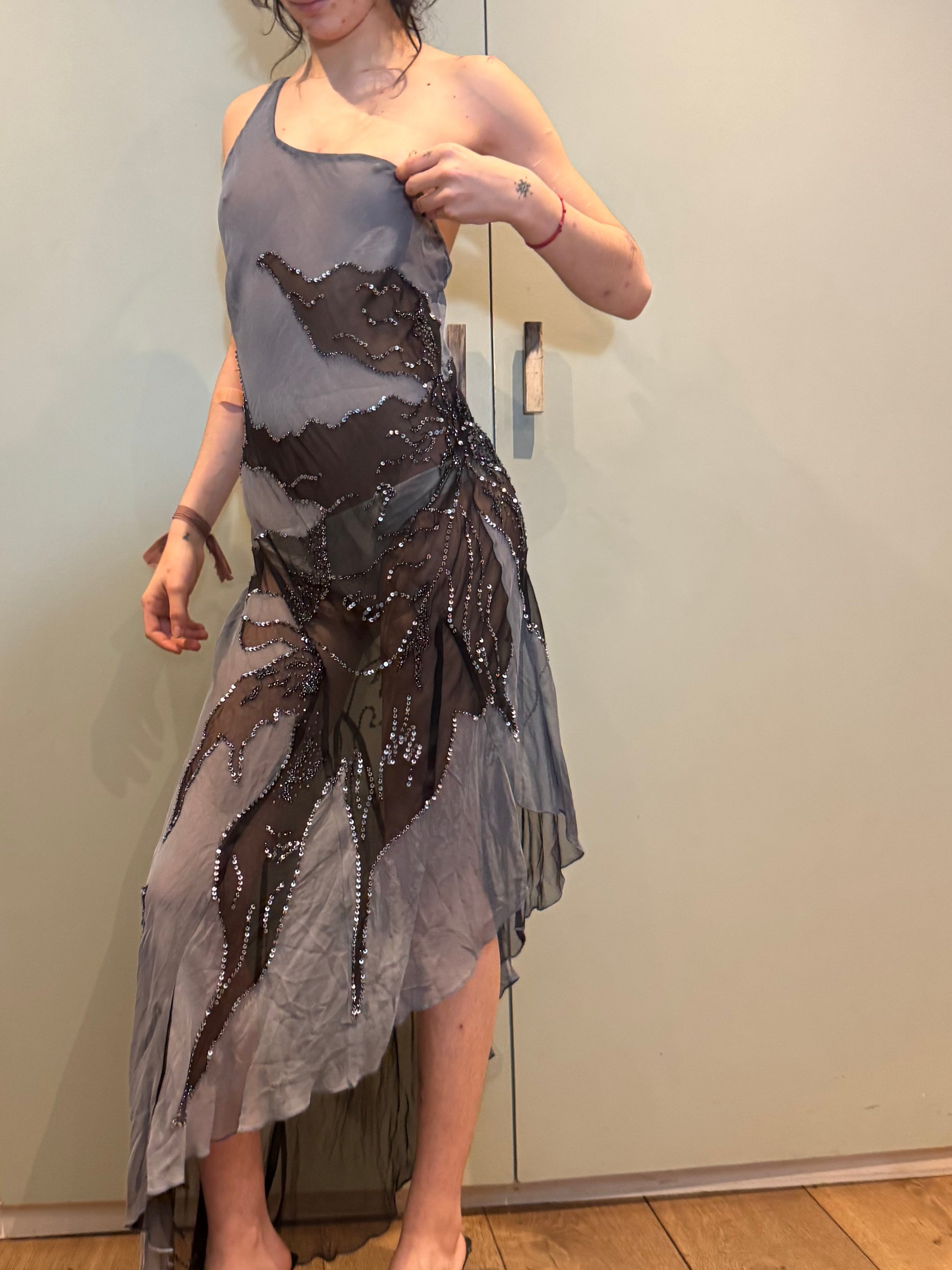 Original 80’ silk chiffon beaded  bias cut dress featuring a strappy one shoulder design and a large floral beaded pattern. Its asymmetrical hem exudes timeless appeal, while the alluring and sexy silhouette can be effortlessly dressed up or down for any occasion. Makes the perfect party dress.
