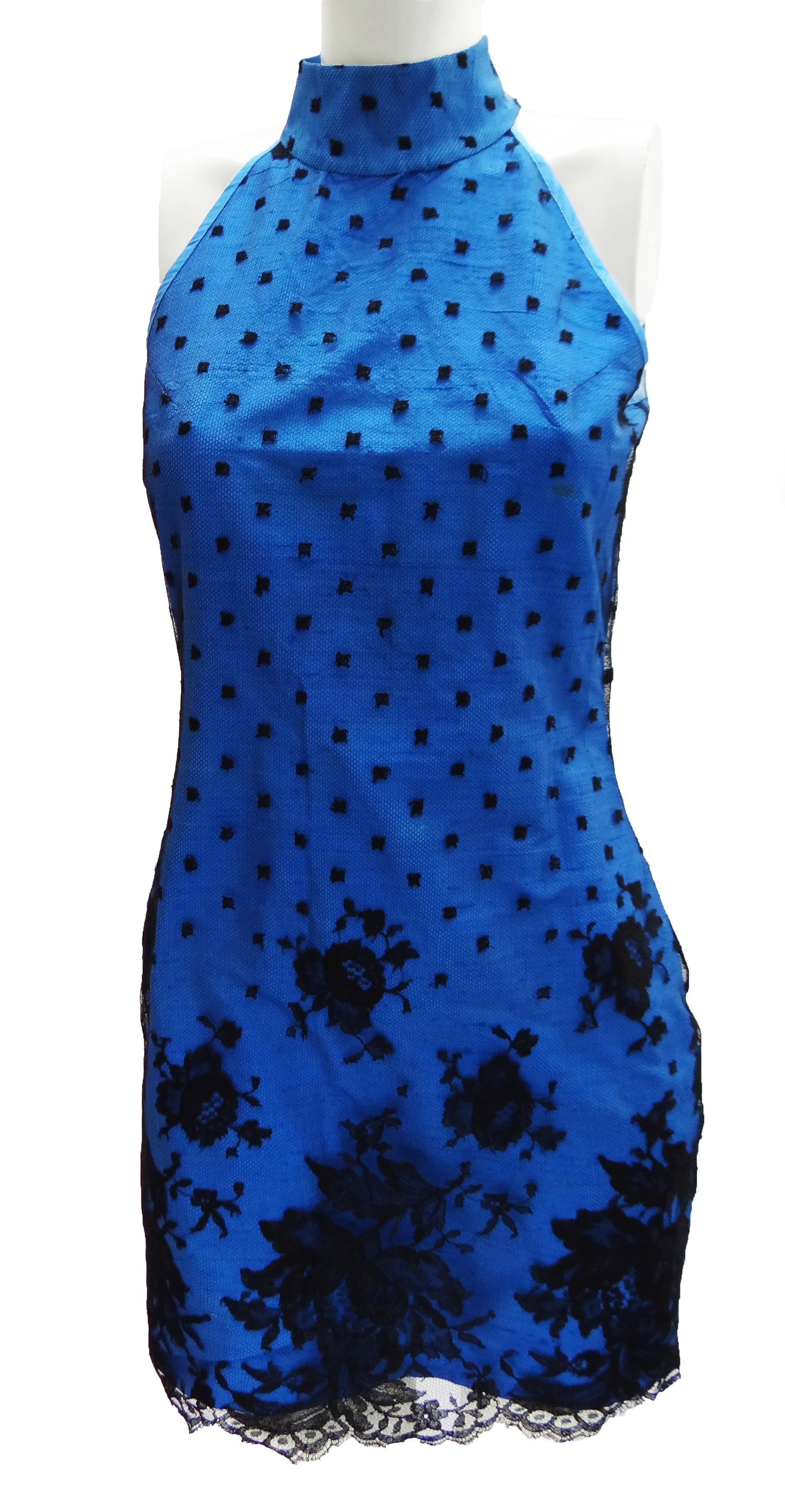 Vintage Electric Blue Silk Halter Mini Dress with Lace Shell, UK10-12