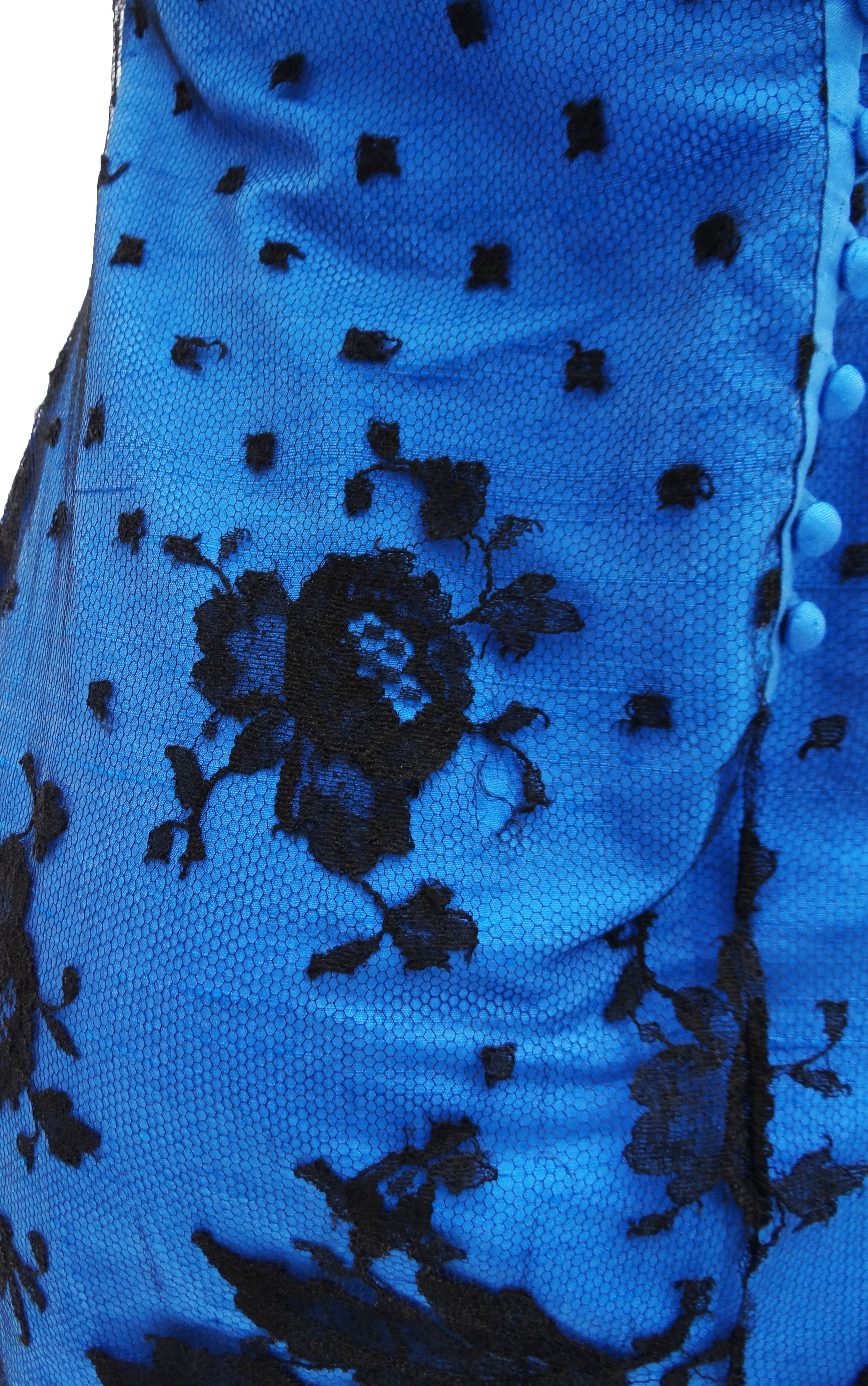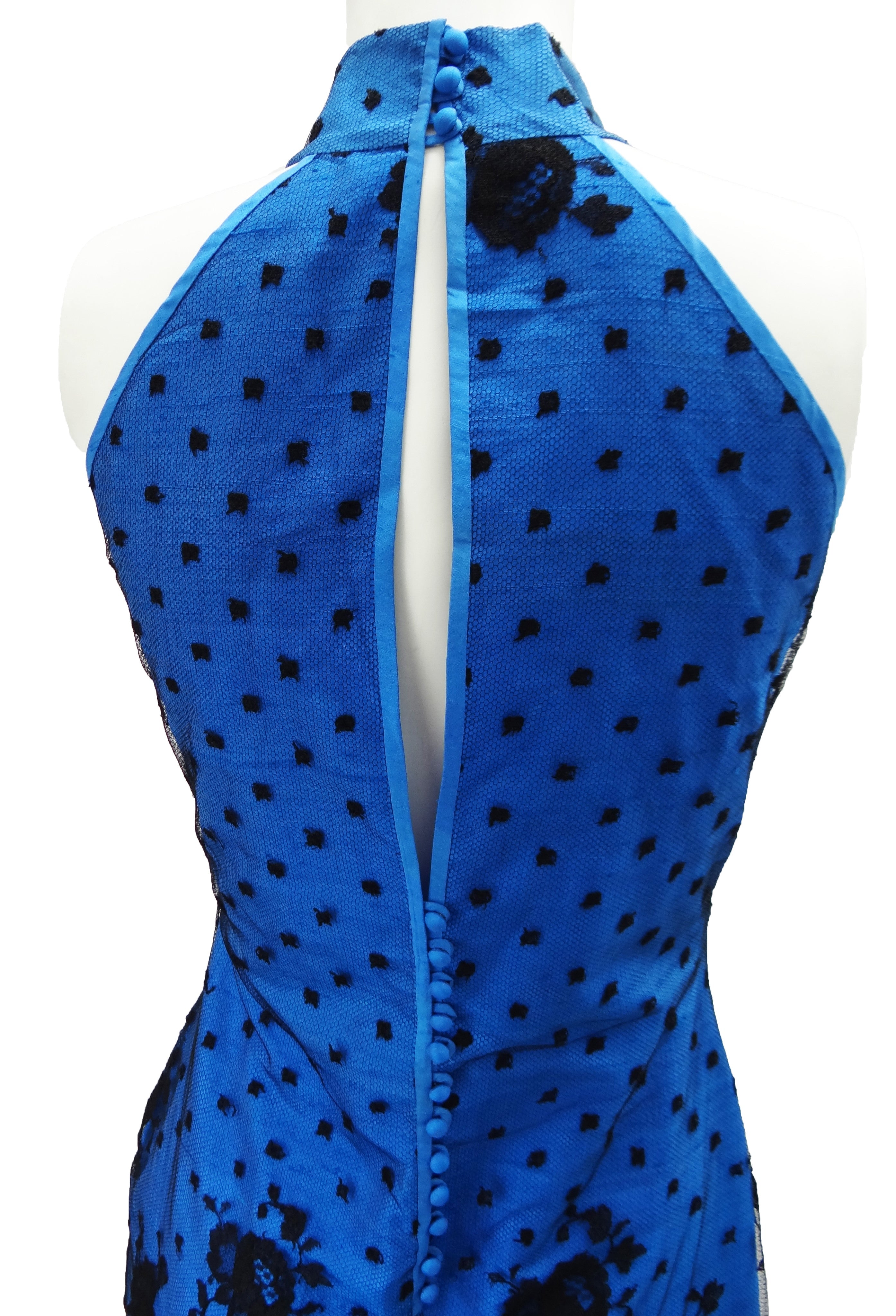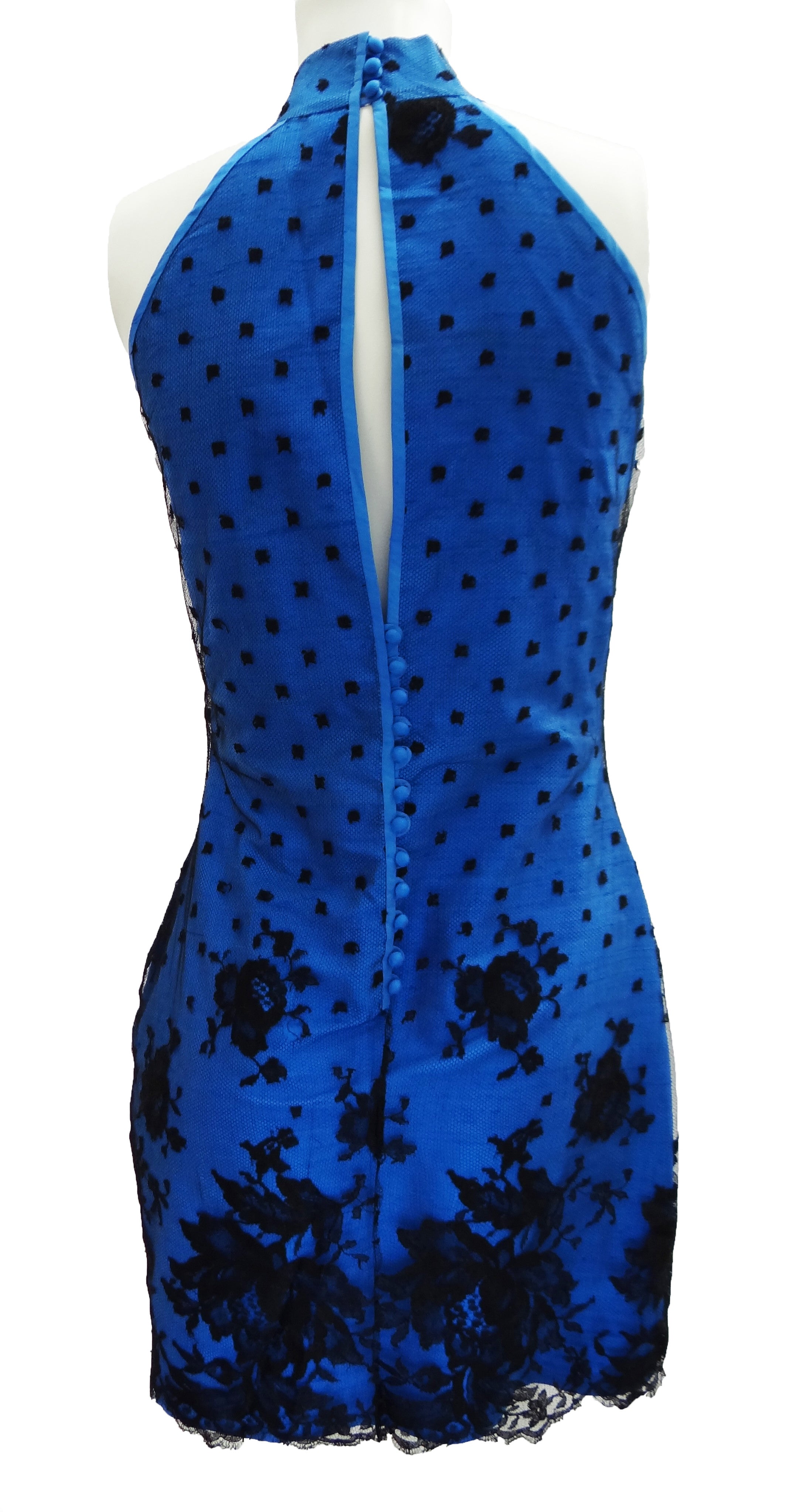 A chic vintage halter neck mini dress in electric blue silk with lace shell, handmade by Amanda Robinson c.1987. It is fitted to the body with a high halter neck and fastens down the back with matching looped covered buttons and two openings. It has a scalloped lace shell covered with rose pattern.