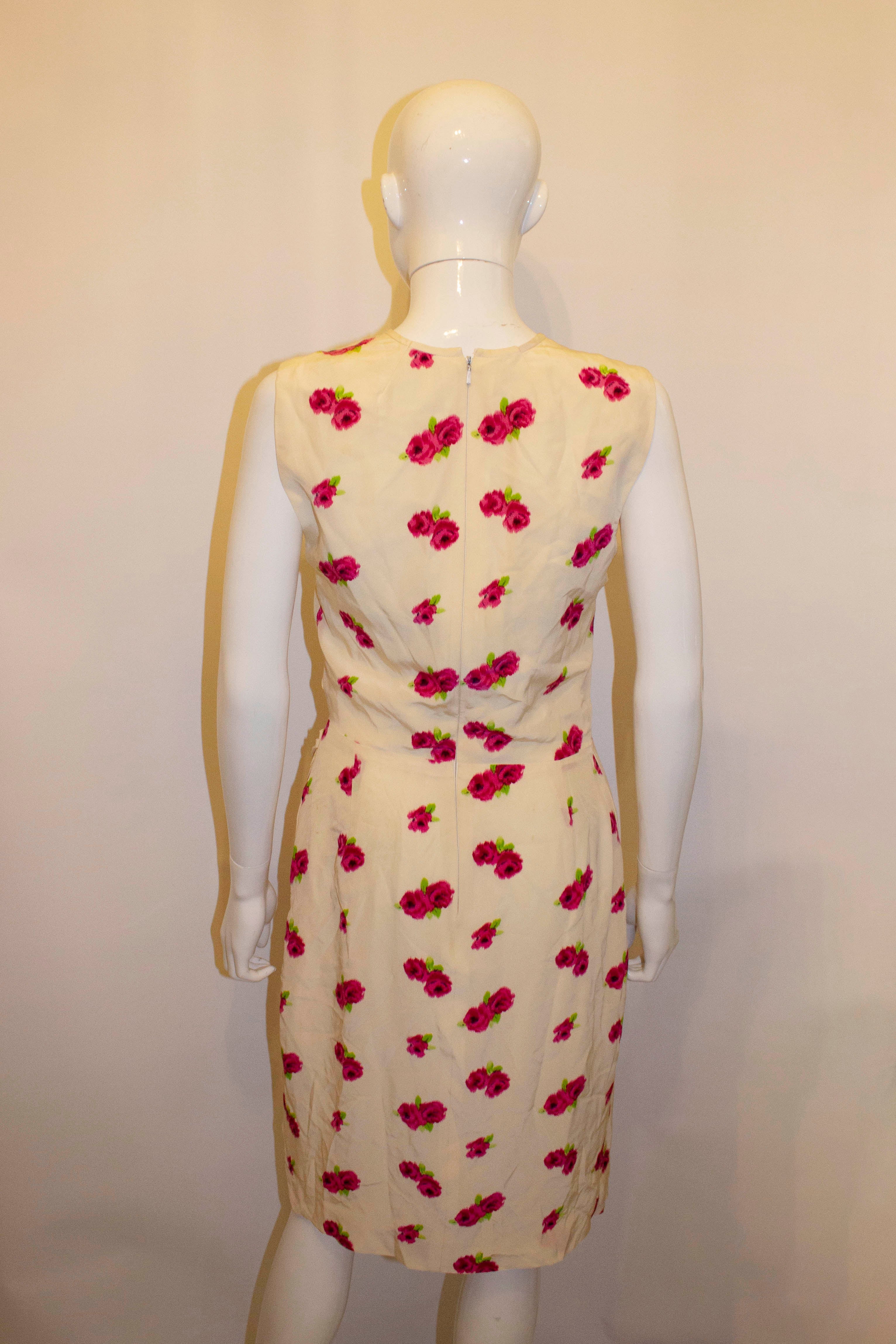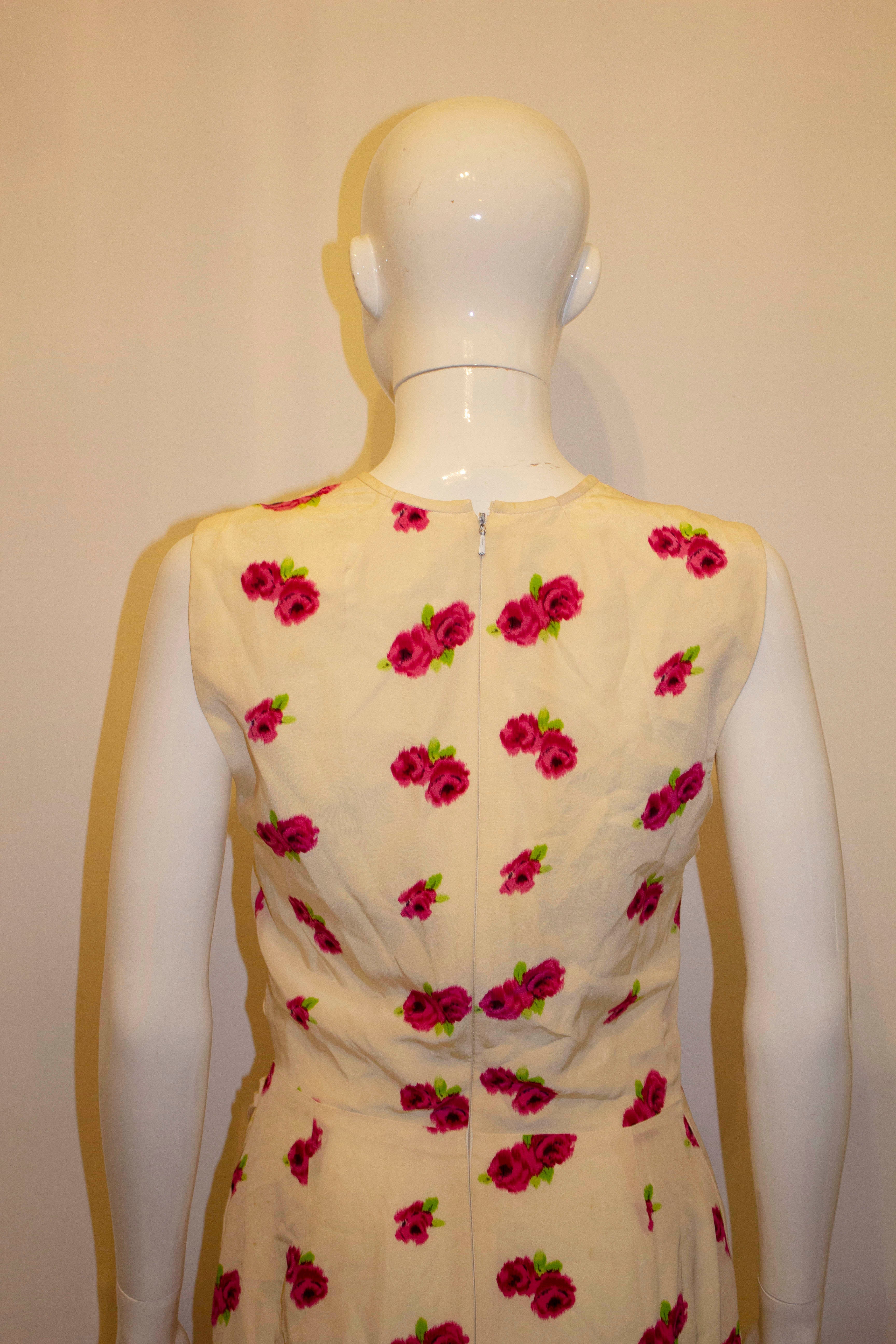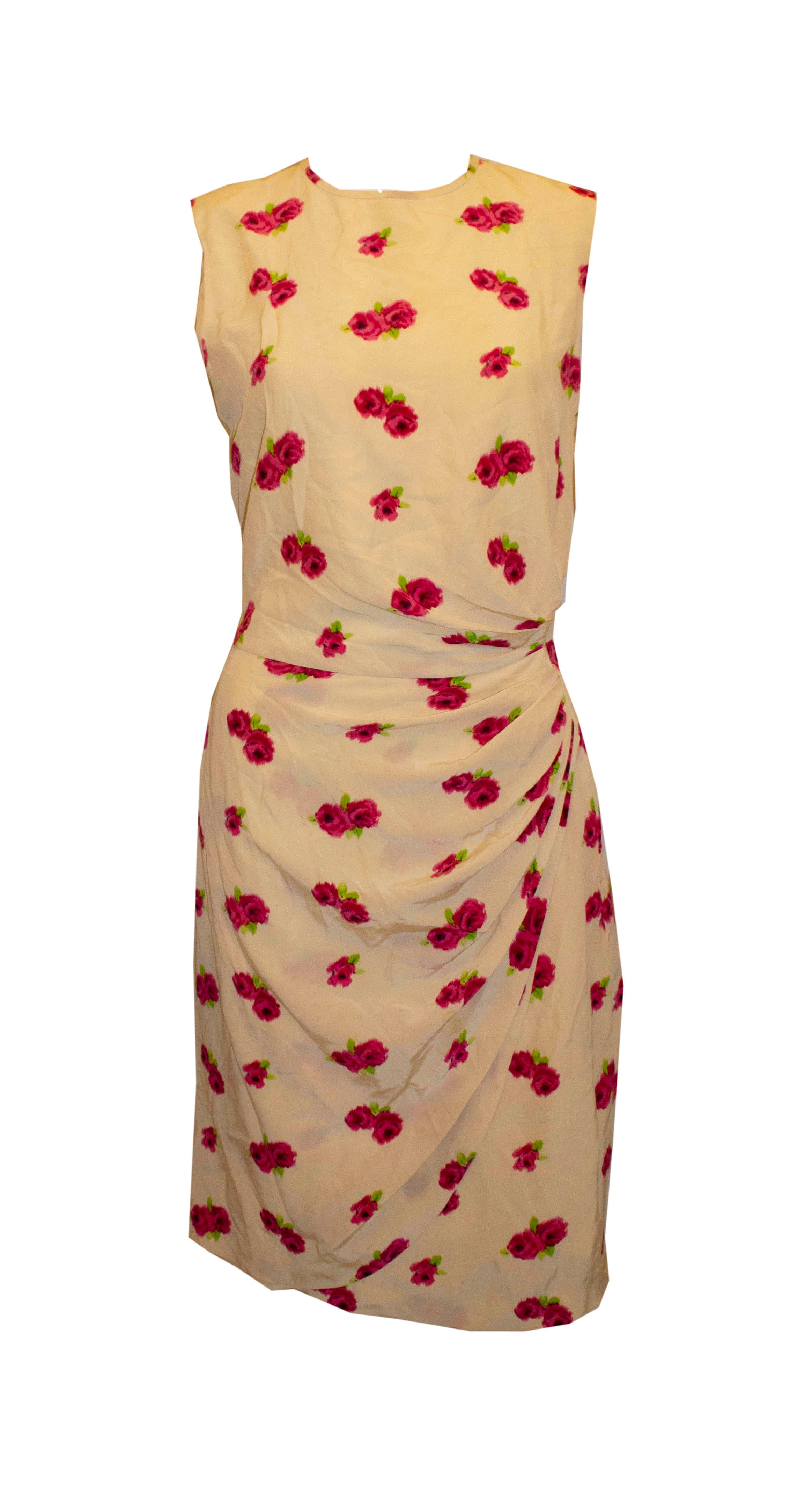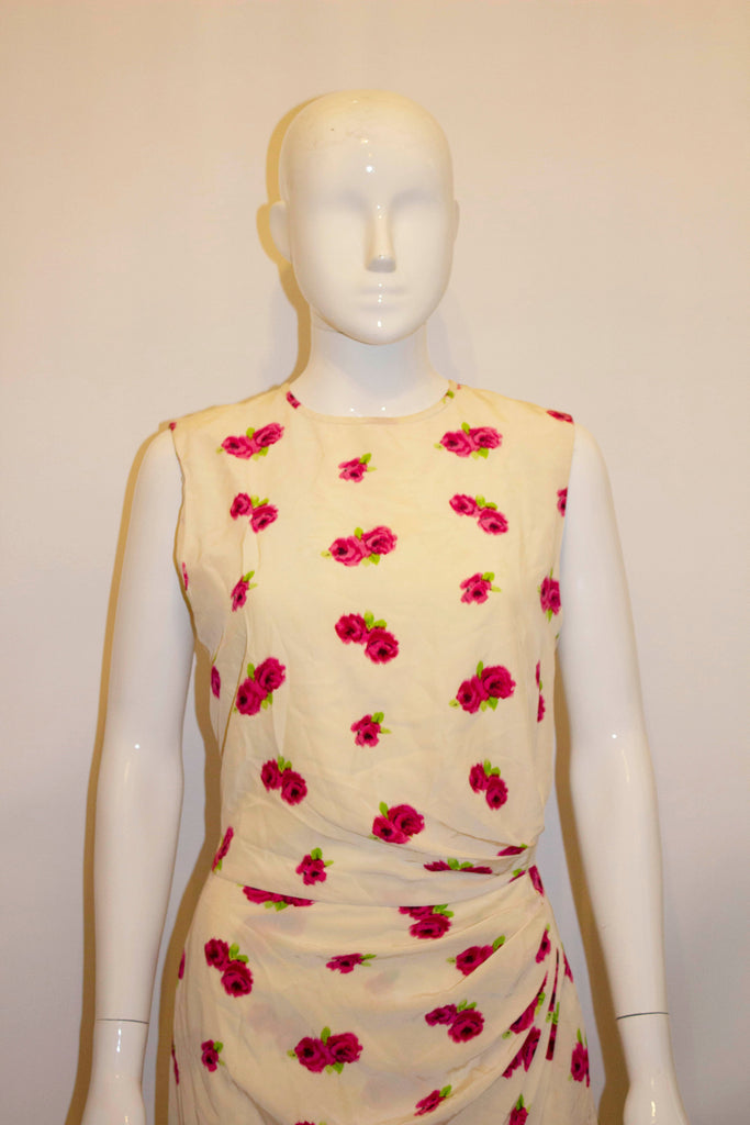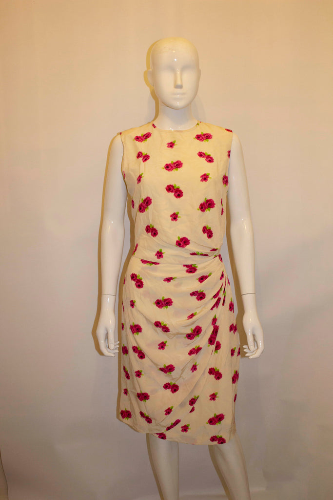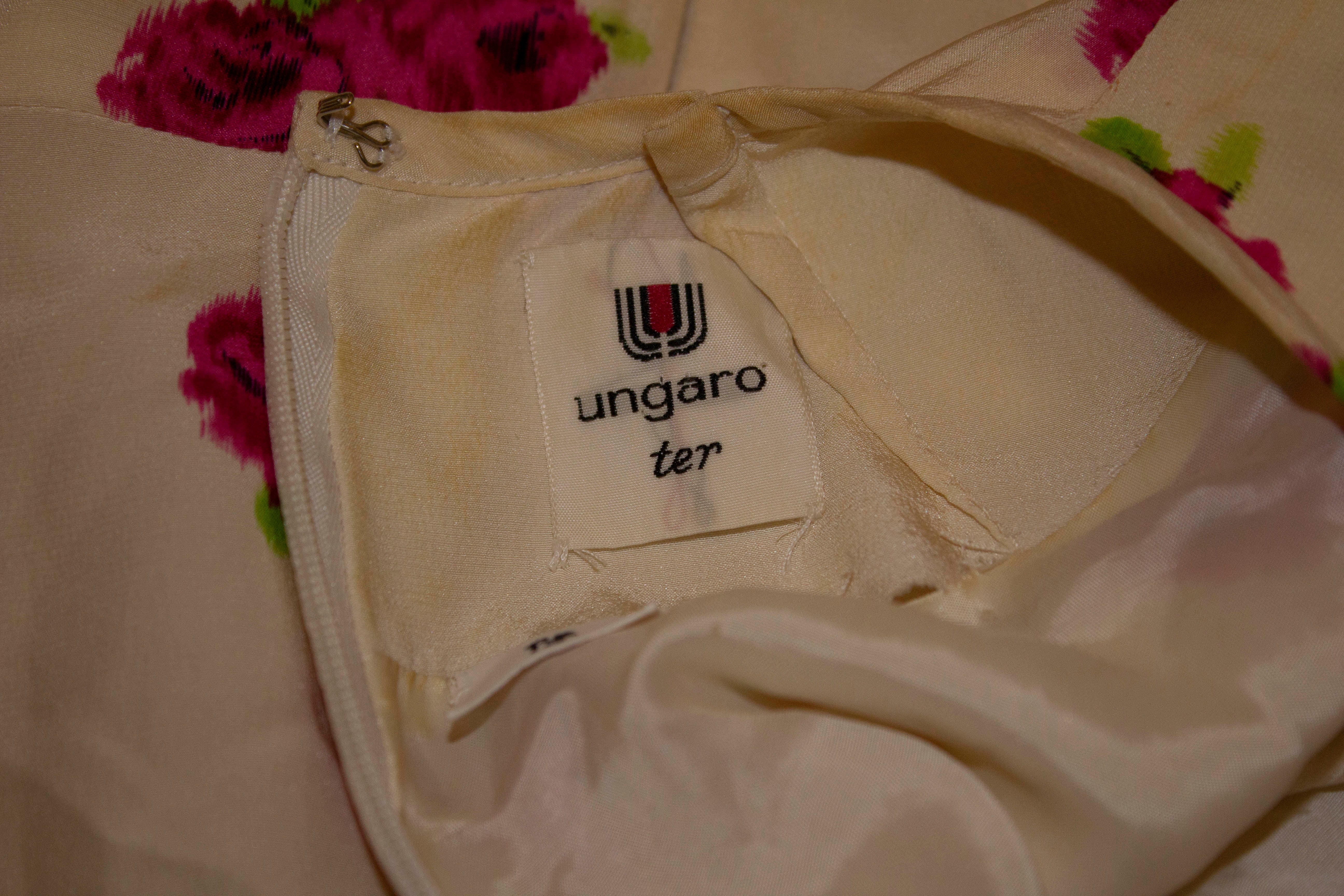 A stunning vintage silk dress by Ungaro. The dress has a white background with a pink and green floral print., and gathering on the left hand side. The dress is lined and has a back central zip opening. Size 46/ 12 . Measurements: Bust 36'', length 41''