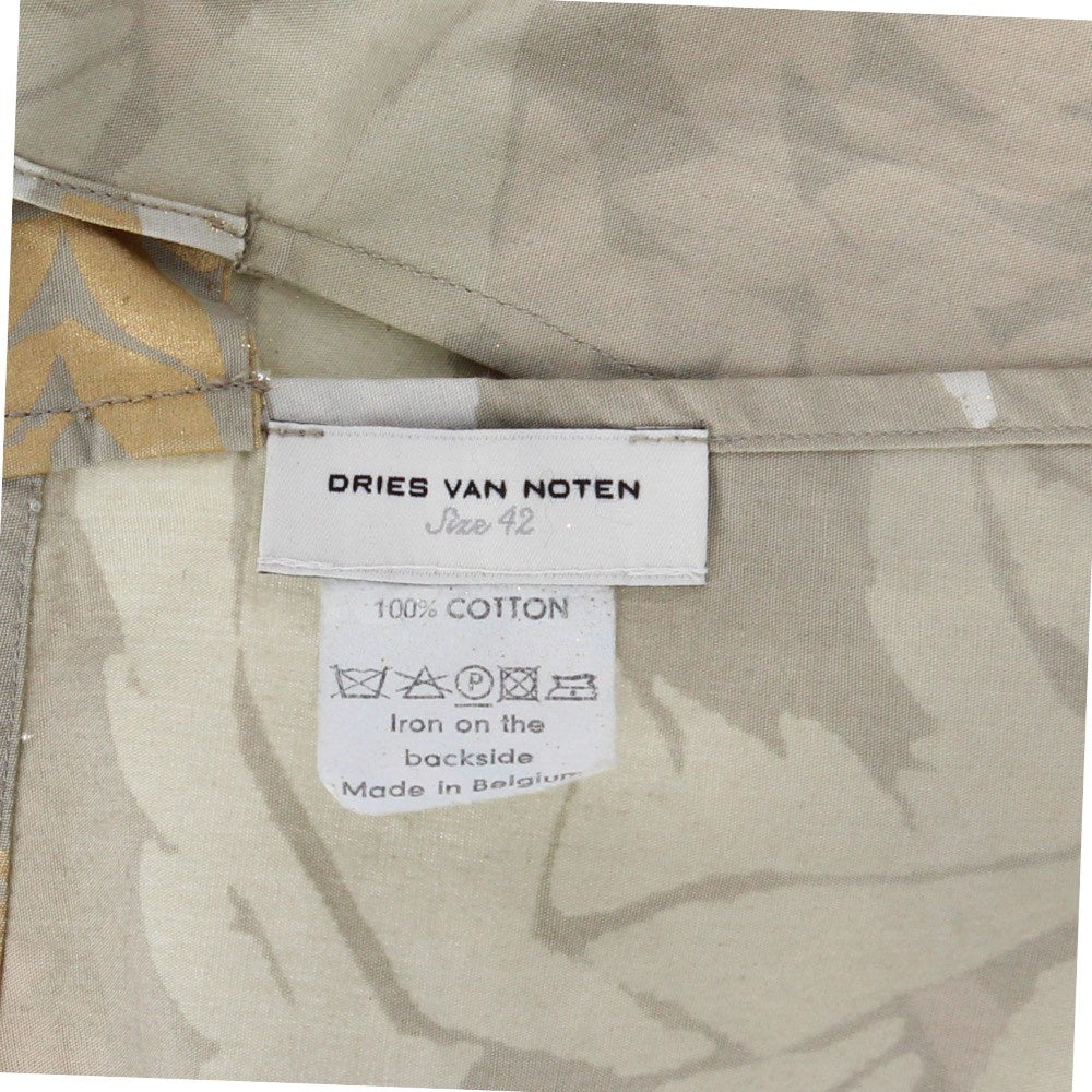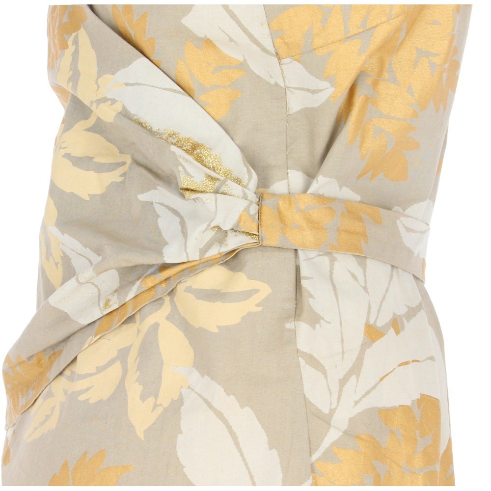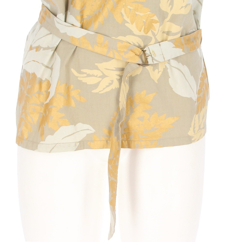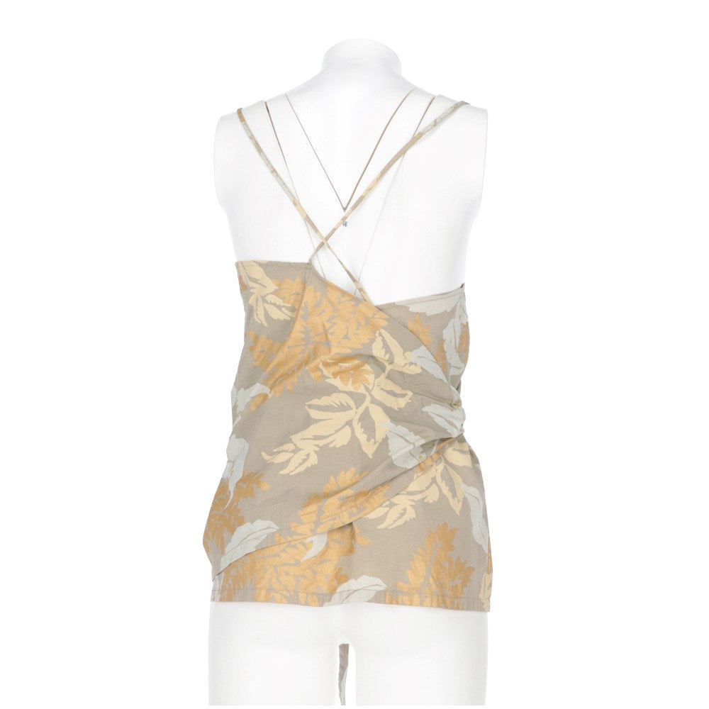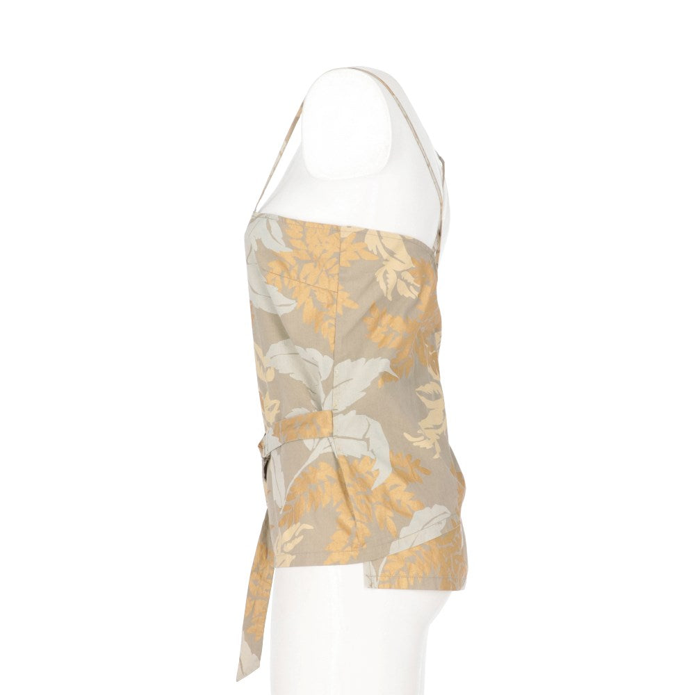 Dries Van Noten beige cotton 2000s top with gold-tone lurex and custard yellow floral print. Rear cross shoulders straps and adjustable waist belt.