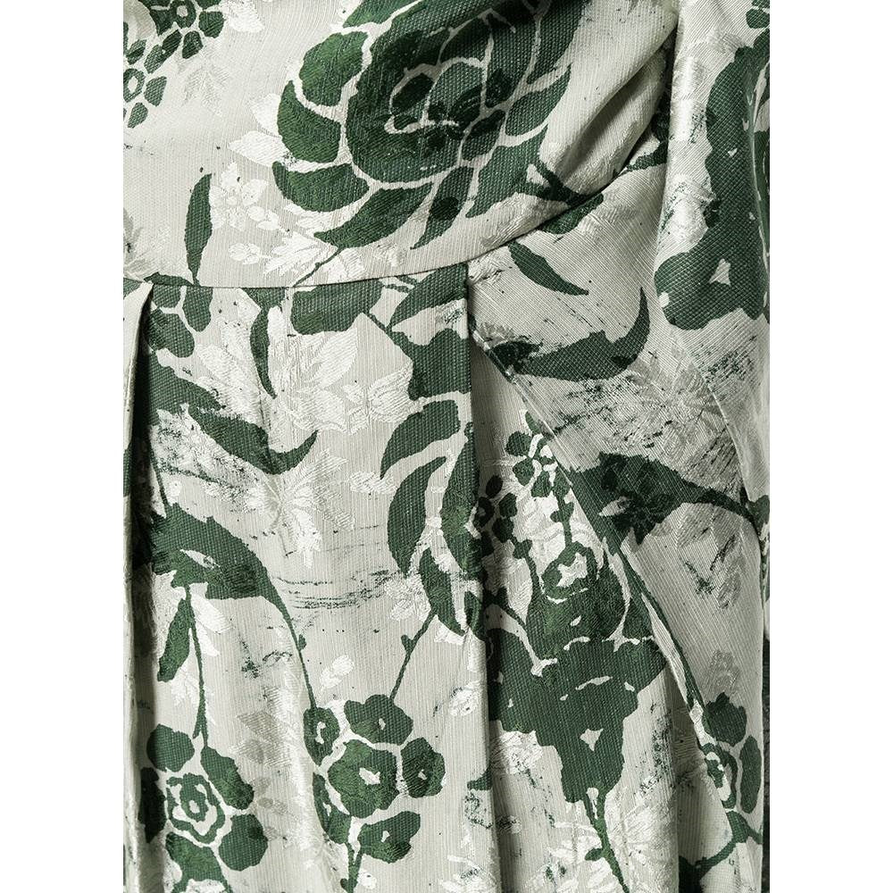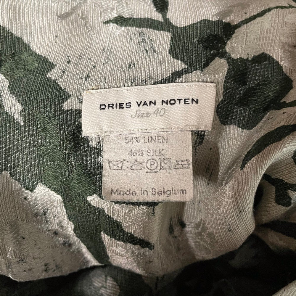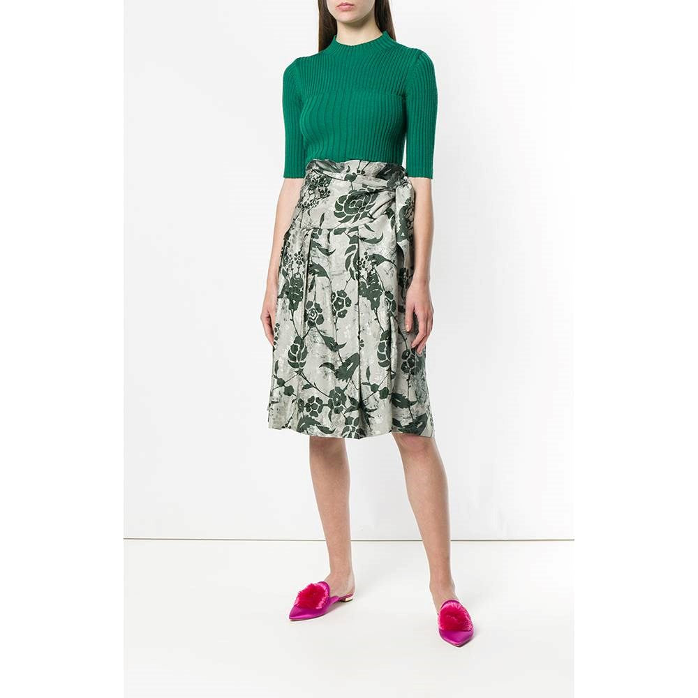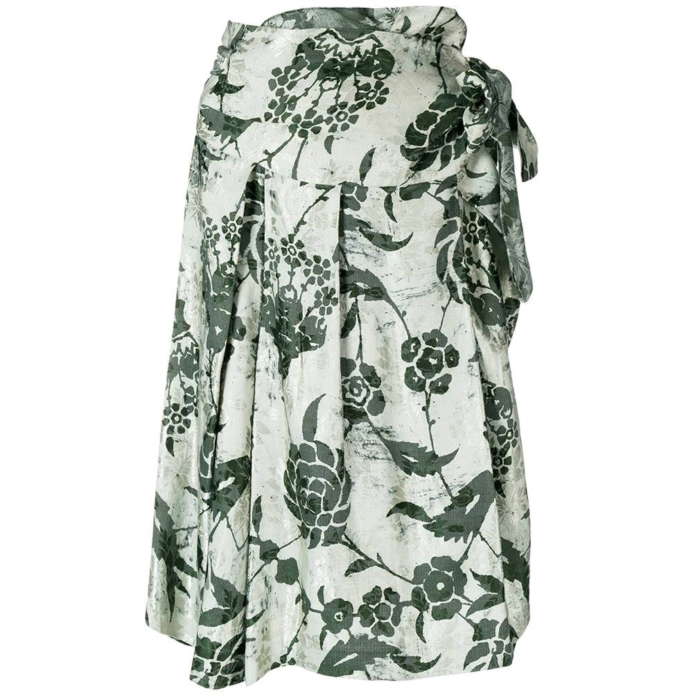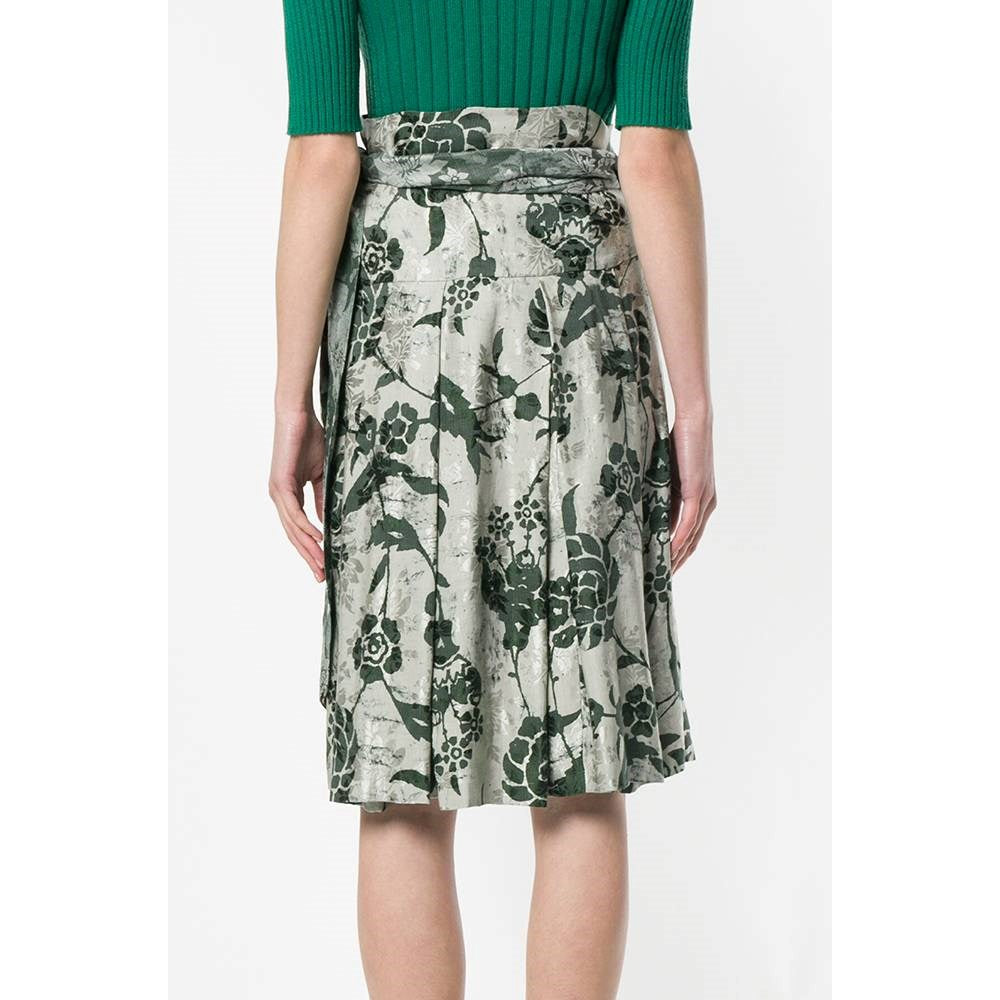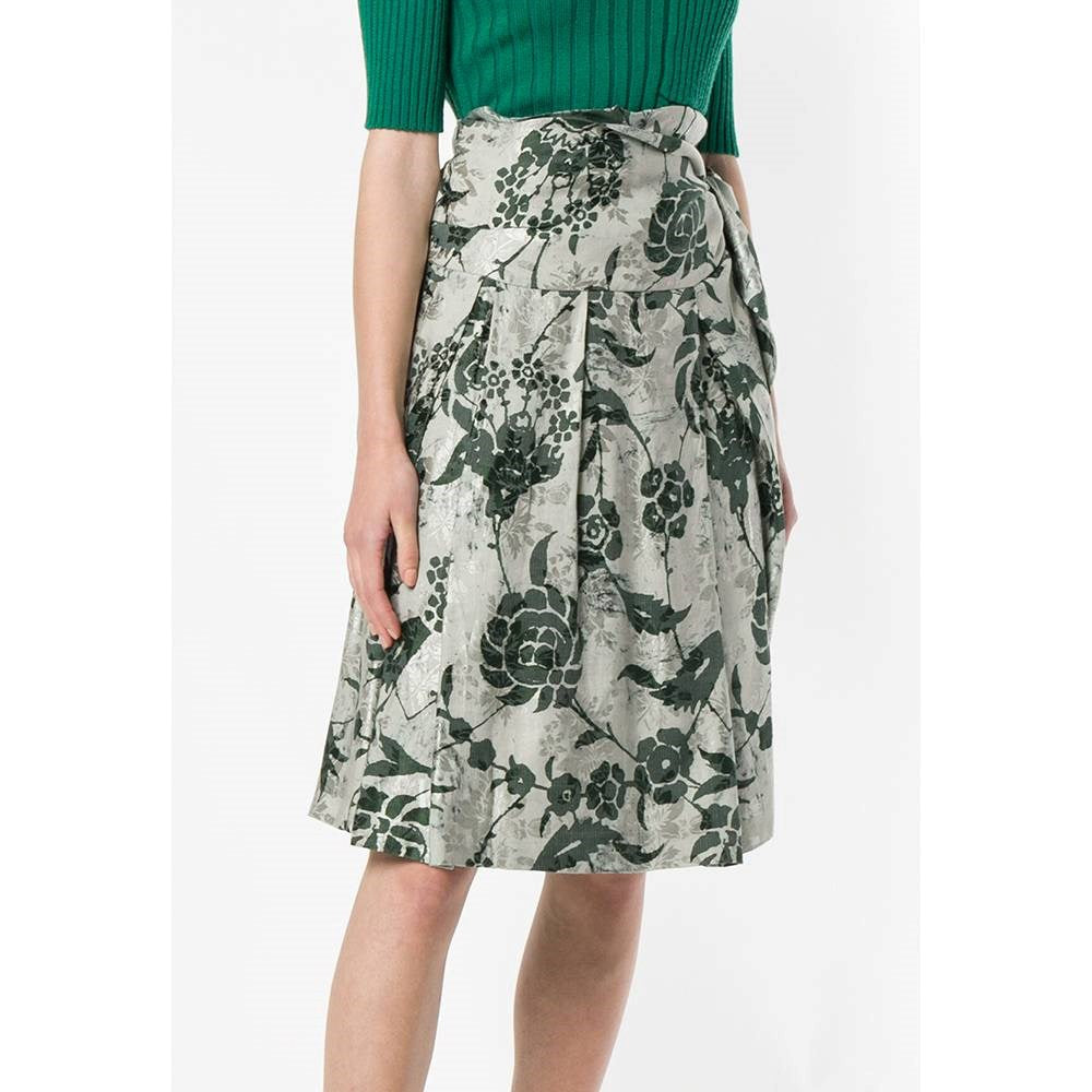 Dries Van Noten grey silk-cotton blend 90s wrap-around skirt with green floral print and pleated bottom.