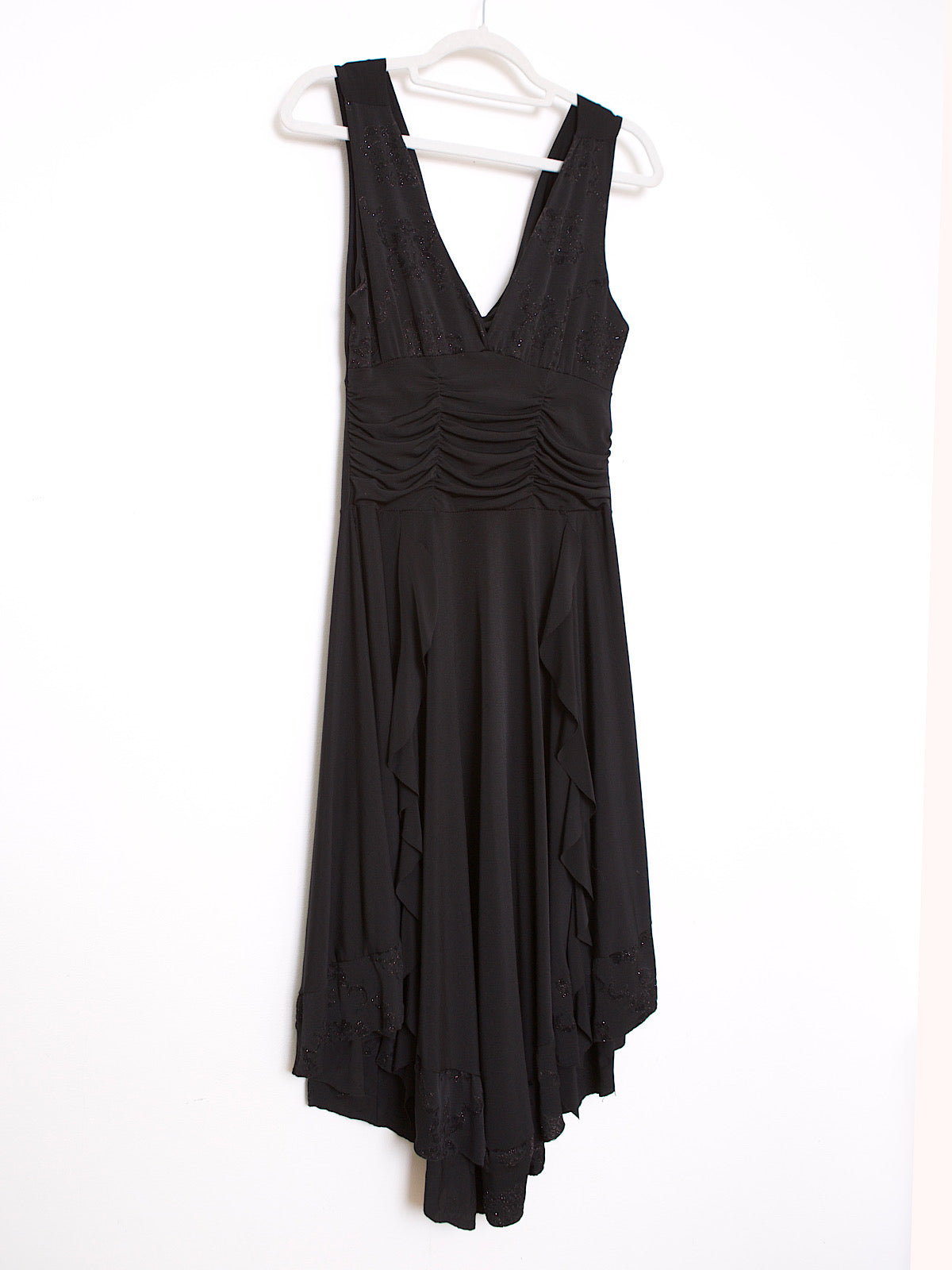 Ruffled around the waist, asymmetric hems and opened back.Discret glitter flowers around the dress.