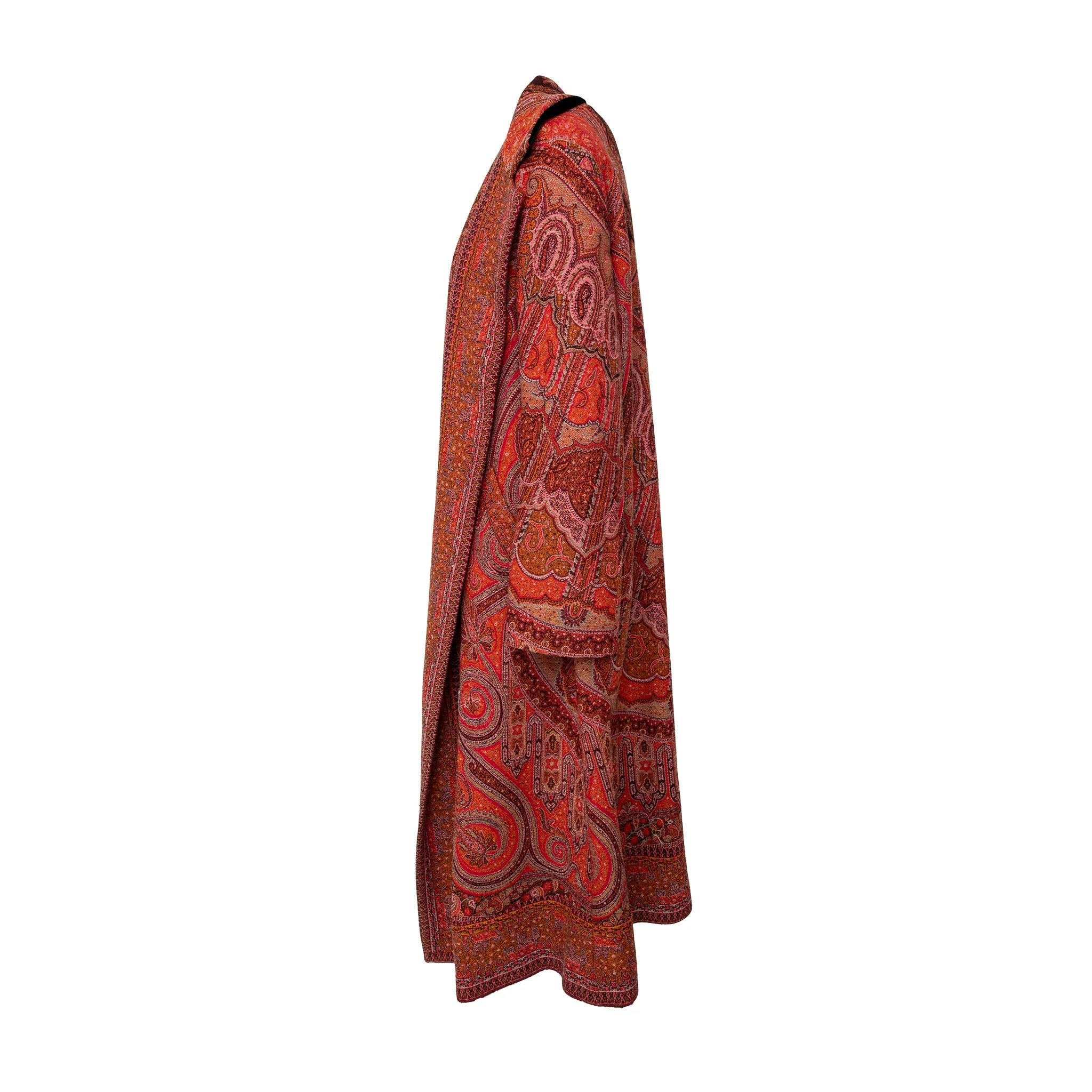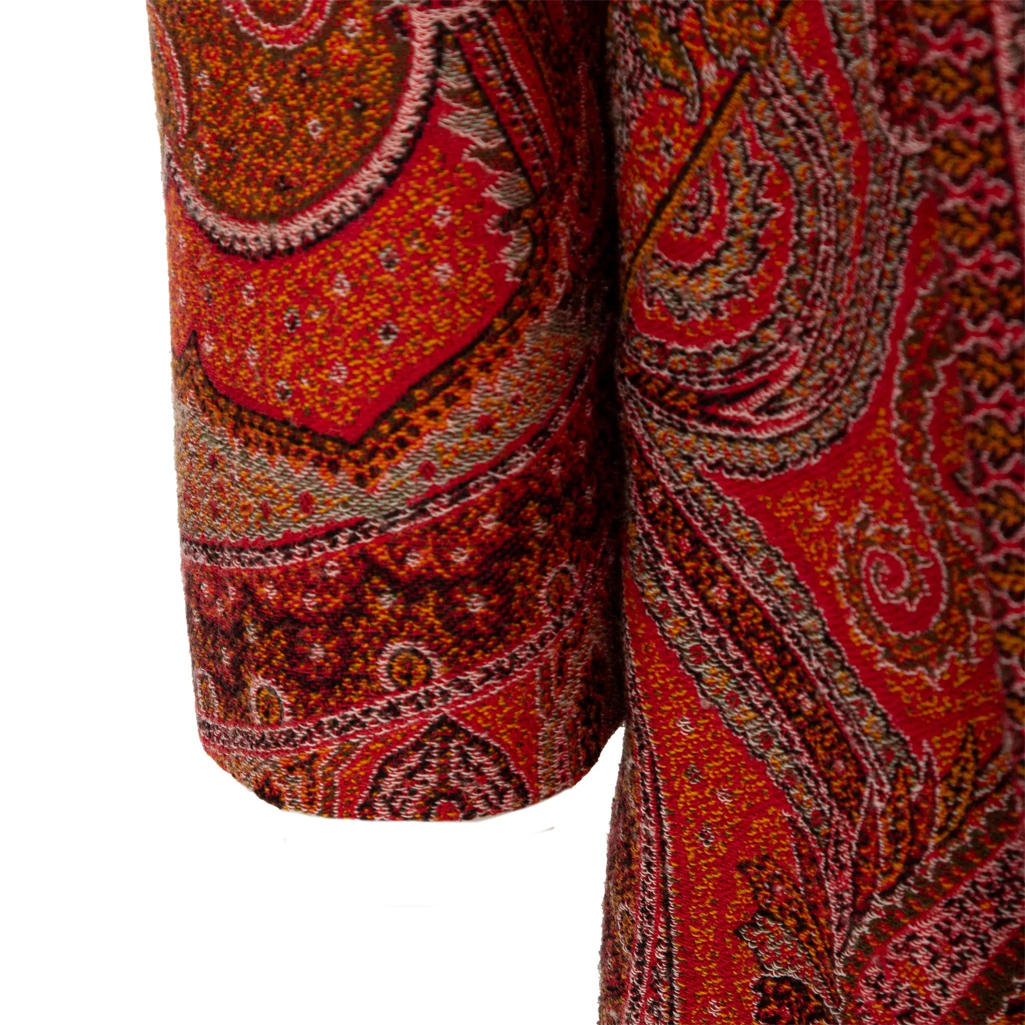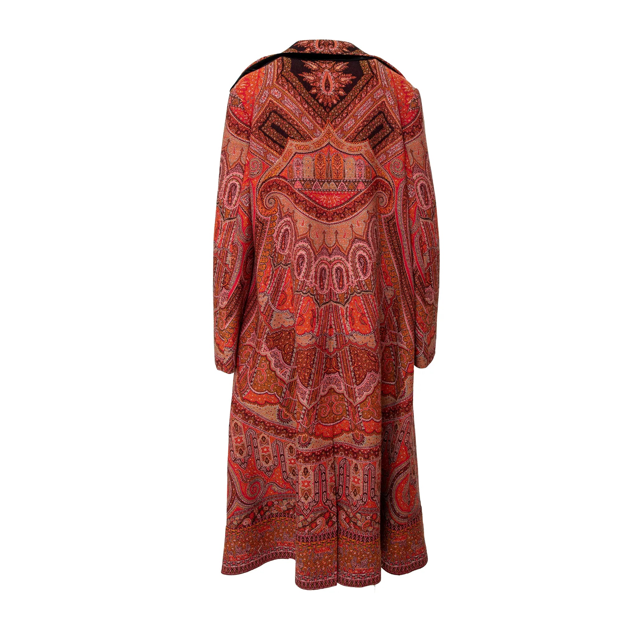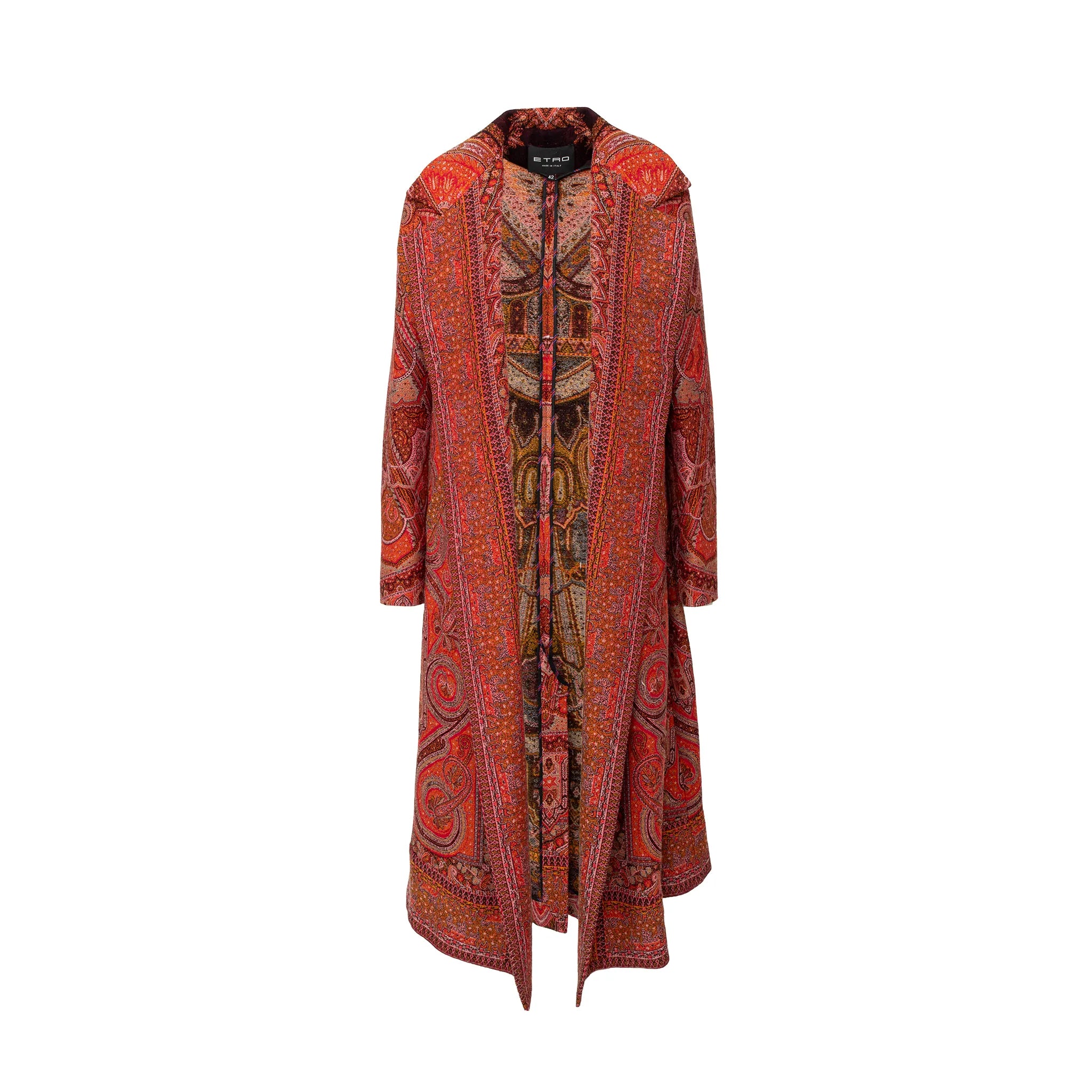 Etro Fall 2019 long wool coat in rich paisley print. Unlined with an open front and lapel collar, showcasing Etro’s signature bohemian elegance.