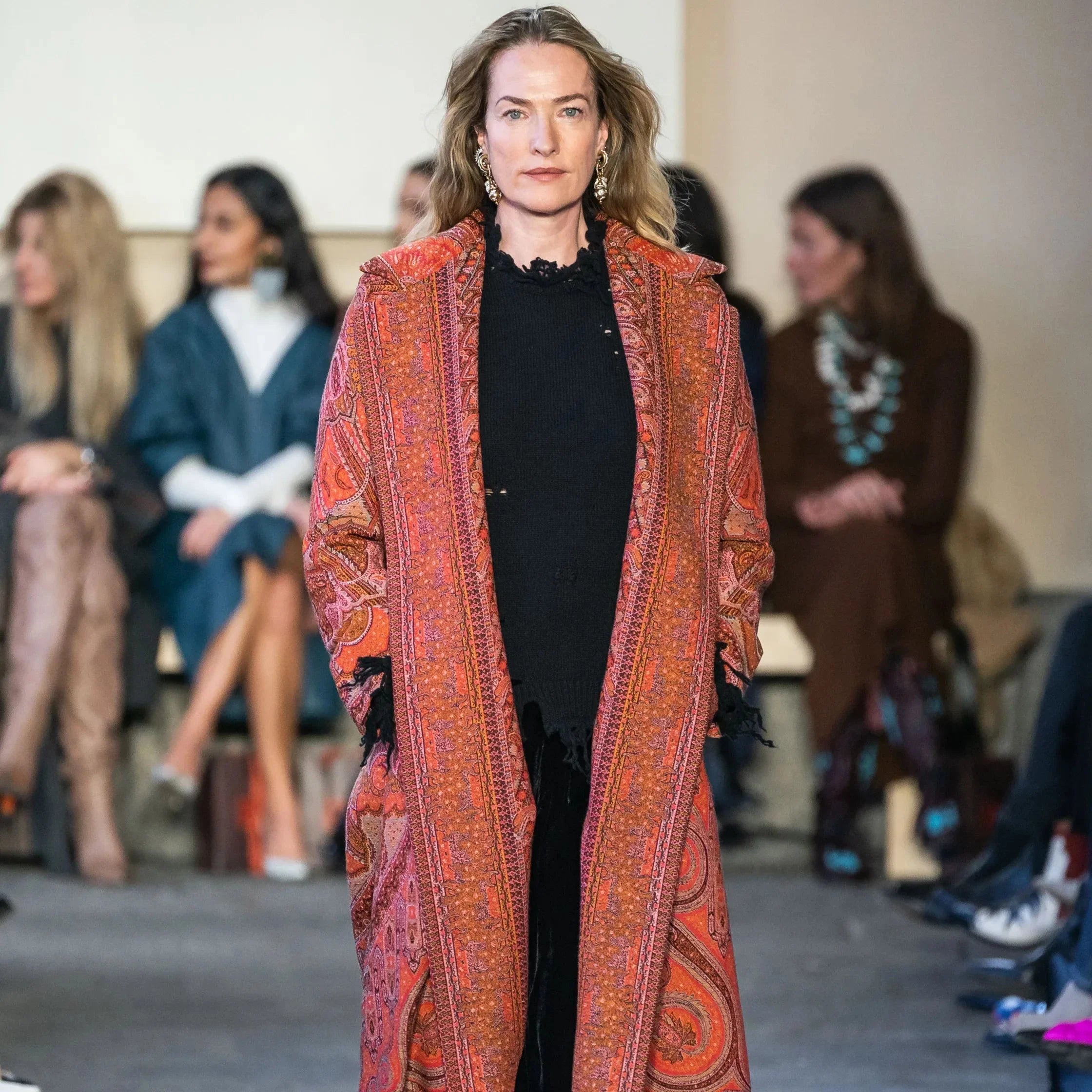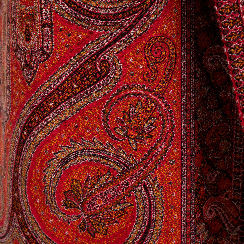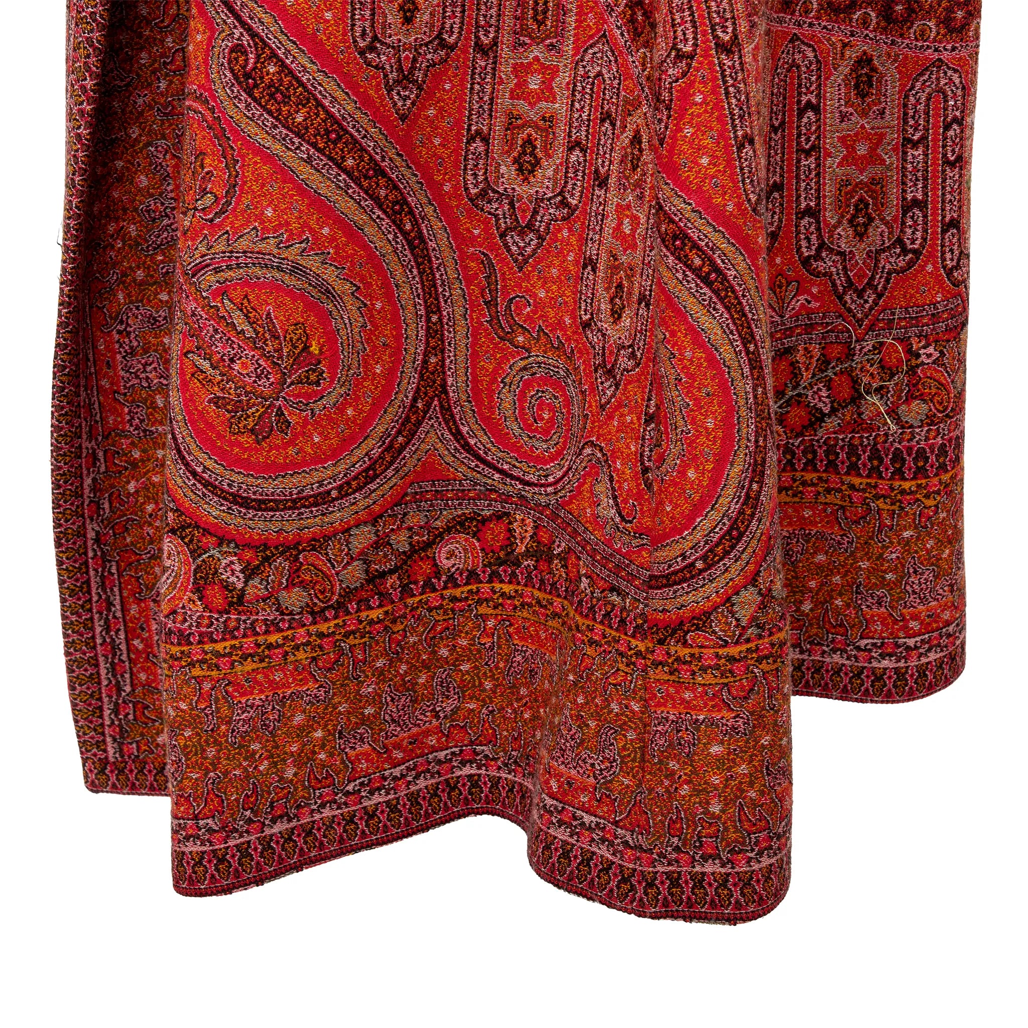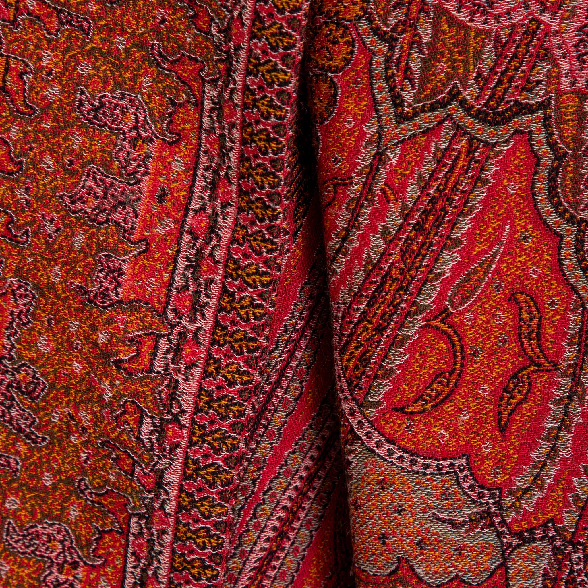 Etro Fall 2019 long wool coat in rich paisley print. Unlined with an open front and lapel collar, showcasing Etro’s signature bohemian elegance.