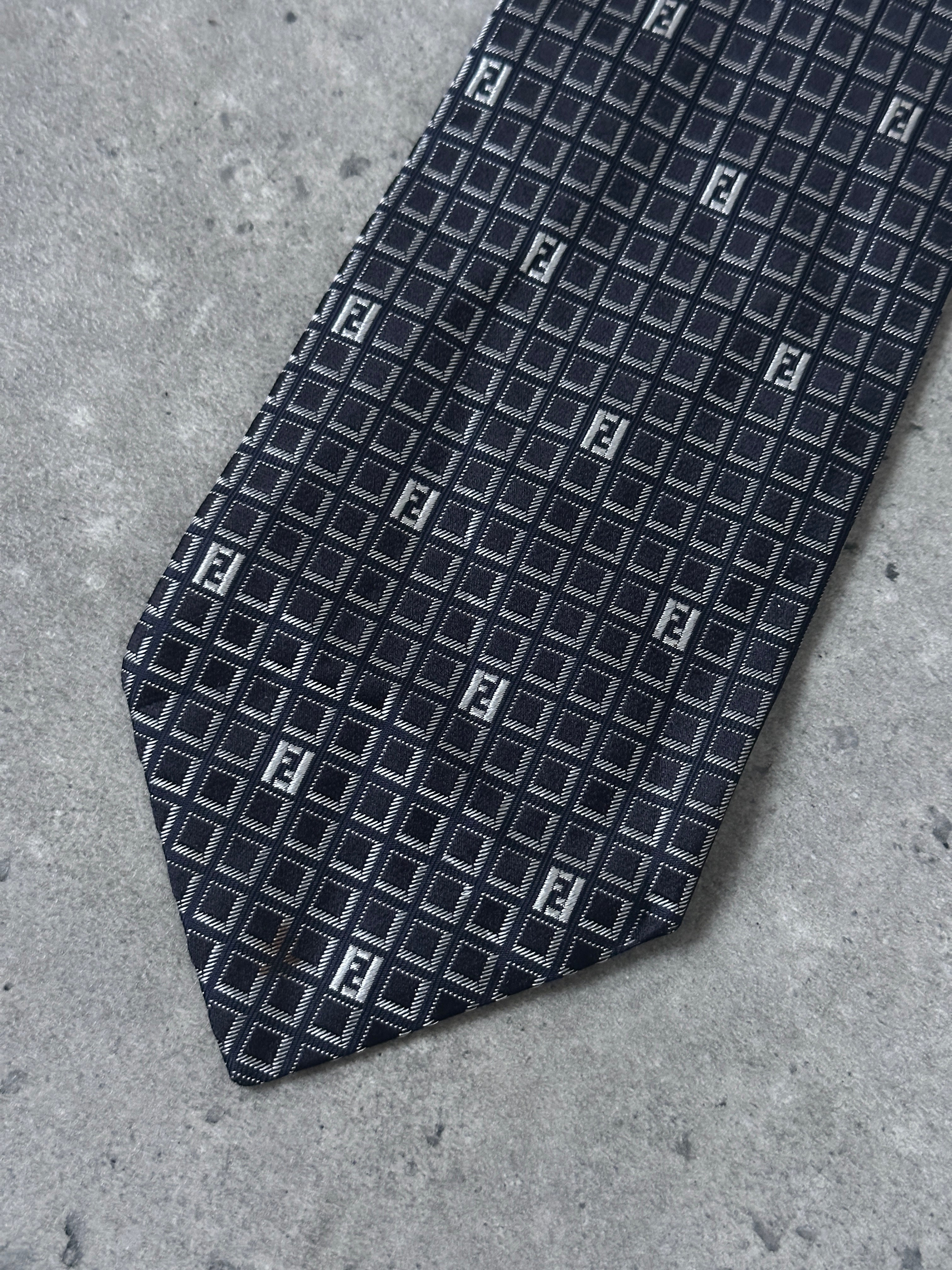 A refined vintage tie from Fendi Cravatte, crafted in Italy from pure silk and finished with an all-over geometric monogram pattern. The design balances classic tailoring with subtle branding, offering a polished accessory that elevates both formal and modern wardrobes. A timeless piece dating to the 1990s.