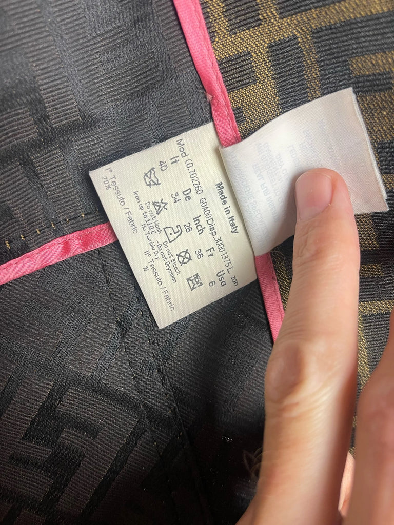 The design is tailored for a structured, feminine silhouette with meticulous panel stitching, a belted waist, and zip chest pocket detailing. Inside, the jacket reveals expert craftsmanship with pink seam binding and the original Fendi label and care tags intact.