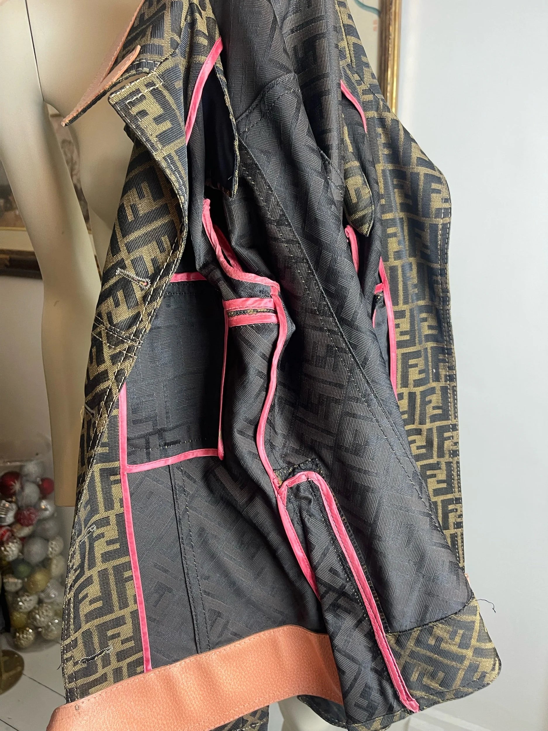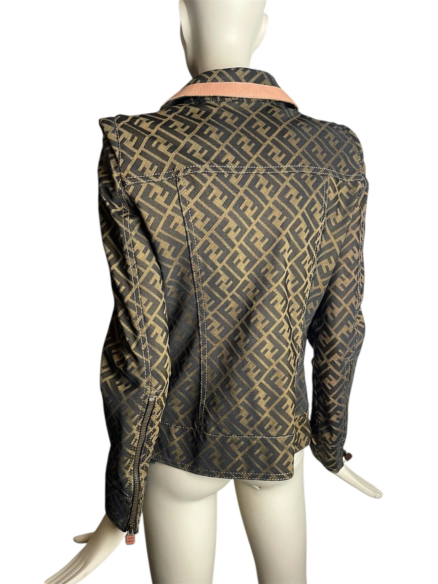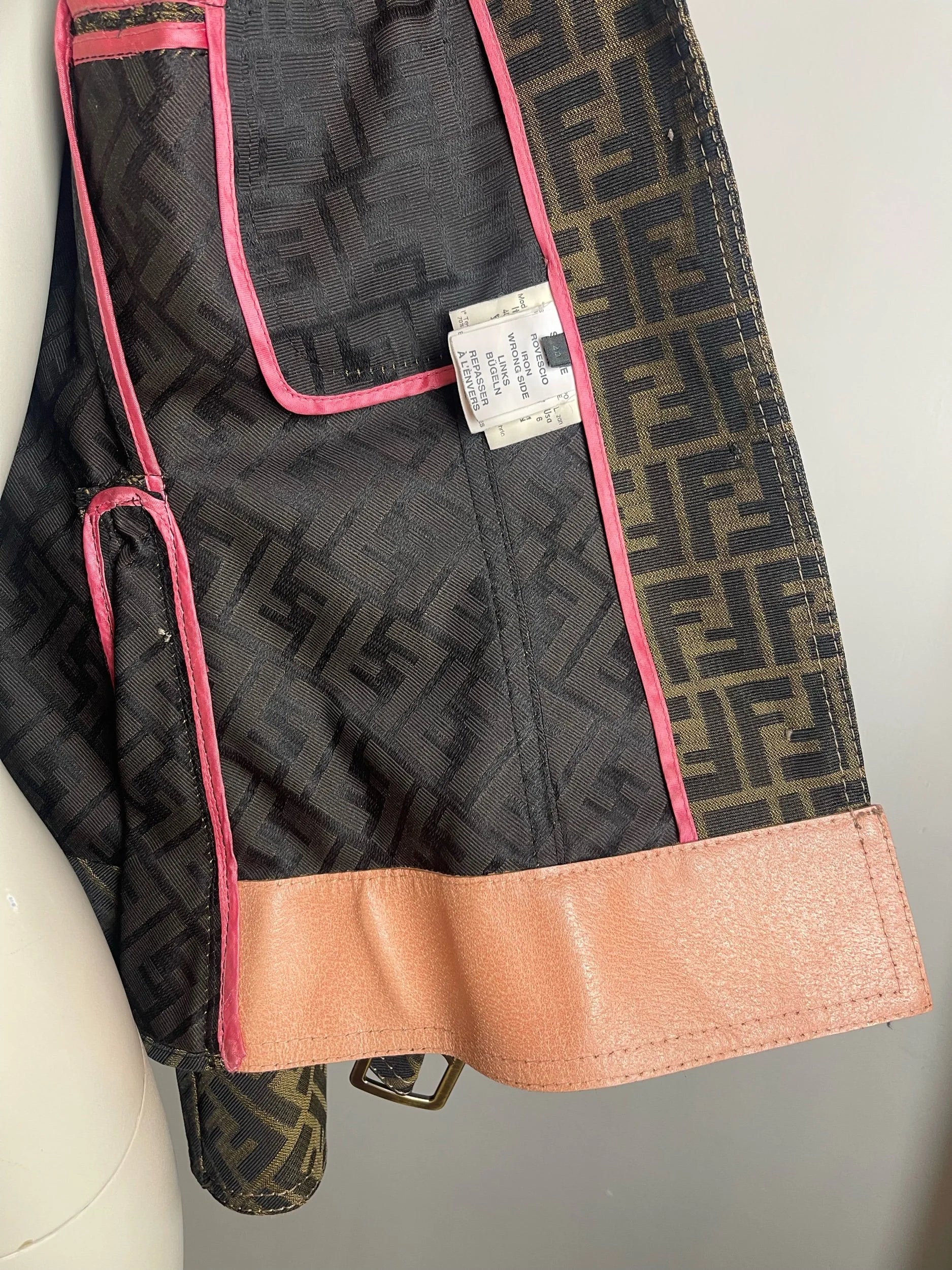 A rare and iconic piece from Fendi’s early 2000s Logomania era, as featured in Vogue, this jacket perfectly captures the bold, statement-making aesthetic of the time. Crafted in Italy, it features Fendi’s signature Zucca monogram canvas in brown and black with contrast pink leather collar and trim details.
