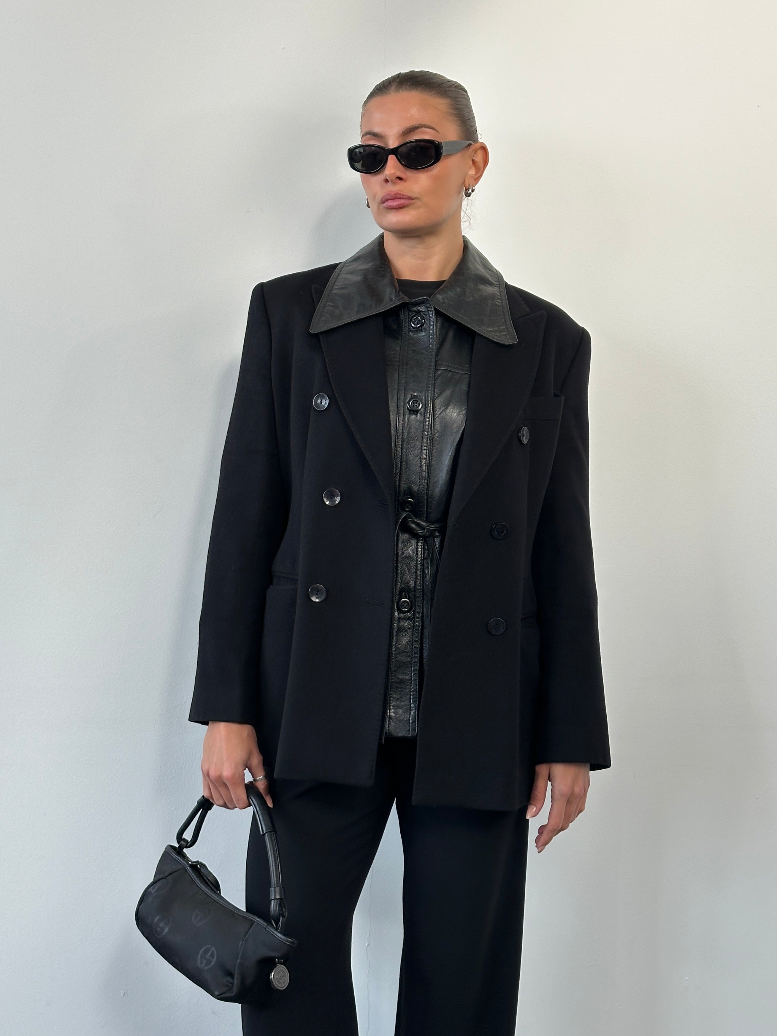 A sharply tailored Gianfranco Ferré Studio blazer crafted in Italy from a brushed wool and cashmere blend with a structured double breasted front. Finished with branded logo buttons and a clean architectural silhouette, this piece reflects Ferré’s refined 1990s tailoring language.