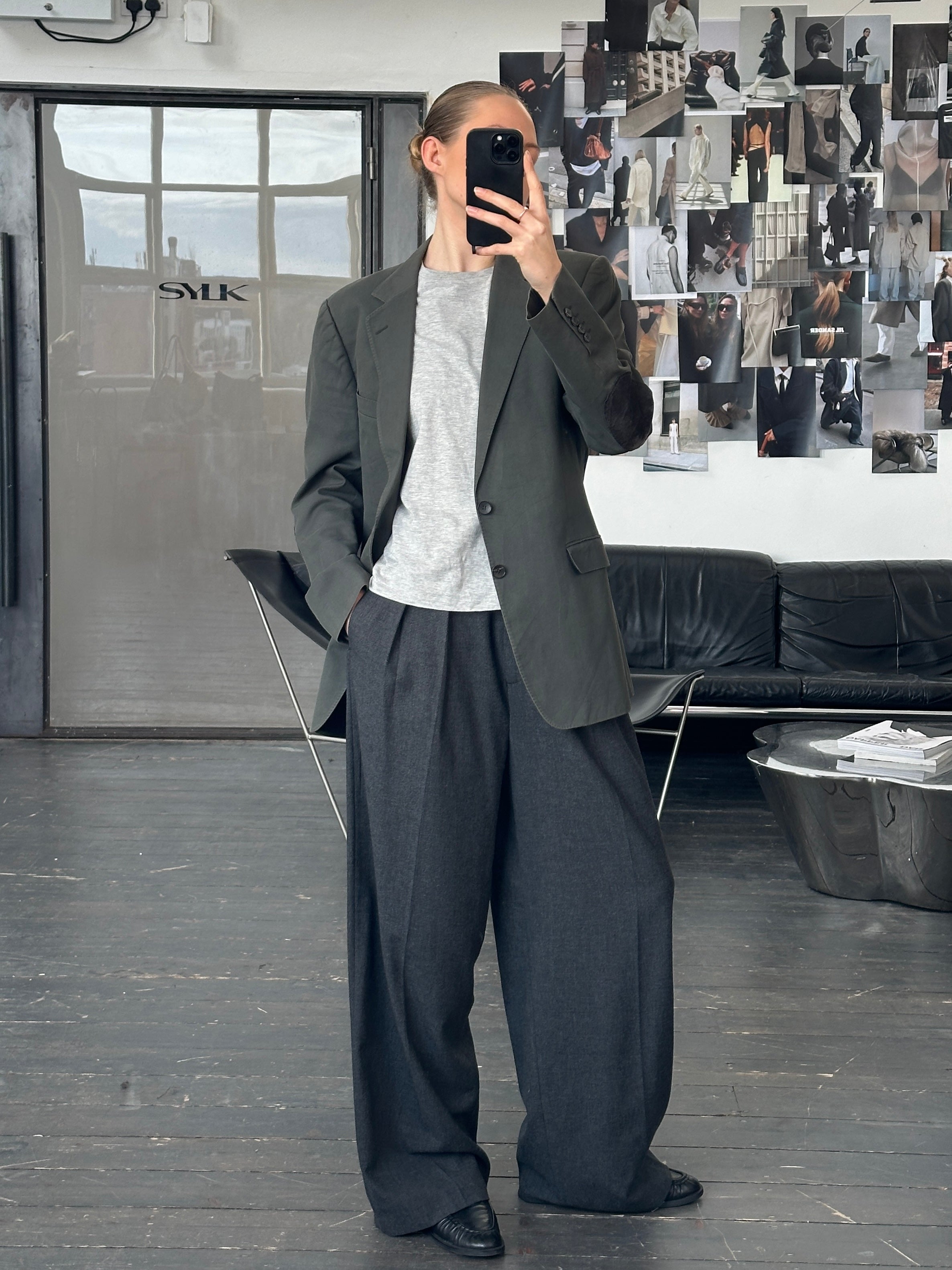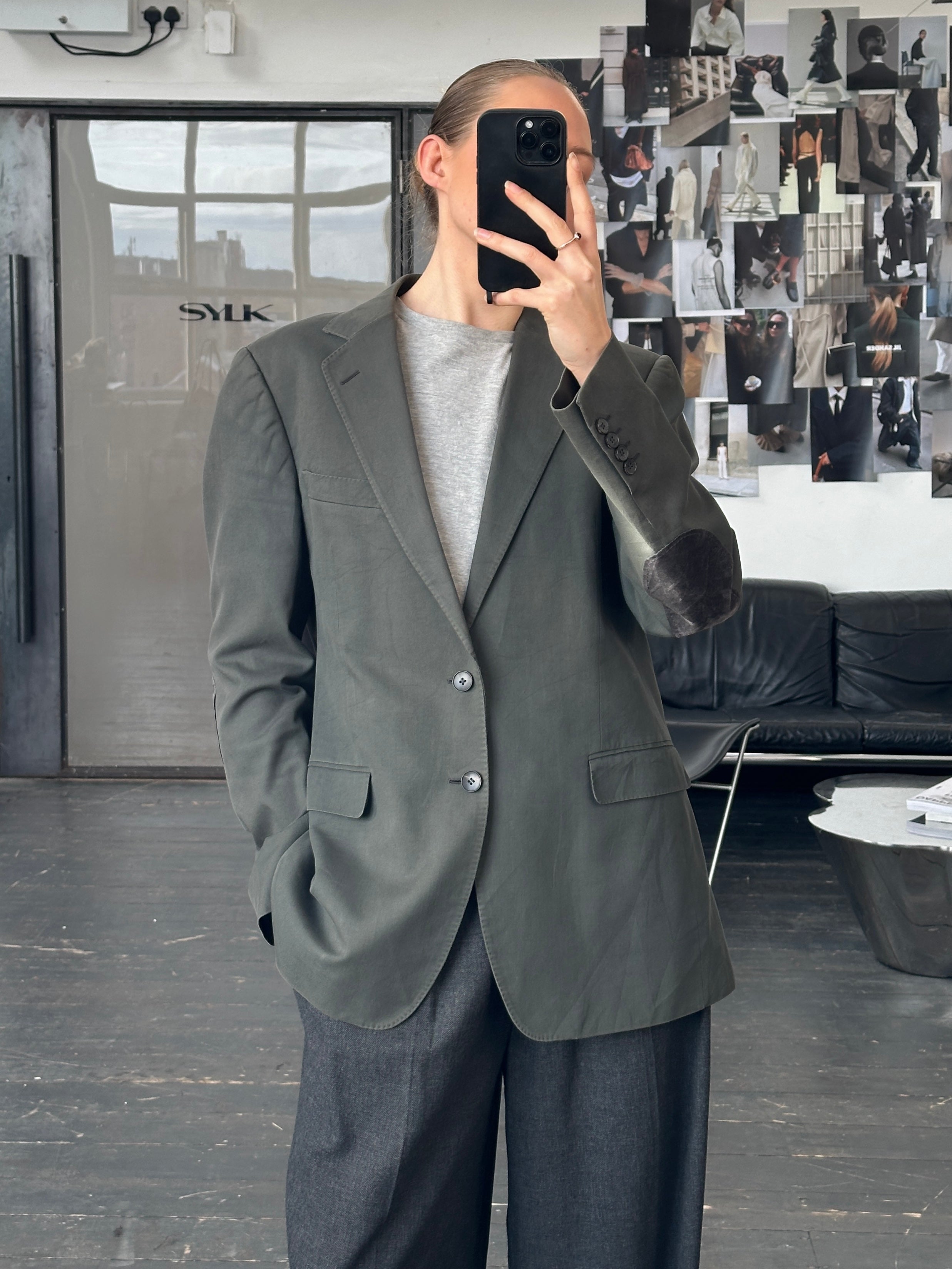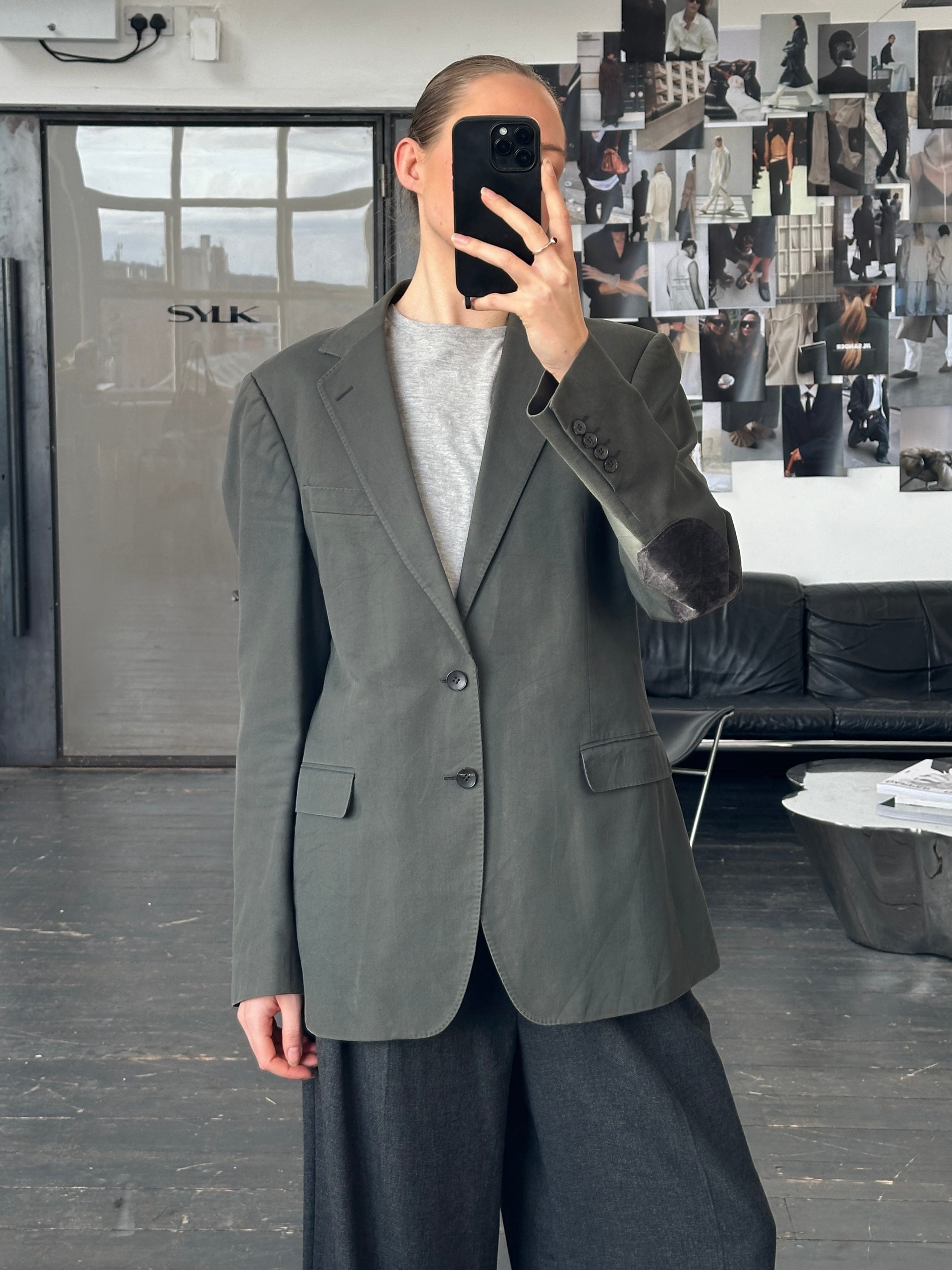 Gucci single breasted blazer with a pure cotton outer and reinforced elbow patches. Clean tailored silhouette typical of the 2000s.