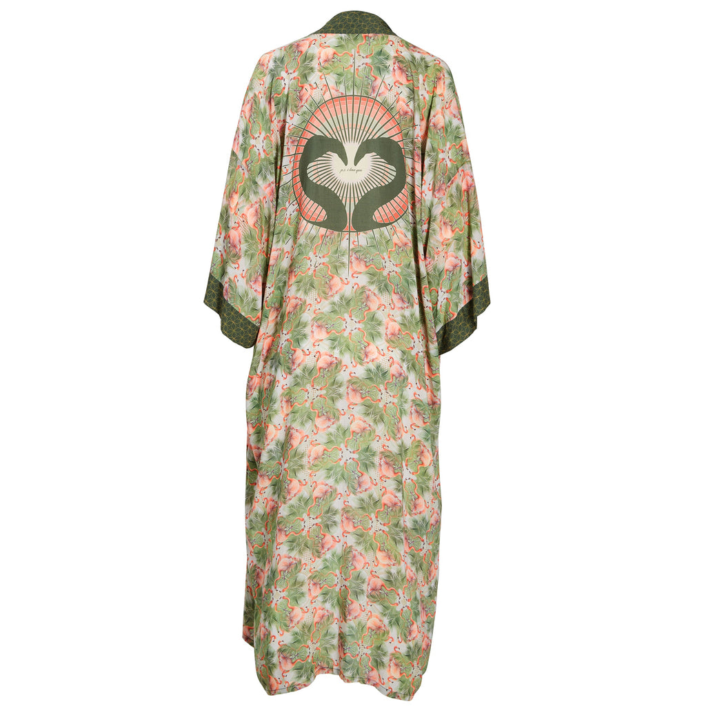Palm Springs lovers! Here's your ultimate robe! Flamingo and palm print with mid century pattern and trim! PS I love you! So versatile, wear as a robe, swim cover or kimono jacket. Pink, green, khaki