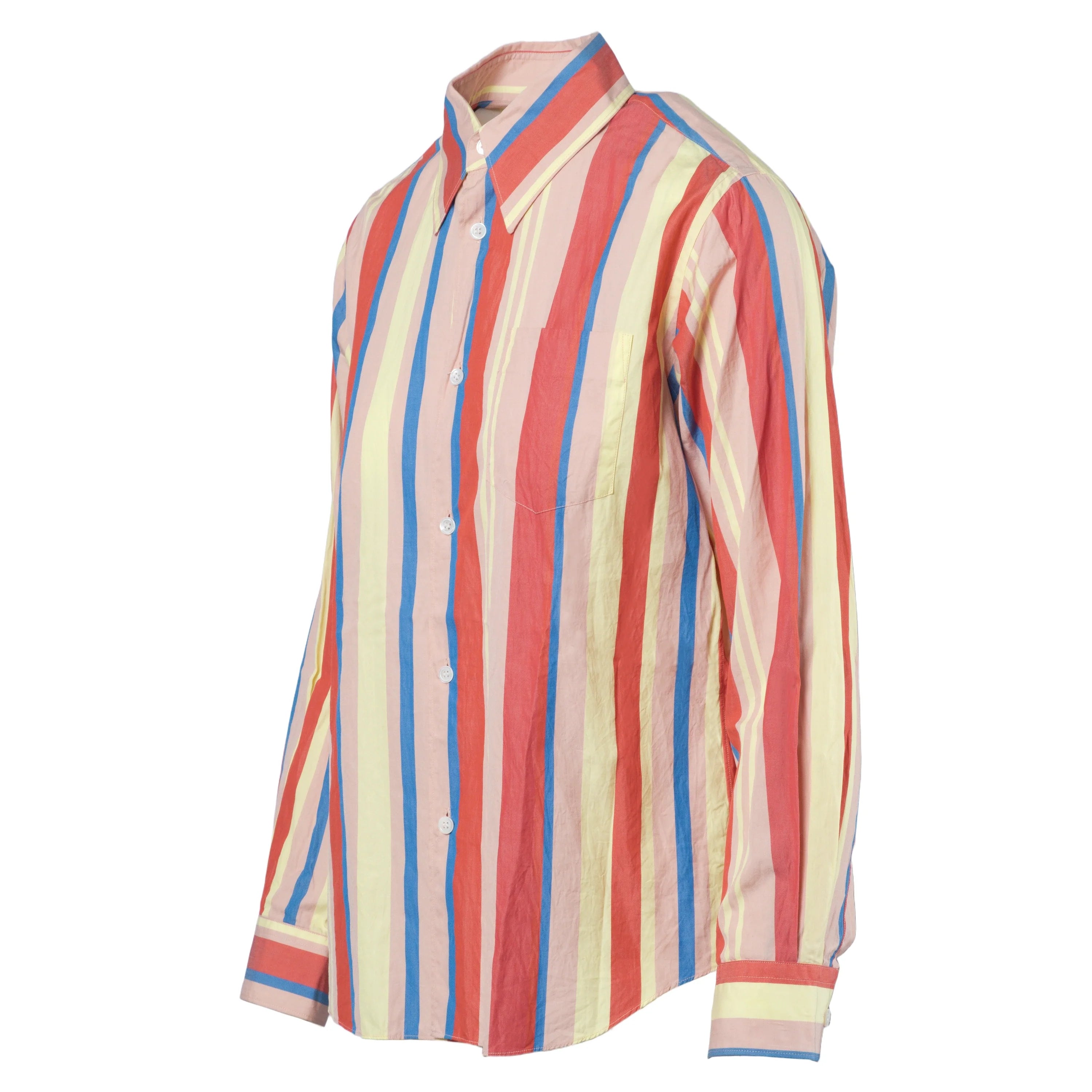 This cotton shirt with colorful stripes by Junya Watanabe Comme des Garçons combines distinctive style and high-quality materials. The soft, breathable cotton ensures all-day comfort, while the multicolored stripes create a dynamic and playful effect.