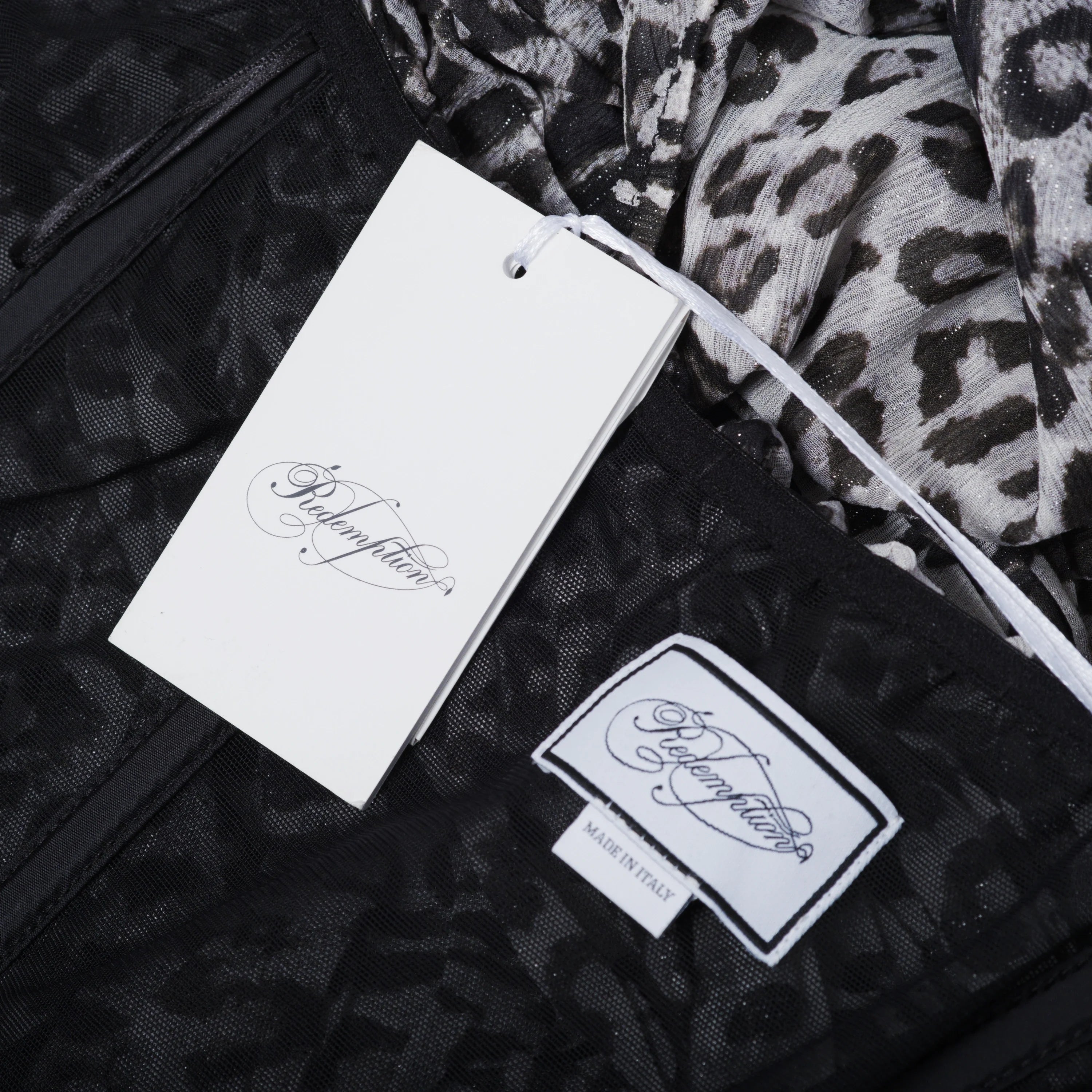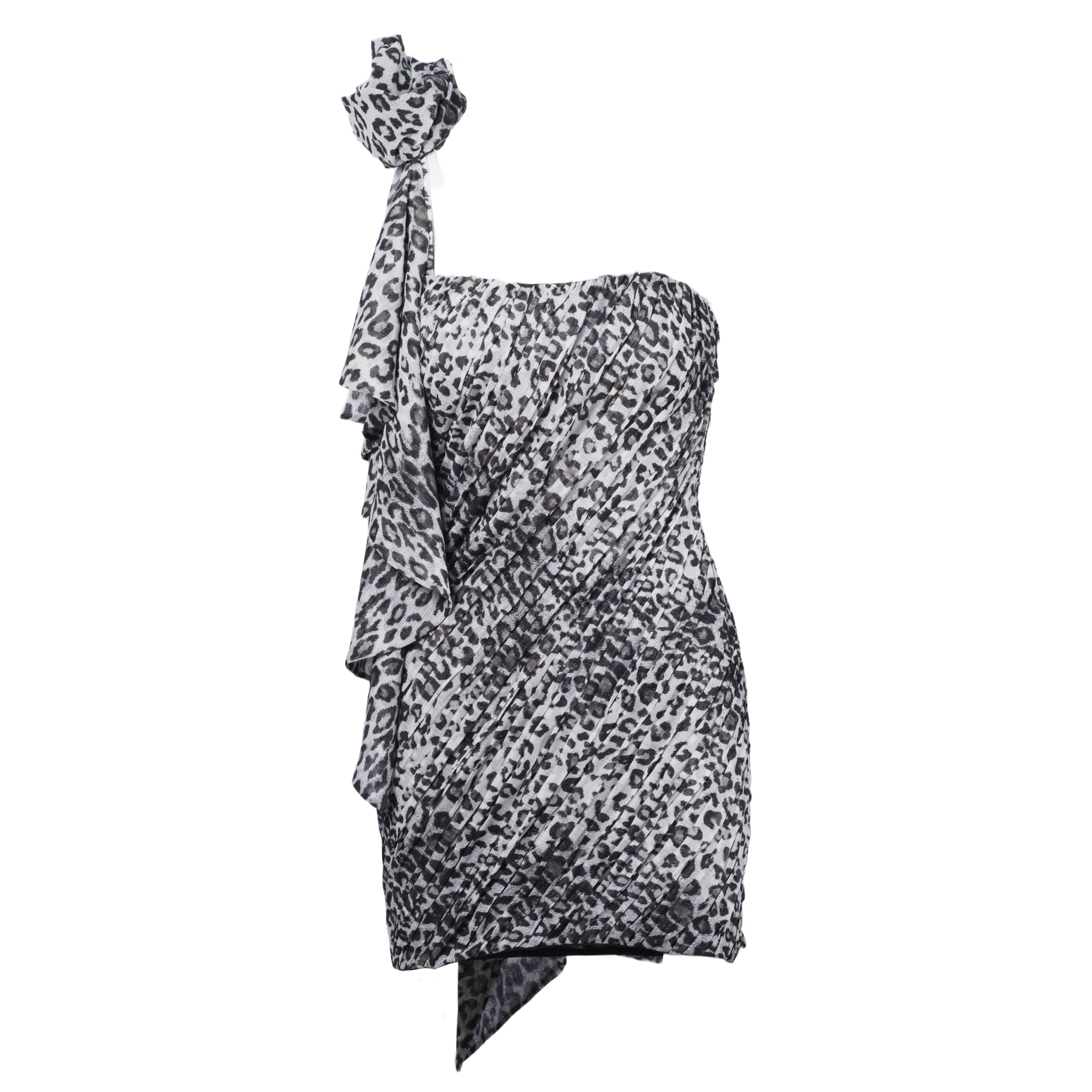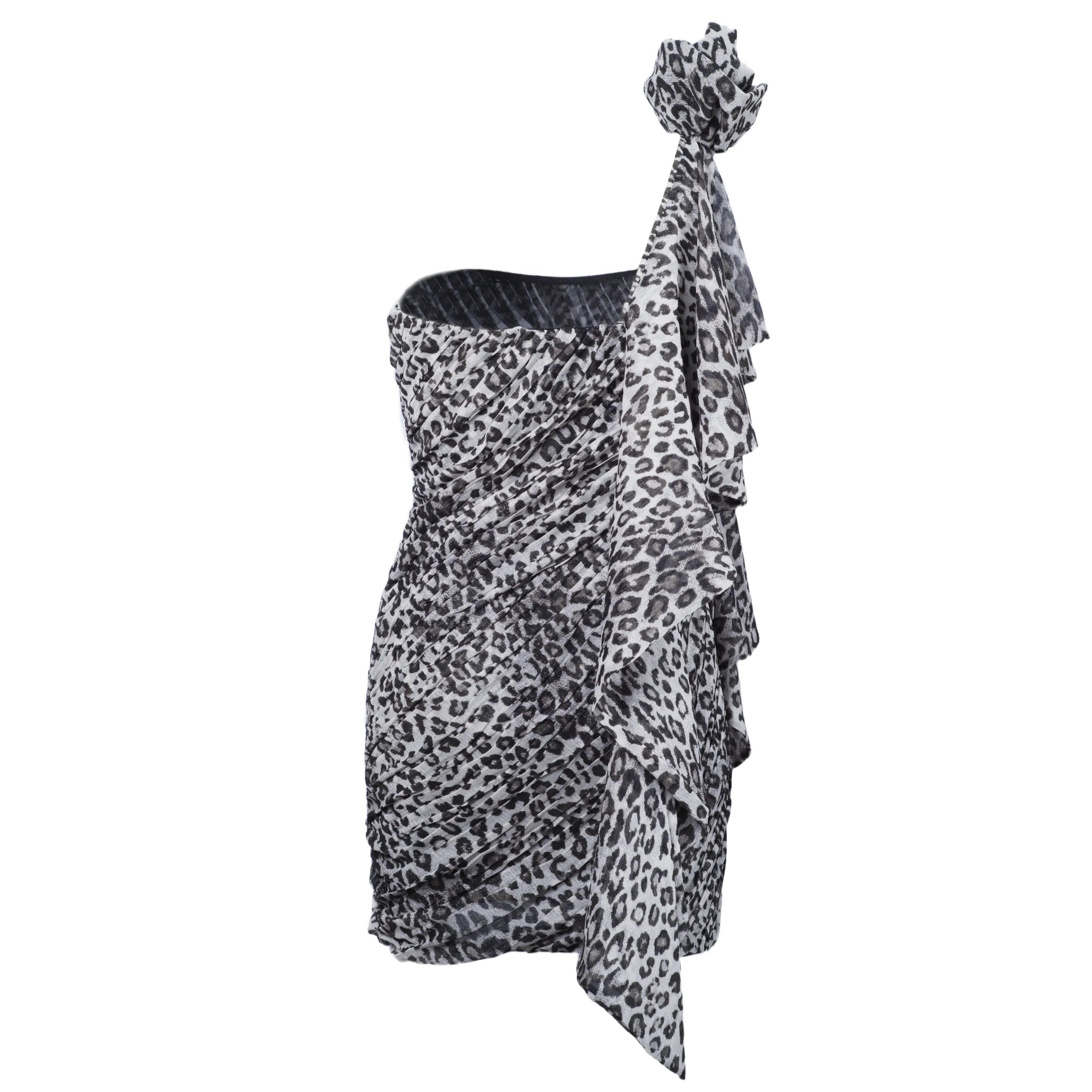 The Redemption gray leopard-print cocktail dress strikes the perfect balance between elegance and boldness. Crafted from high-quality fabric and featuring a black lining, this dress flatters the silhouette with refined draping and a modern, sophisticated one-shoulder design. The gray leopard pattern adds a striking character, making the dress perfect for standing out at any special occasion.