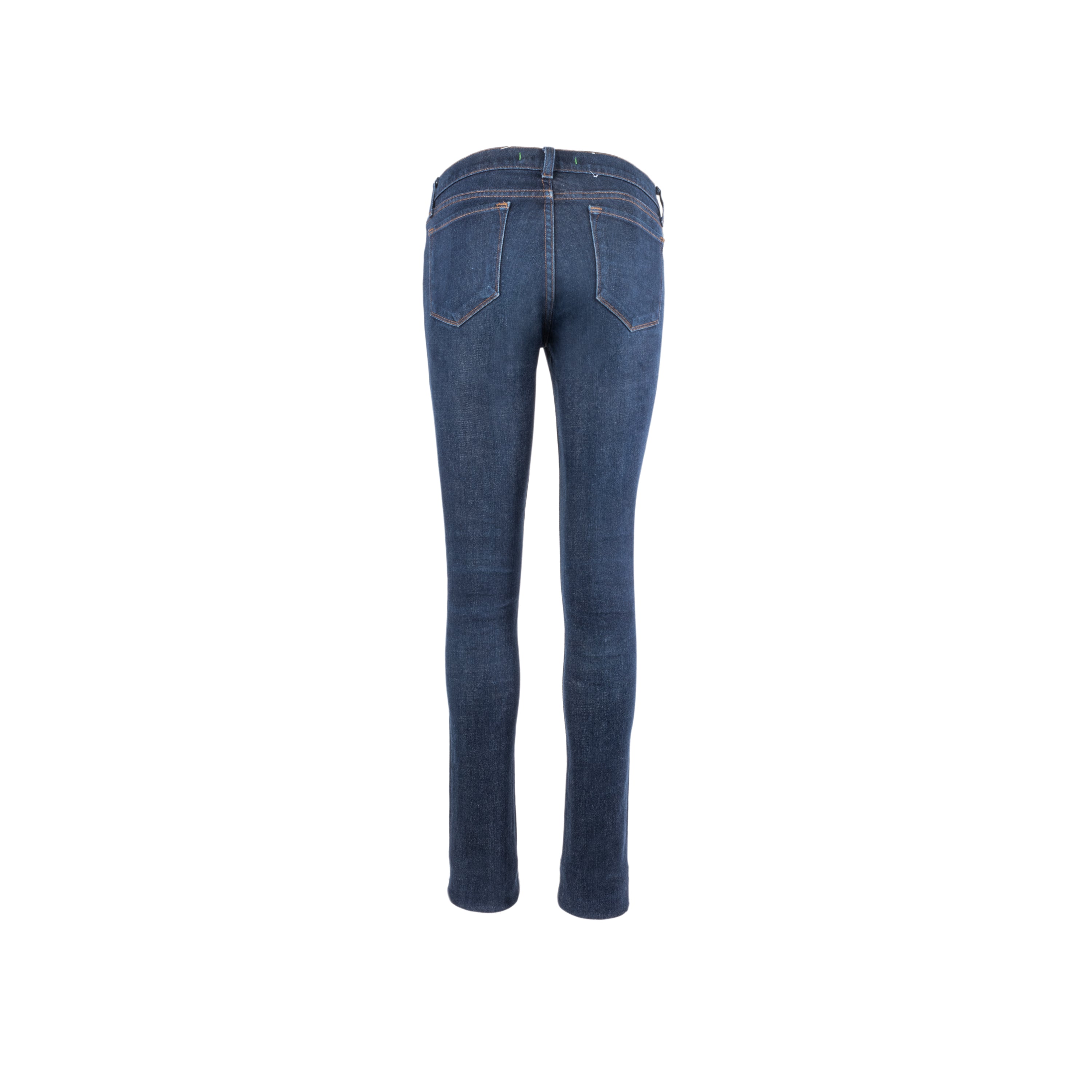 J Brand skinny jeans from 2010s in dark denim material, a classic full-length jeans with contrast yellow stitch detail, and back pockets. Ideal for daily usage.