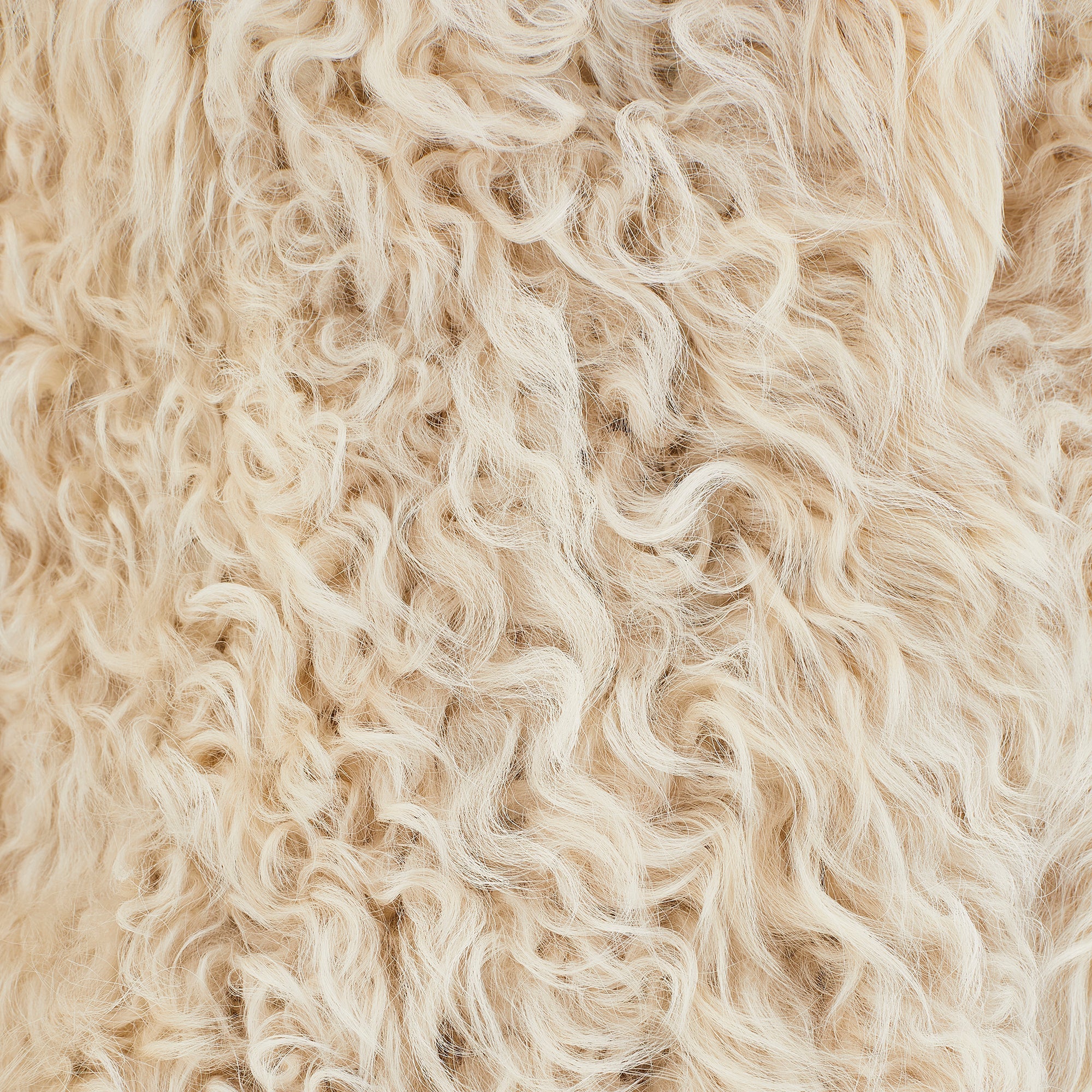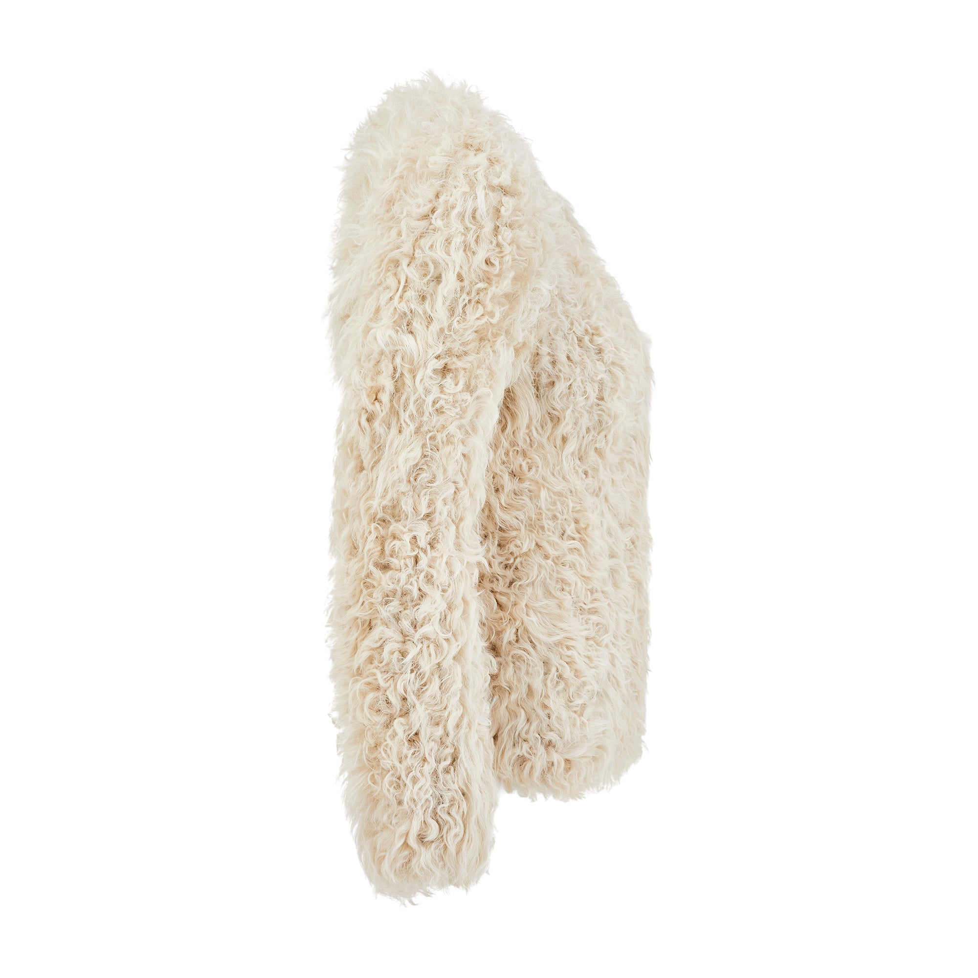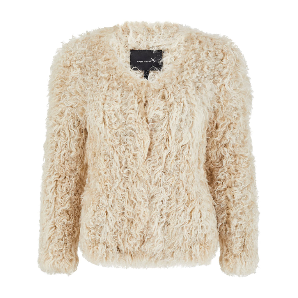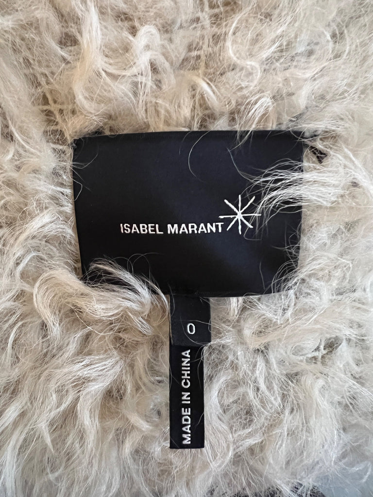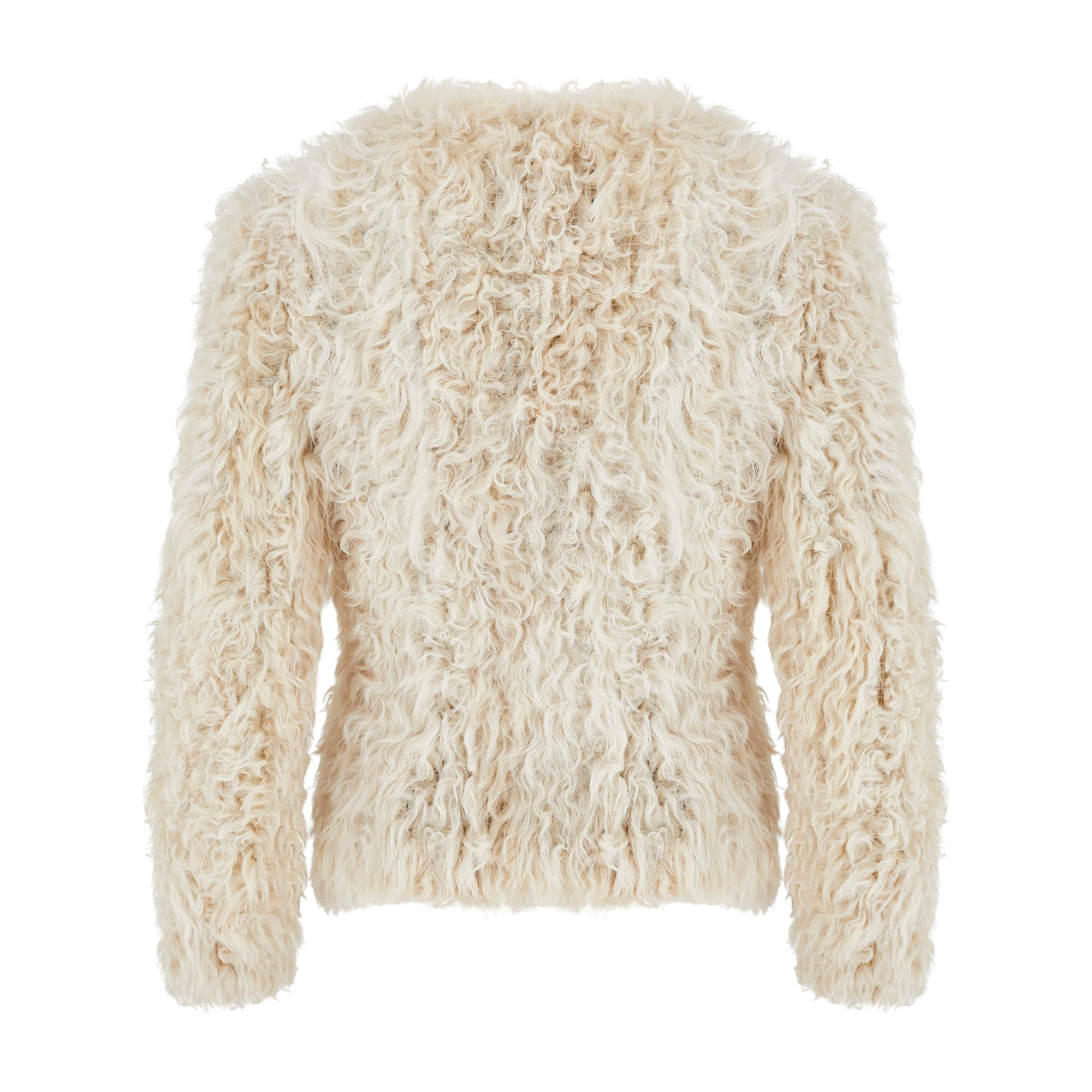 This jacket was designed by Isabel Marant for the Fall 2014 collection. Created during a period when the brand was much-sought after, these fur jackets became an It-piece and was photographed on stylists and celebrities including actor and boho-darling Sienna Miller. Crafted from natural Mongolian lamb fur, the texture is dramatic and fluffy with a super-soft, textured handle. The fur is woven onto both sides of a cream net lining therefore the inside is also lined with fur, making the jacket a relatively lightweight but very cosy wear. It has long sleeves and boxy tailoring across the body. The front fastens with hidden cream hook-and-eye clasps The neckline is rounded in the style of a classic cardigan.