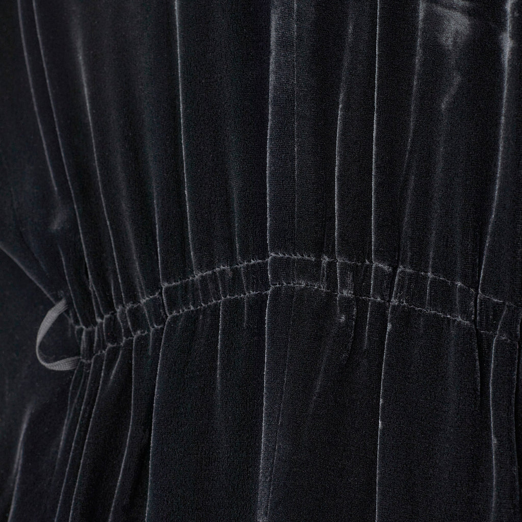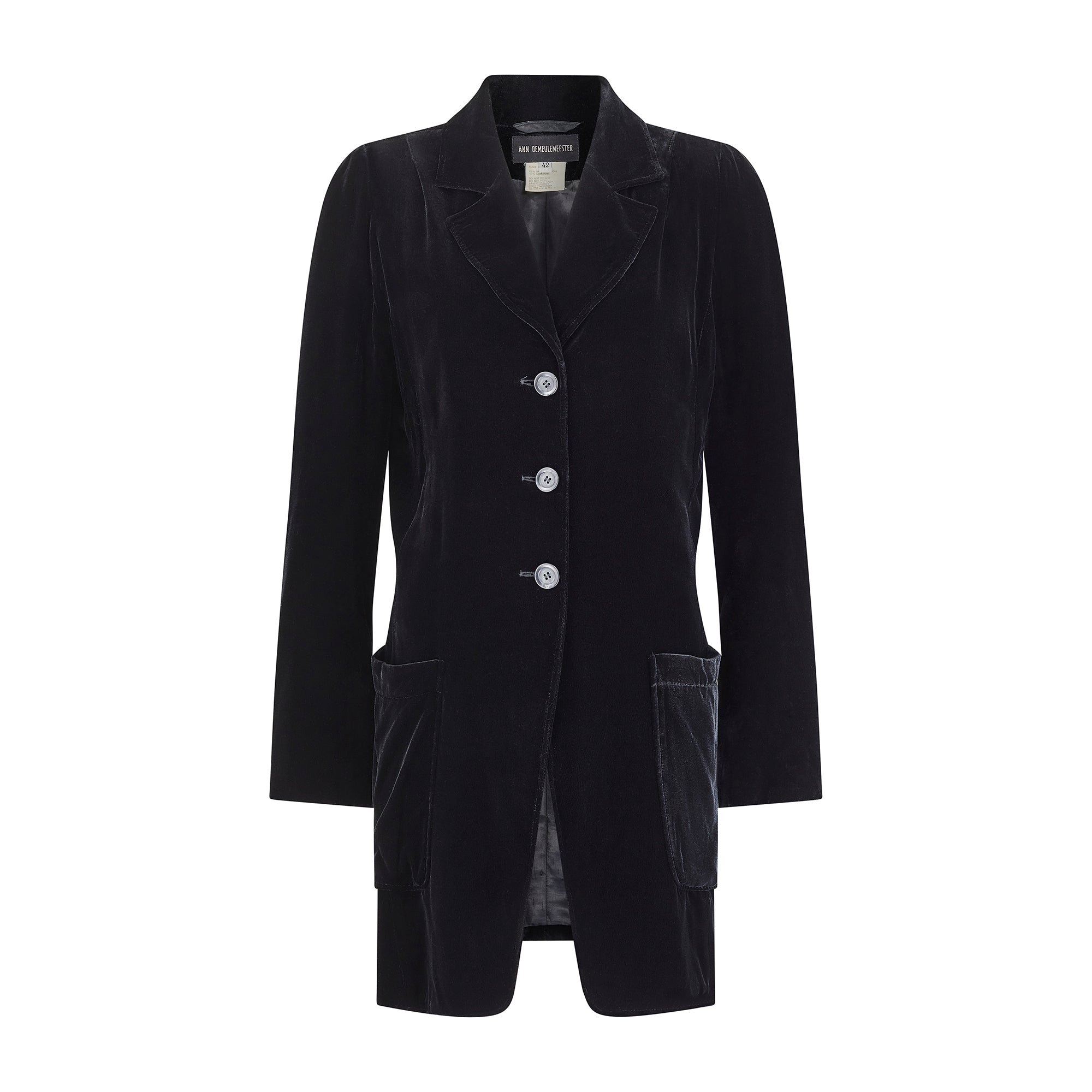 This early 1990s soft silk-velvet jacket hints at the minimalist, gothic style that Demeulemeester became known for. Tailored to a long-line silhouette, it is single-breasted and is secured with three grey-black plastic buttons. It is only softly structured, with relaxed loose sleeves and a laid-back, slim body. There are two patch pockets at the hips. At the back, the waist is pulled in and ruched to create a slightly more feminine shape. This jacket is fully lined with black satin.