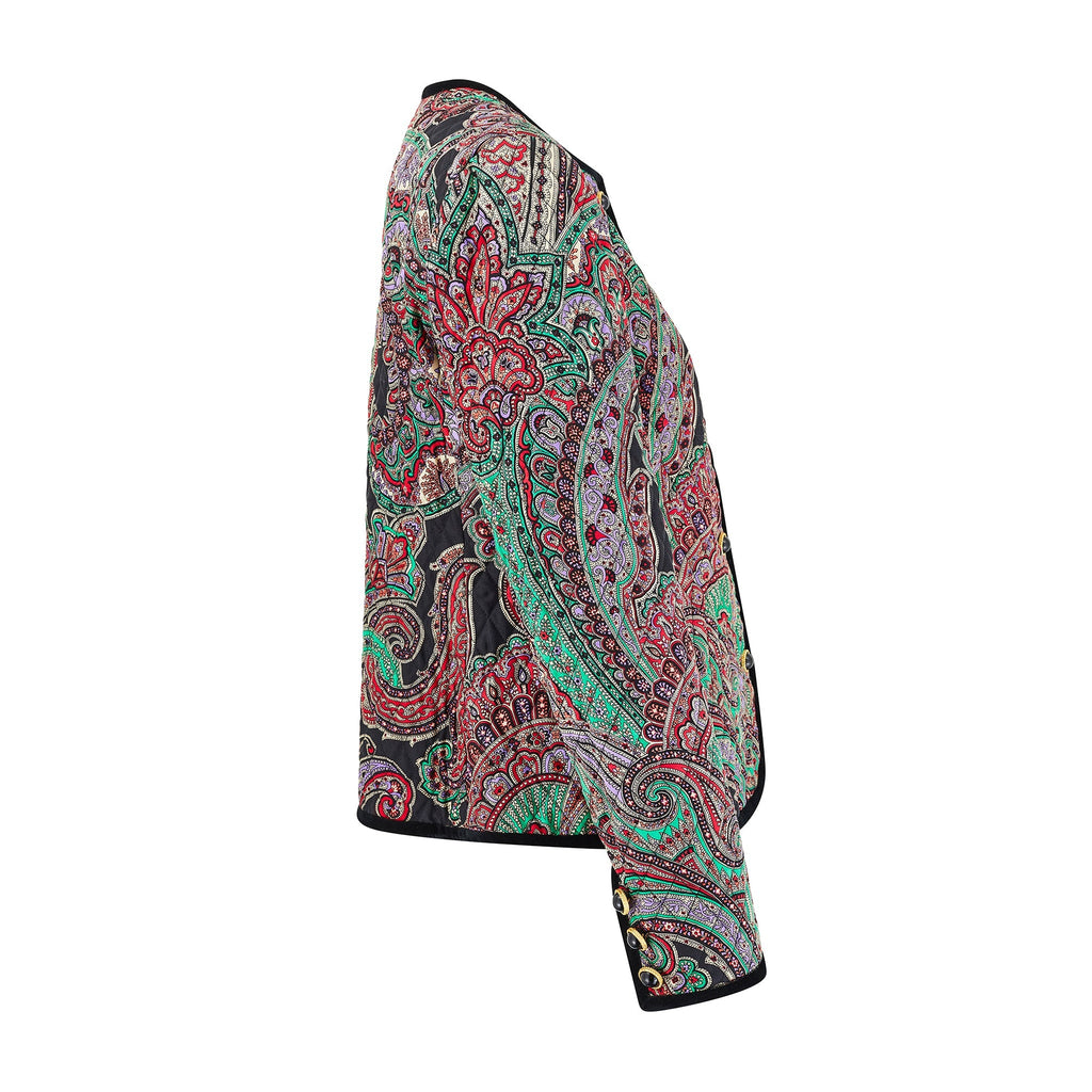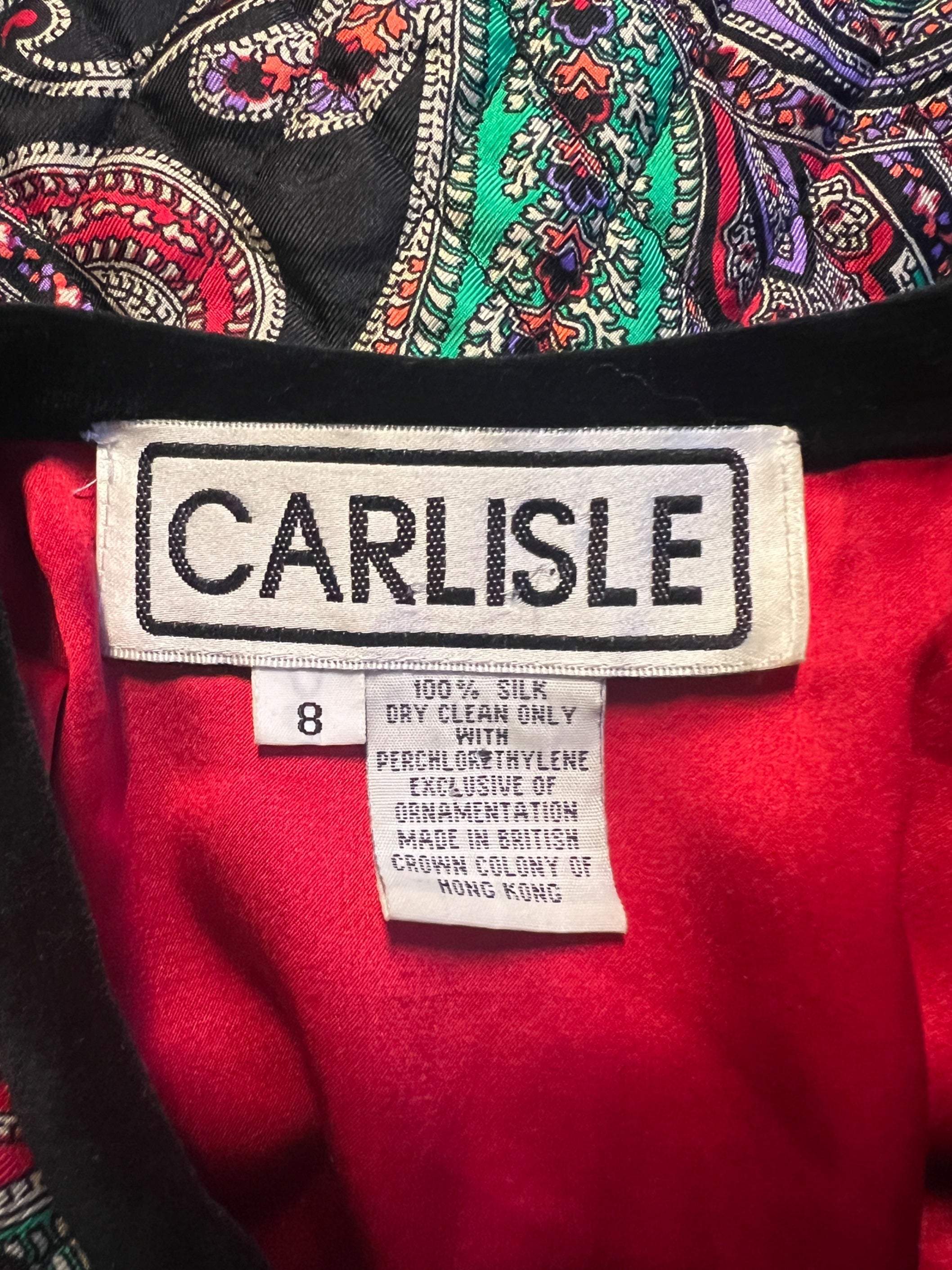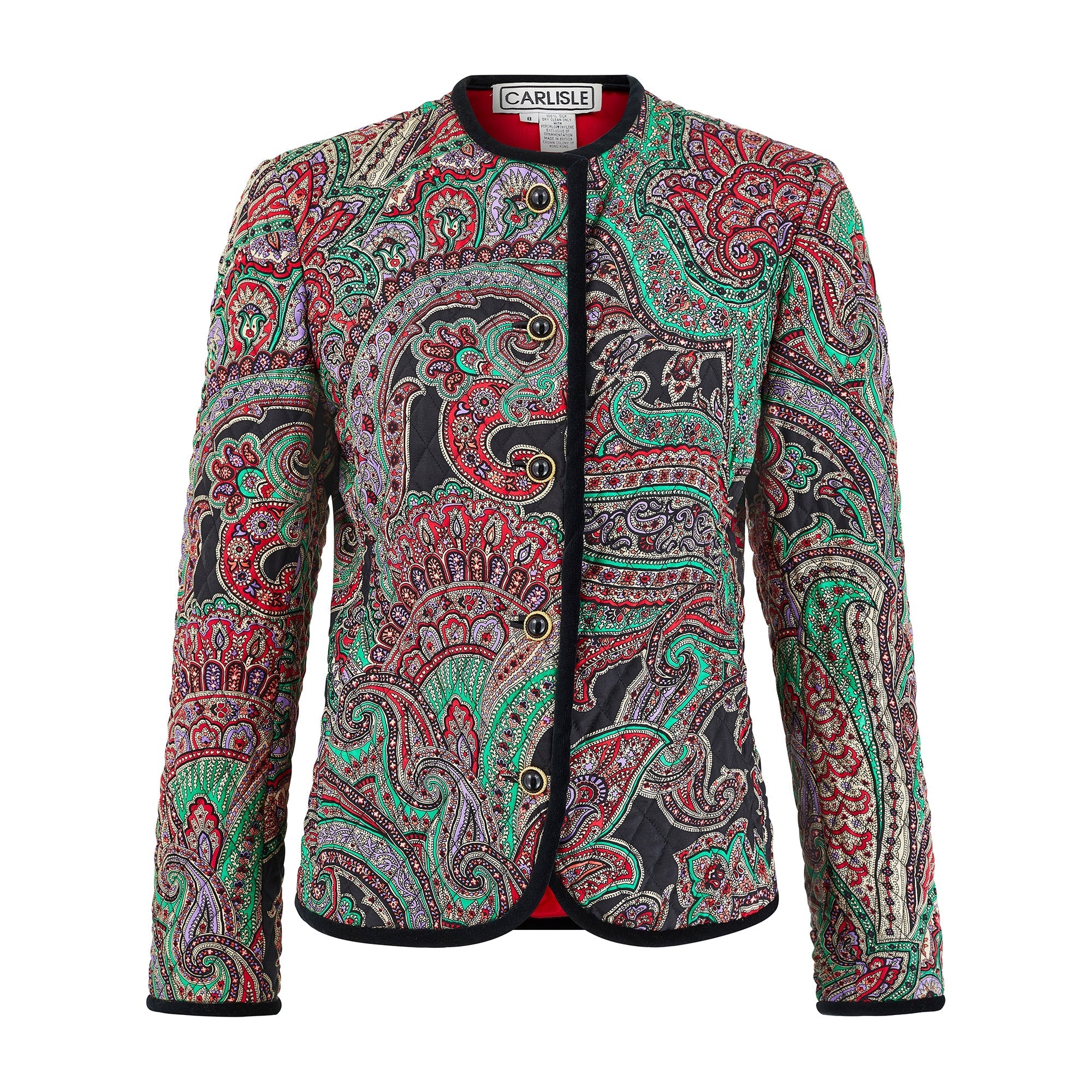 This vibrant 1990s vintage jacket by Carlisle is crafted from printed silk finished with black threaded quilting all-over. Superbly made, the print is an intricate paisley drawn in black outlines with emerald green, lilac, red, coral and palest grey detailing. The jacket is trimmed with thick black velvet around the neckline, down the front, around the bottom hem and at the cuffs. It is secured at the front with five decadent gold and black buttons and a hidden tonal black snap closure at the neck. The split cuffs are also finished with three of these pretty buttons. This beautiful jacket is lined with crimson red silk. The label reads, “Made in British Crown Colony of Hong Kong”; an area known for its exceptional garment making.