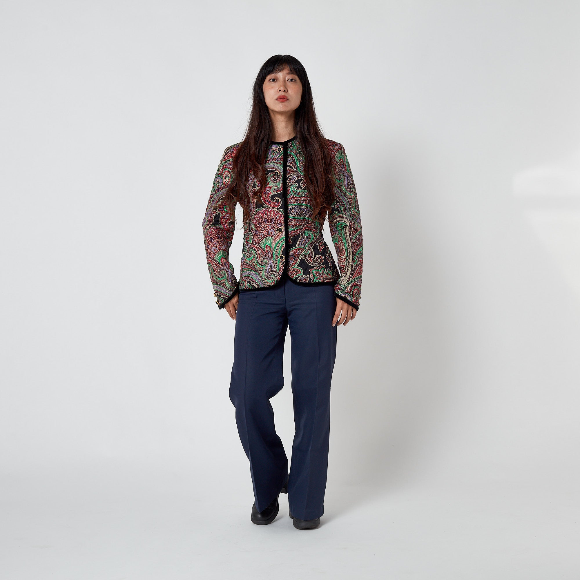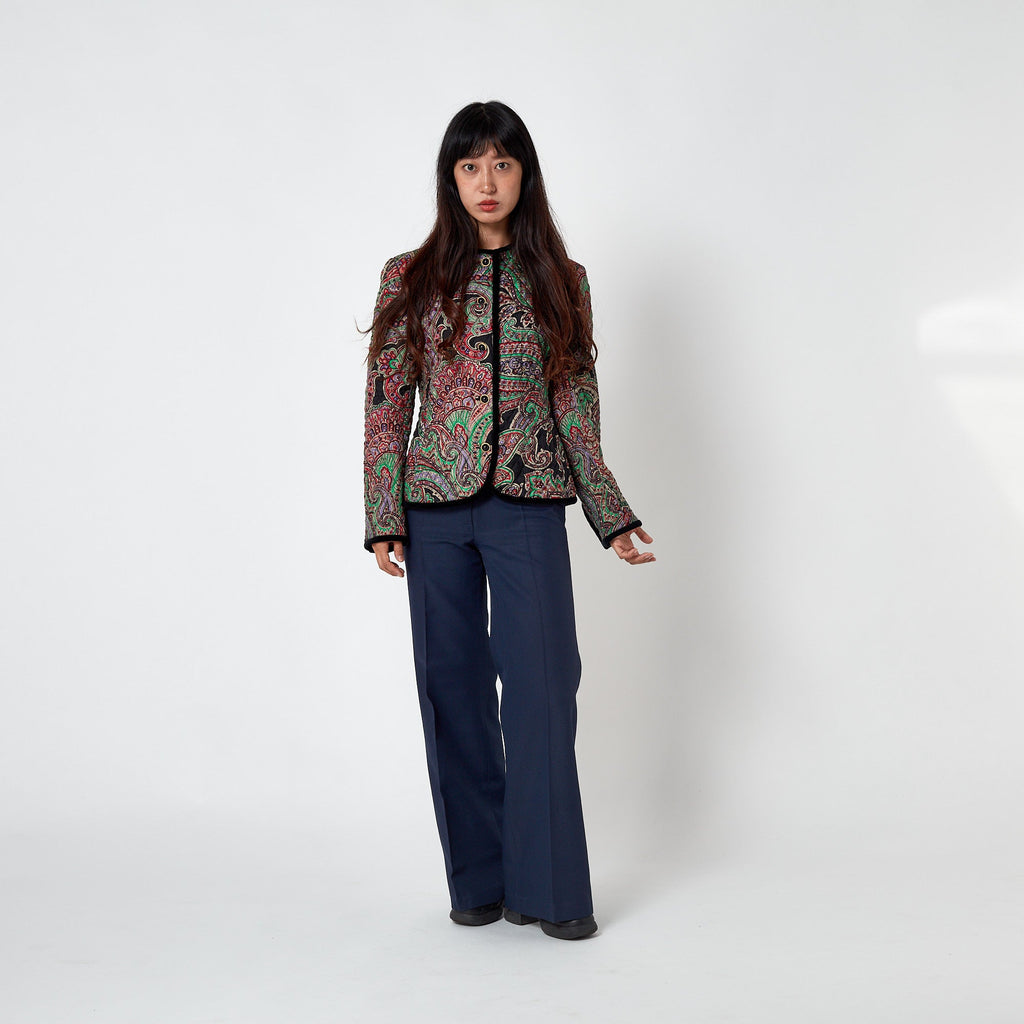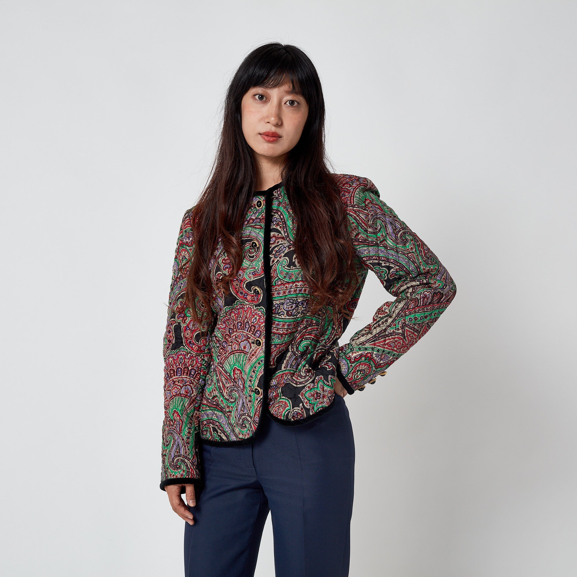 This vibrant 1990s vintage jacket by Carlisle is crafted from printed silk finished with black threaded quilting all-over. Superbly made, the print is an intricate paisley drawn in black outlines with emerald green, lilac, red, coral and palest grey detailing. The jacket is trimmed with thick black velvet around the neckline, down the front, around the bottom hem and at the cuffs. It is secured at the front with five decadent gold and black buttons and a hidden tonal black snap closure at the neck. The split cuffs are also finished with three of these pretty buttons. This beautiful jacket is lined with crimson red silk. The label reads, “Made in British Crown Colony of Hong Kong”; an area known for its exceptional garment making.