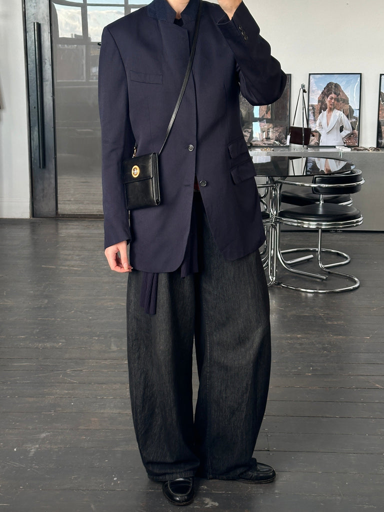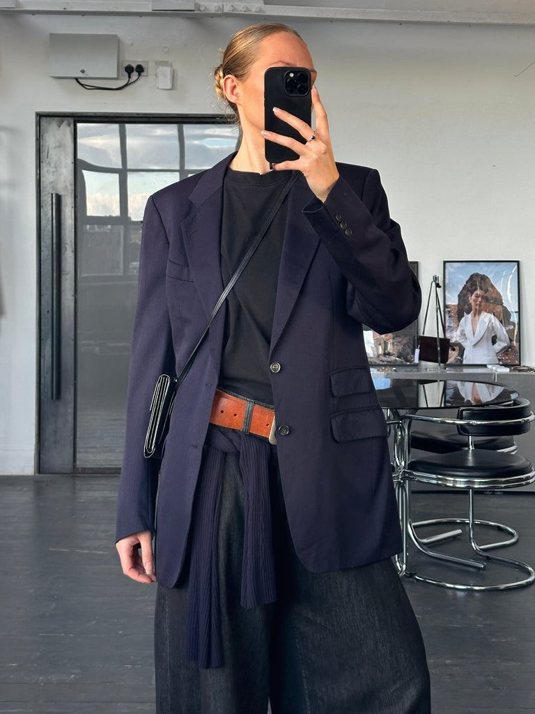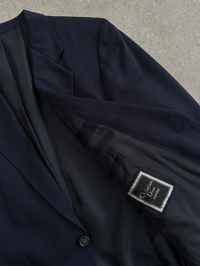 Vintage navy pure wool Christian Dior Monsieur 1990s single breasted blazer in a clean, structured cut with a subtle woven texture. Finished with a two button front and full viscose lining for an elevated tailored feel.