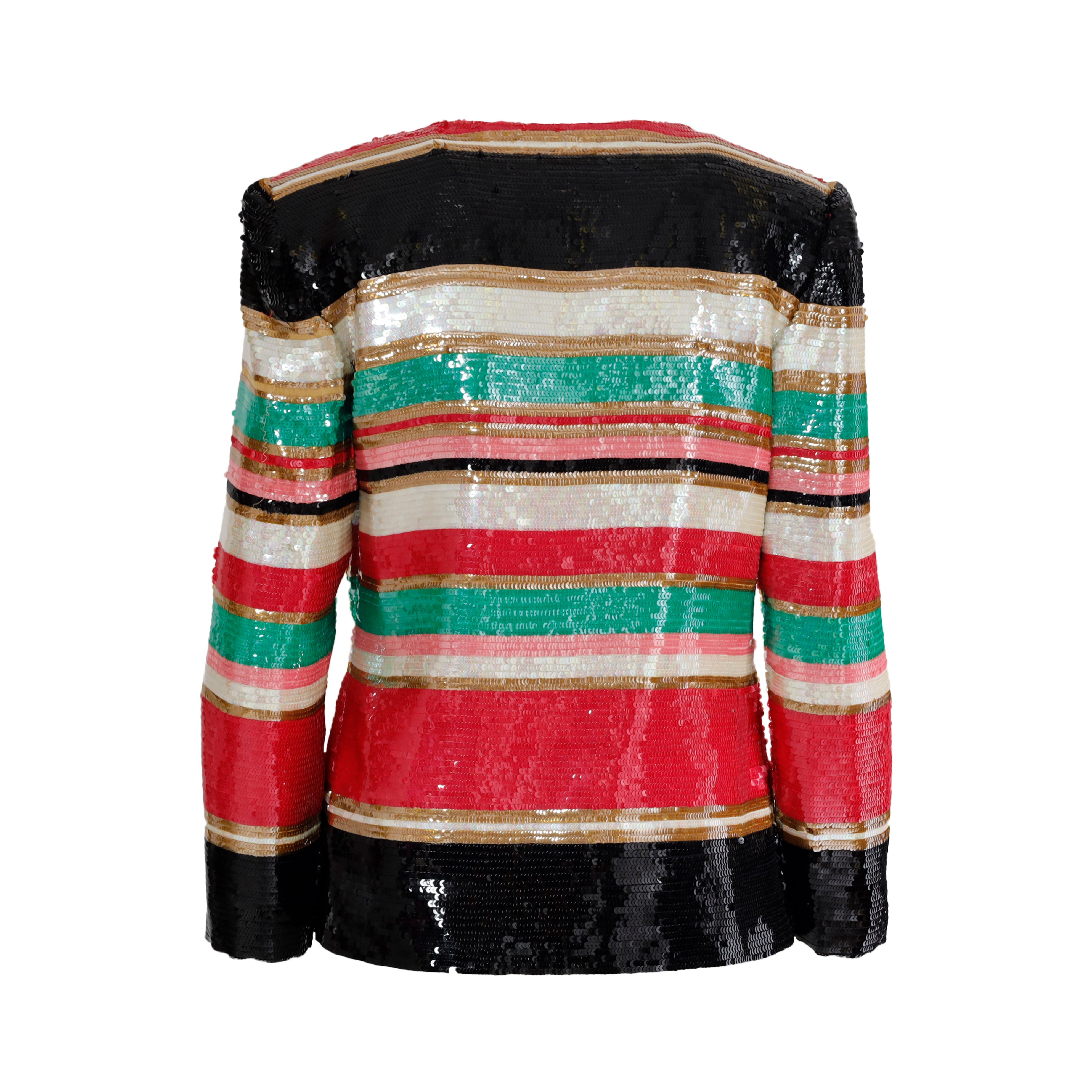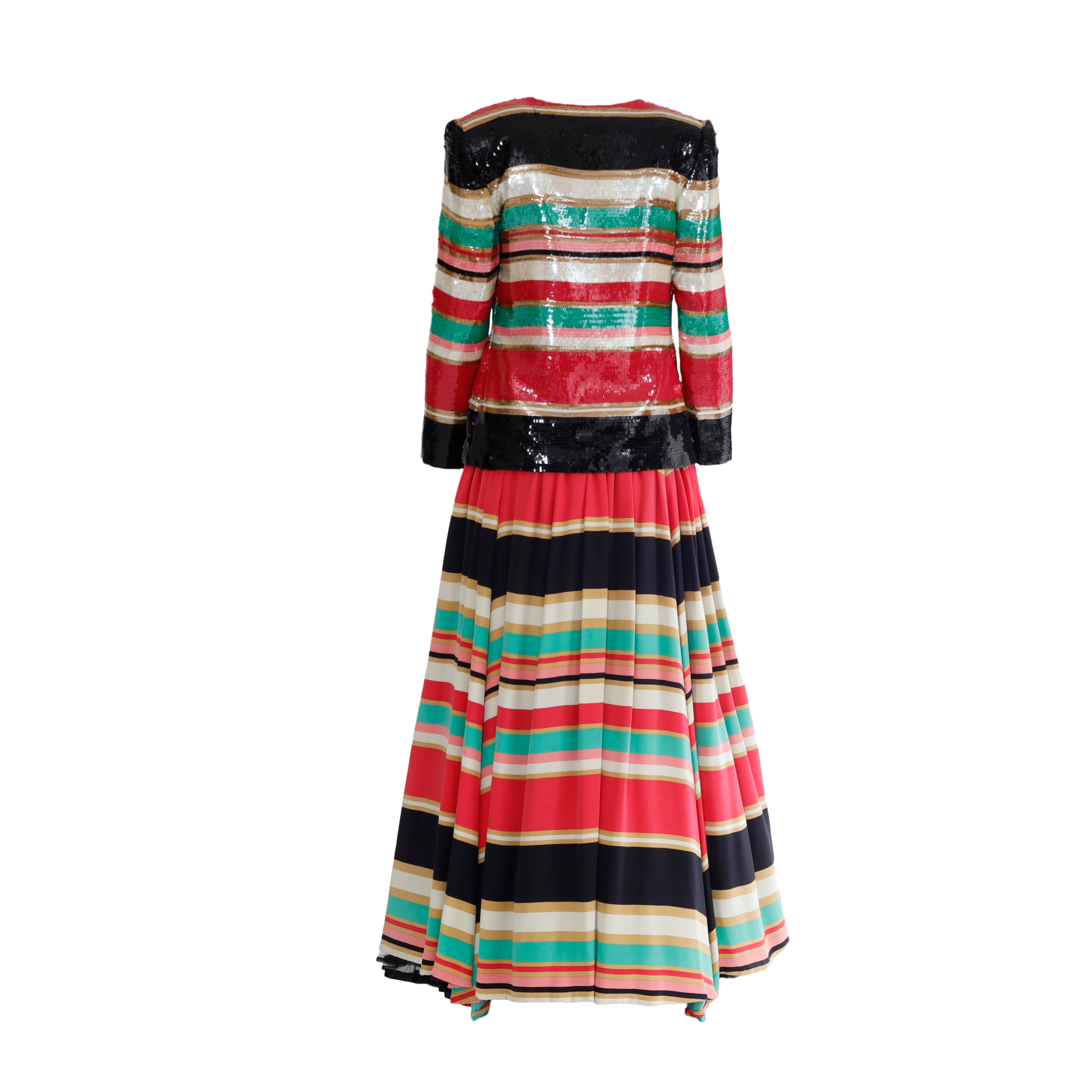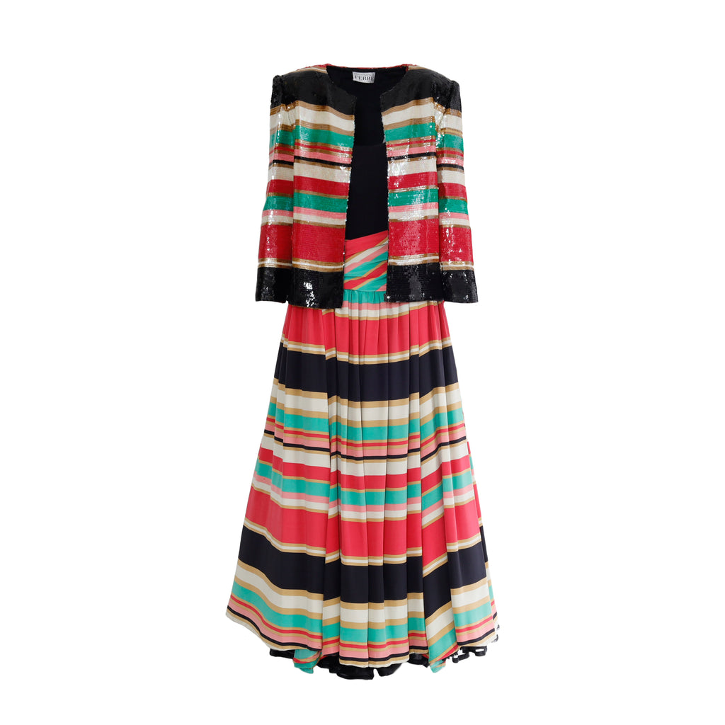This gorgeous ensemble includes a multicolor striped dress with a black bodice and ruched waist, plus an eye-catching jacket embelished with sequin, featuring a front closure. Wear together or separately for the perfect vintage look.