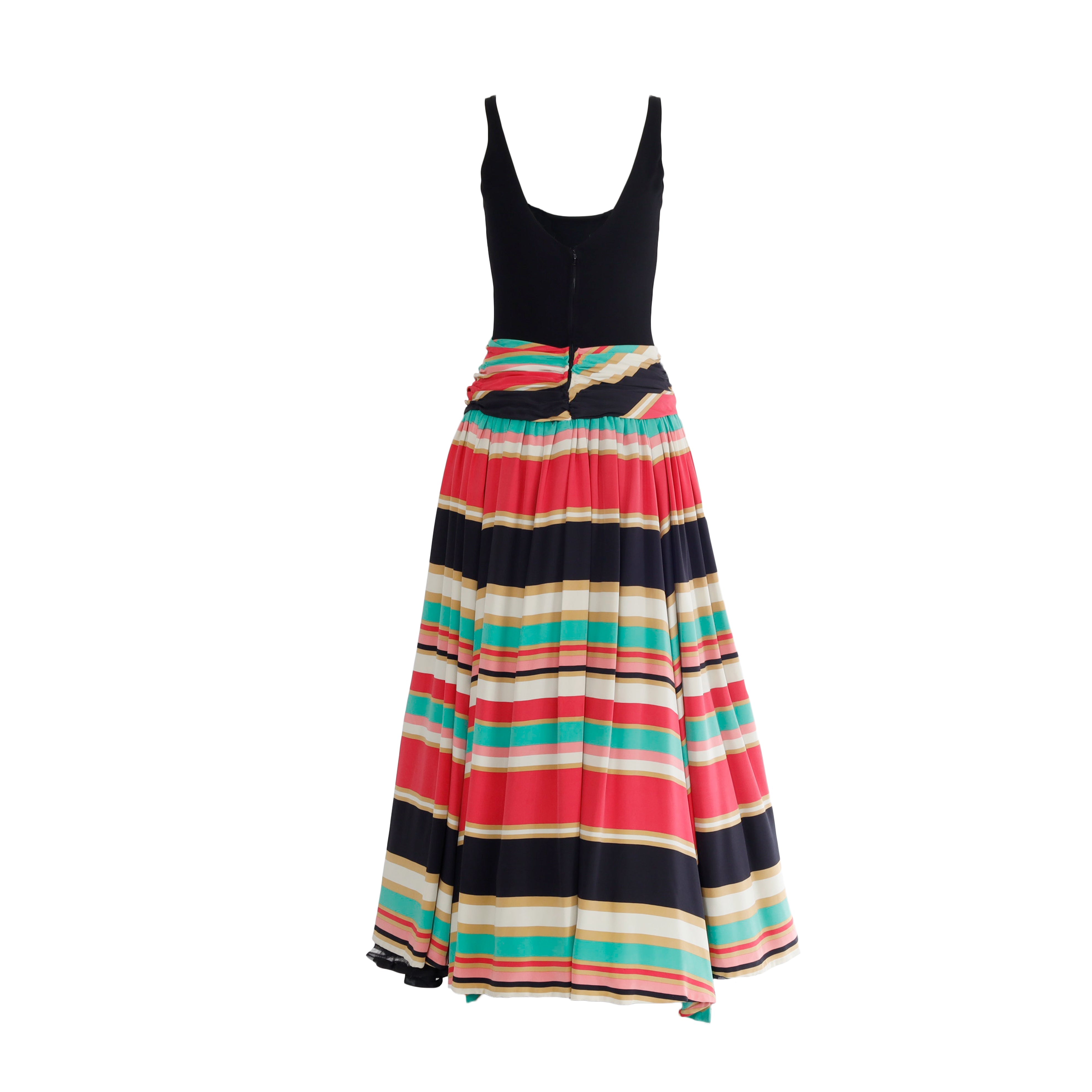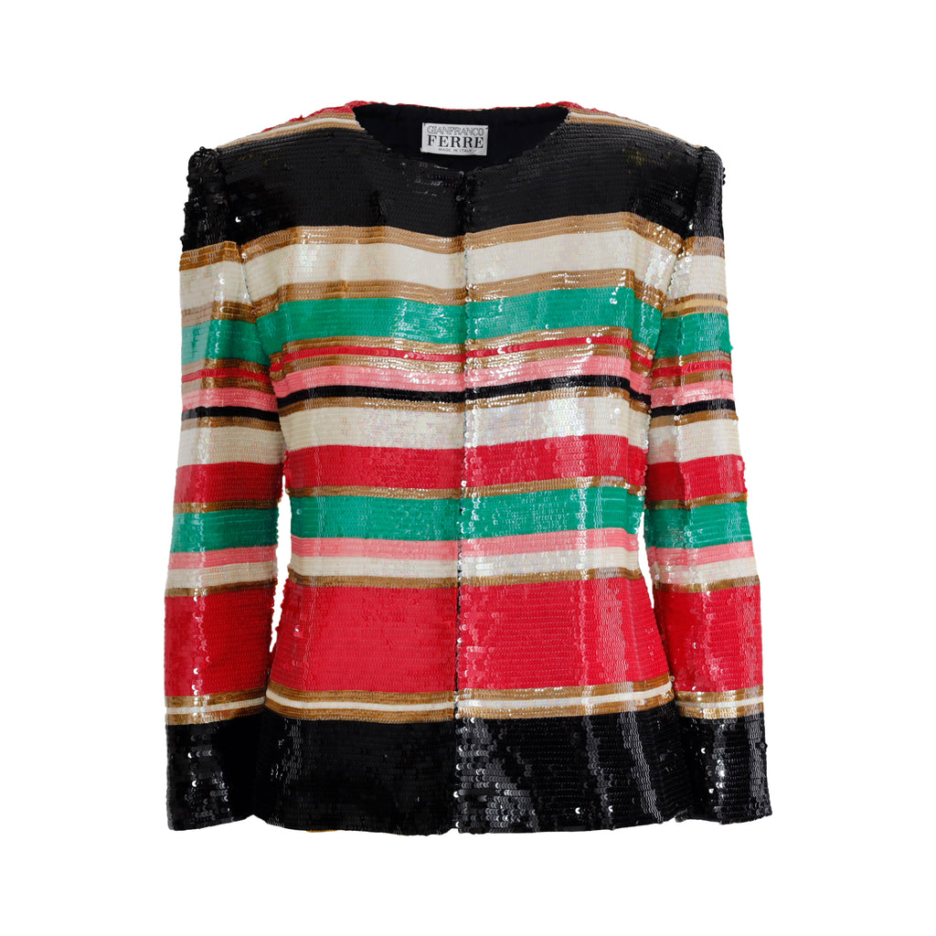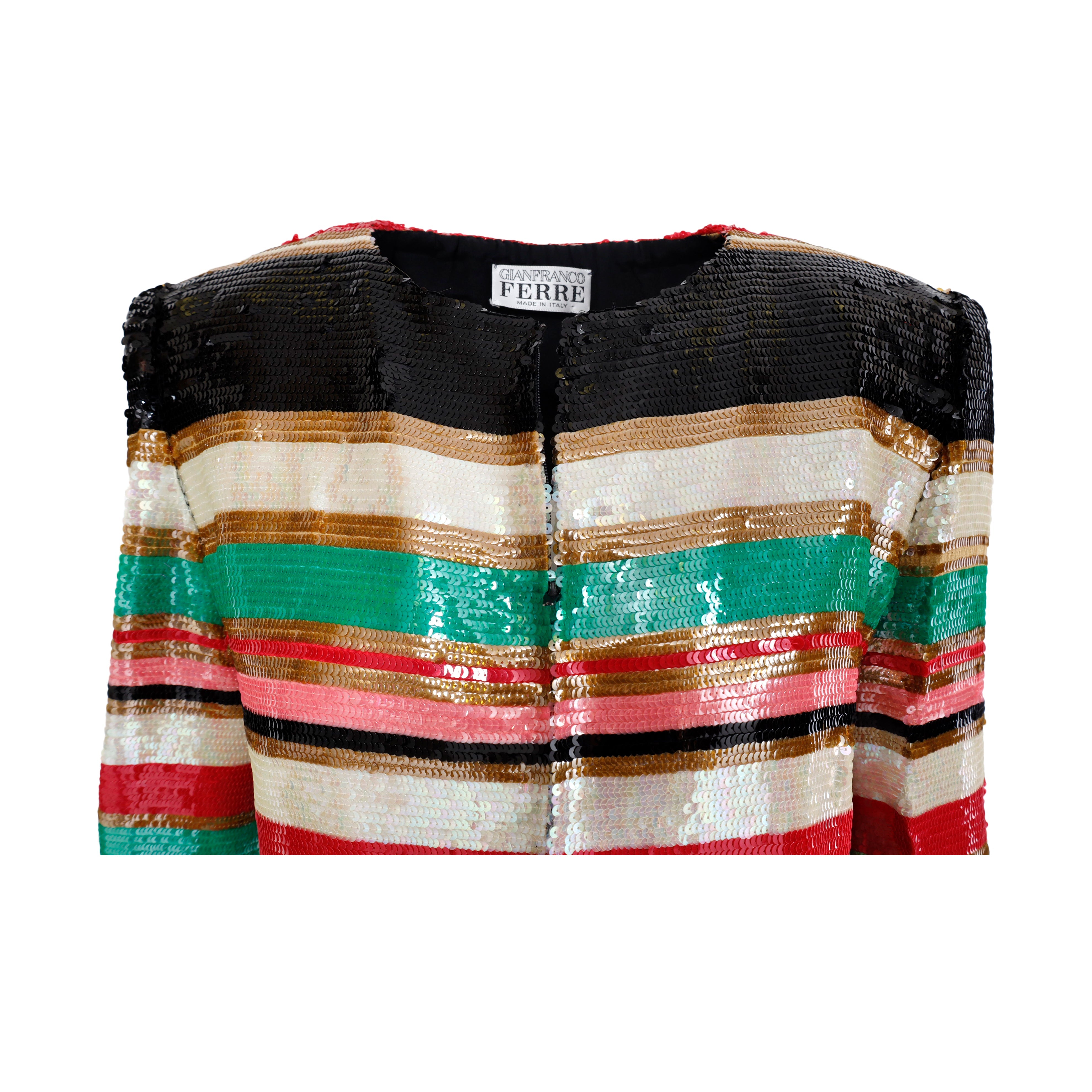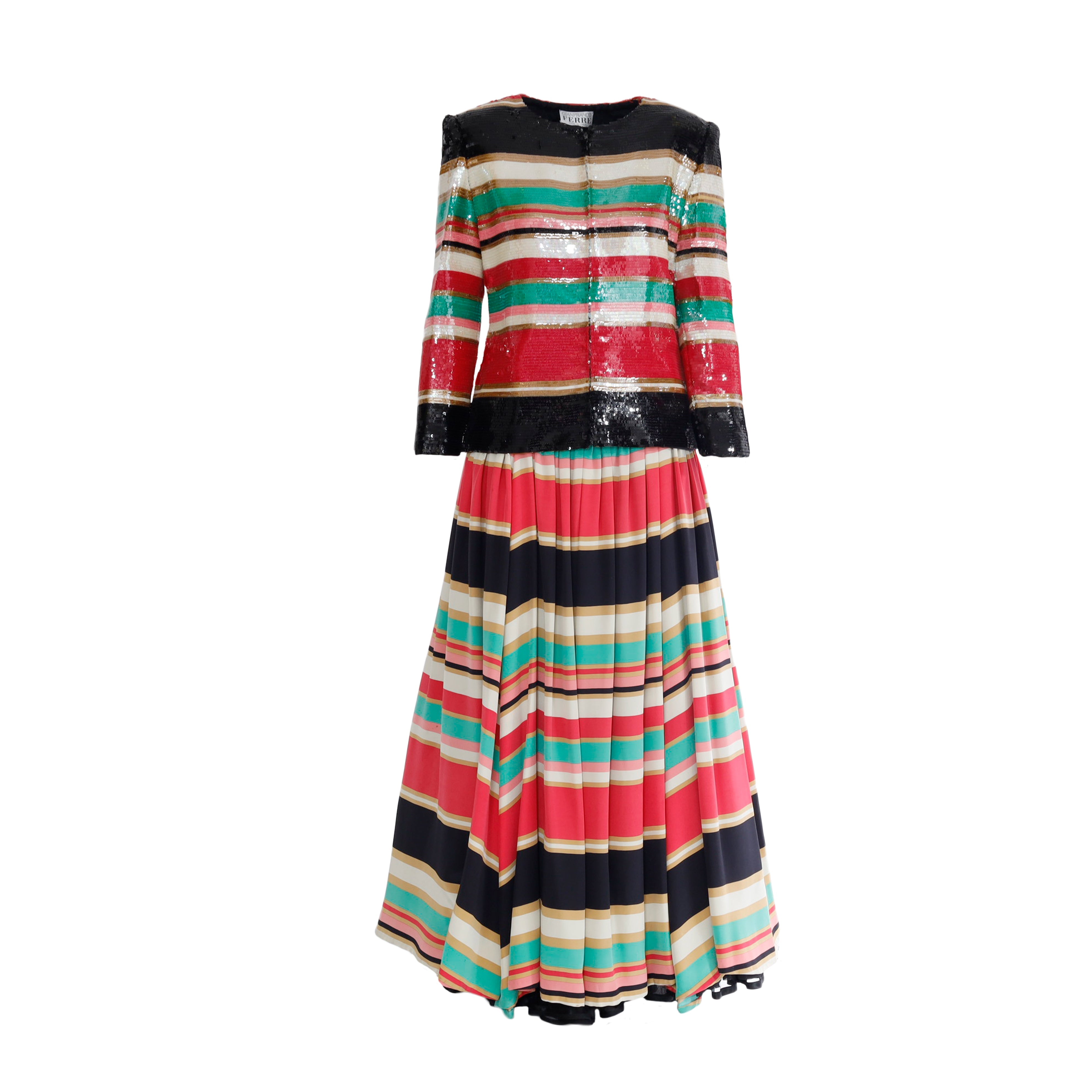 This gorgeous ensemble includes a multicolor striped dress with a black bodice and ruched waist, plus an eye-catching jacket embelished with sequin, featuring a front closure. Wear together or separately for the perfect vintage look.