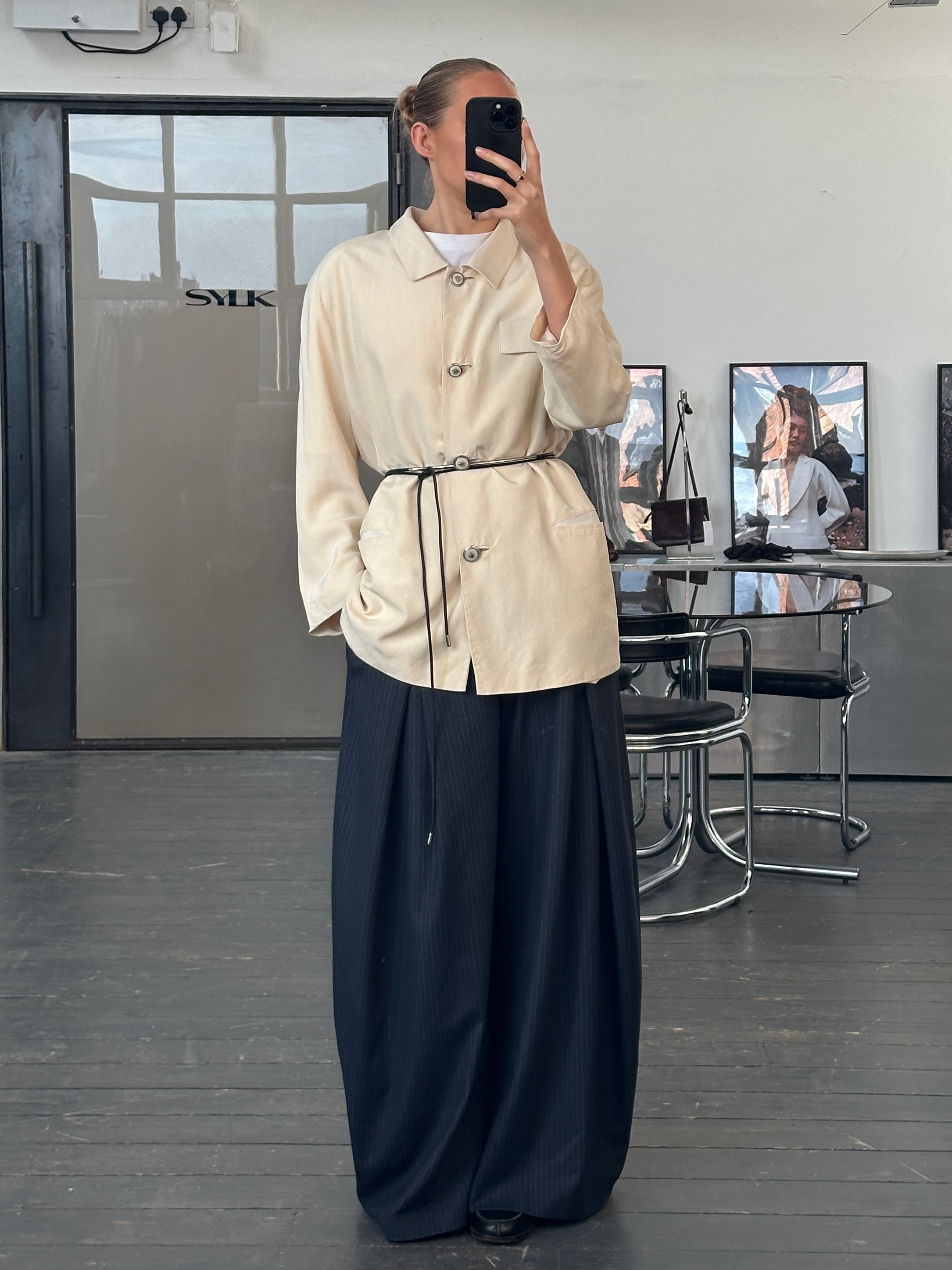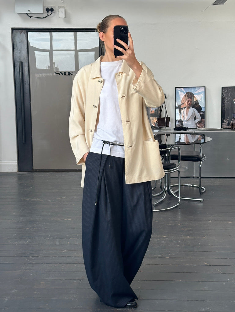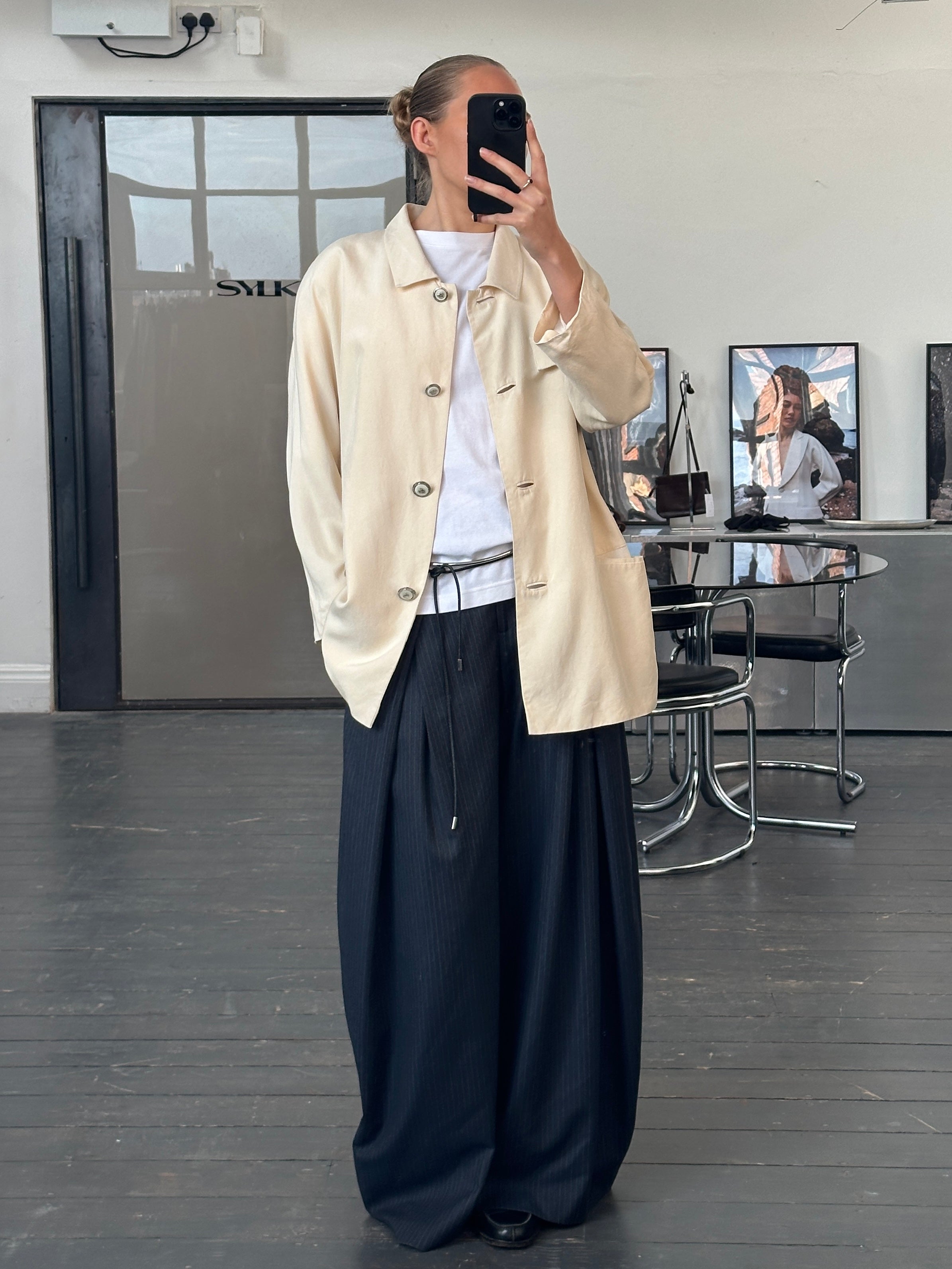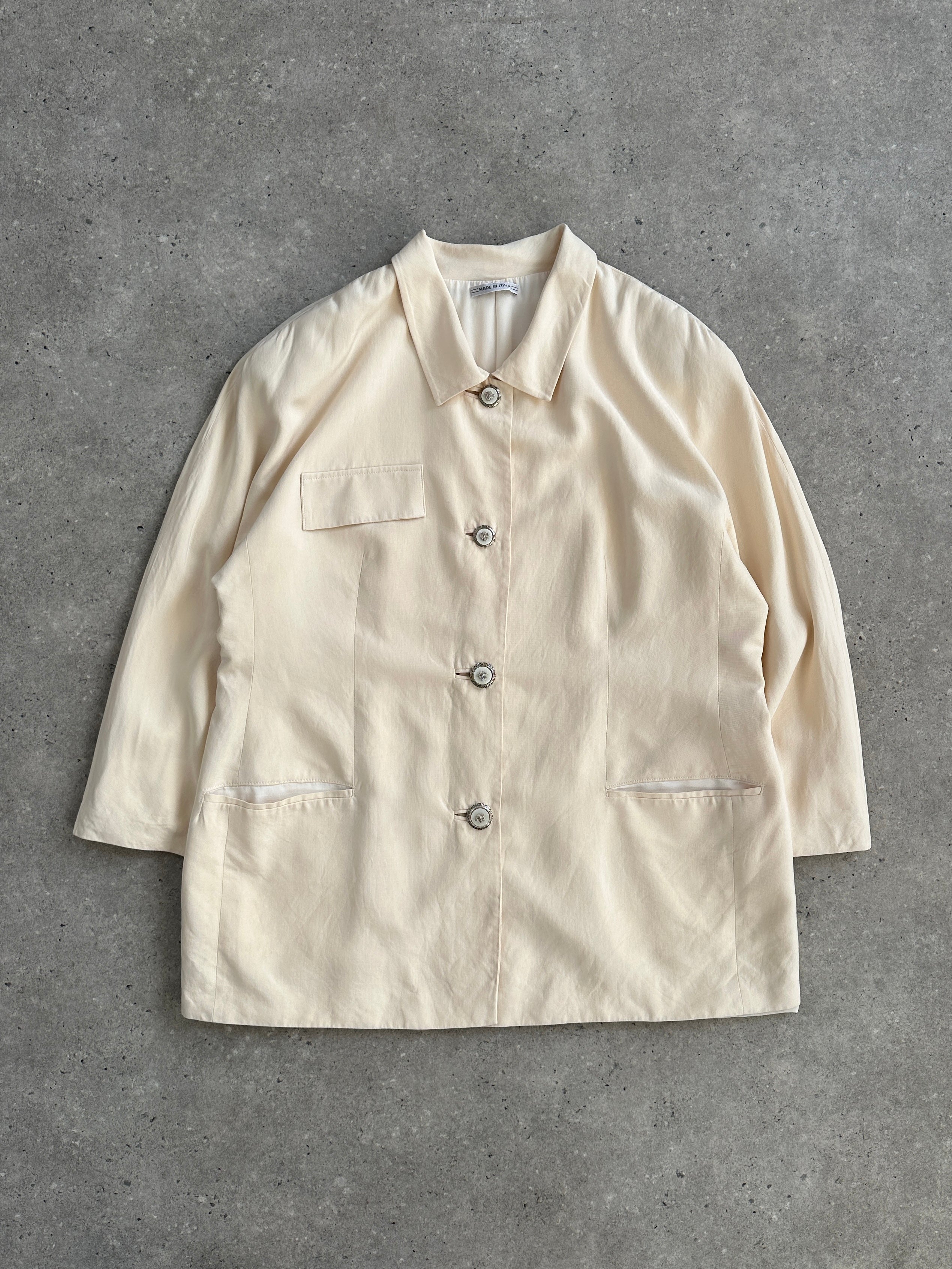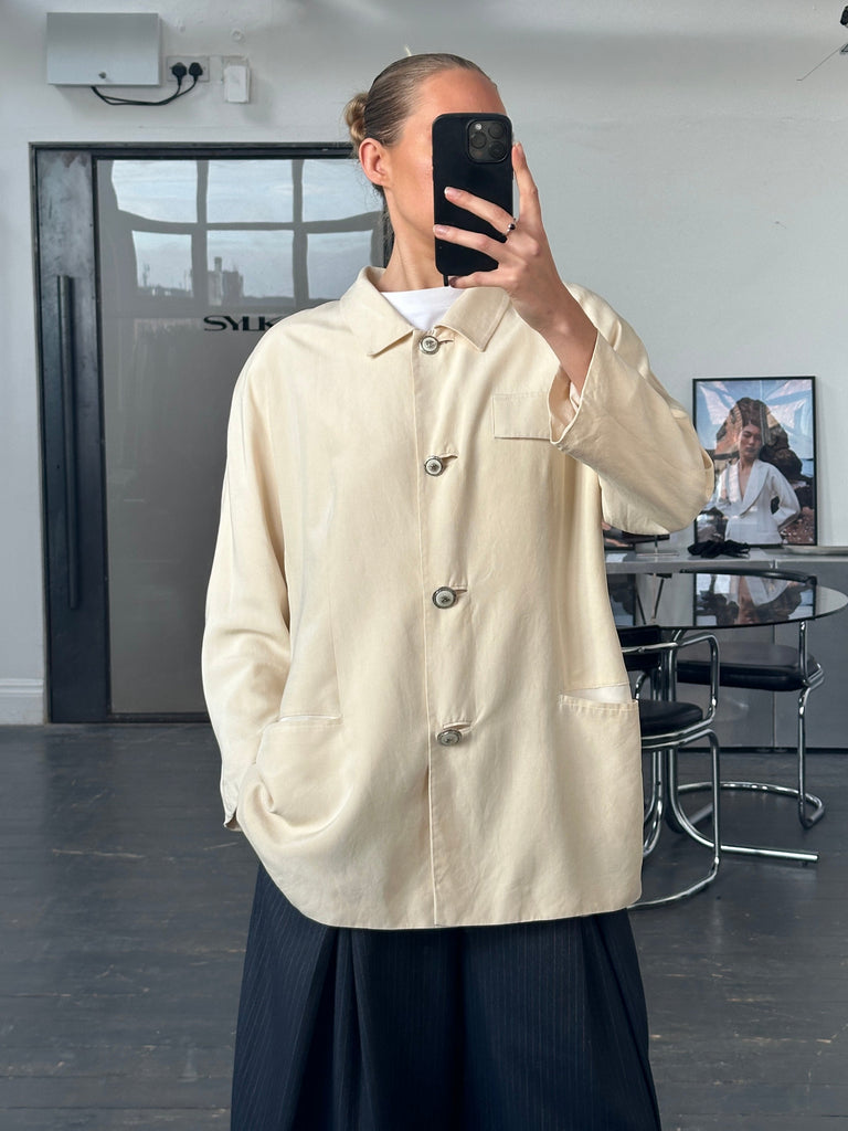 Vintage minimal 1990s Gianni Versace Versatile cream silk blazer with bespoke Medusa mother of pearl buttons and a relaxed, softly structured silhouette. Finished with a clean point collar and subtle pocket detailing.