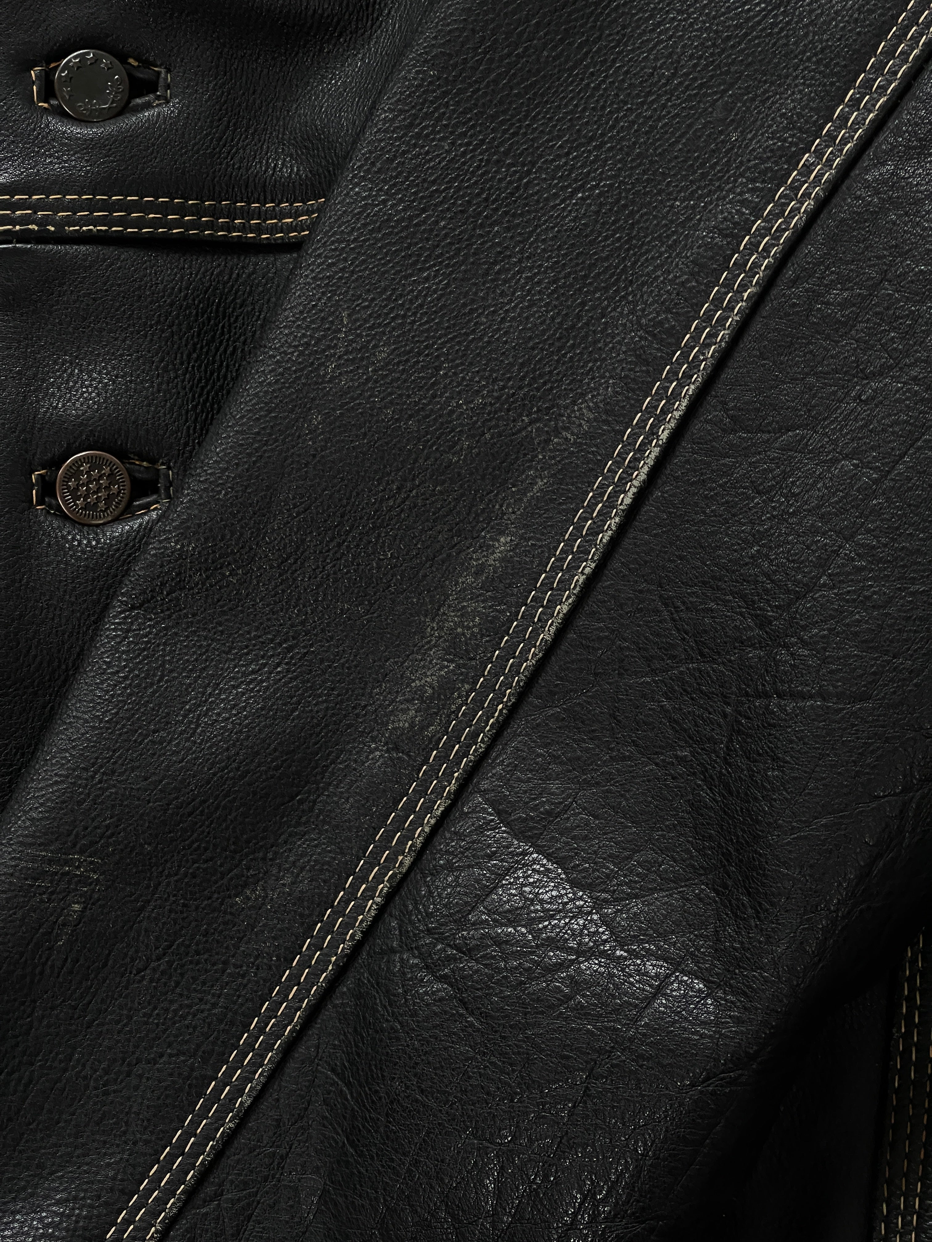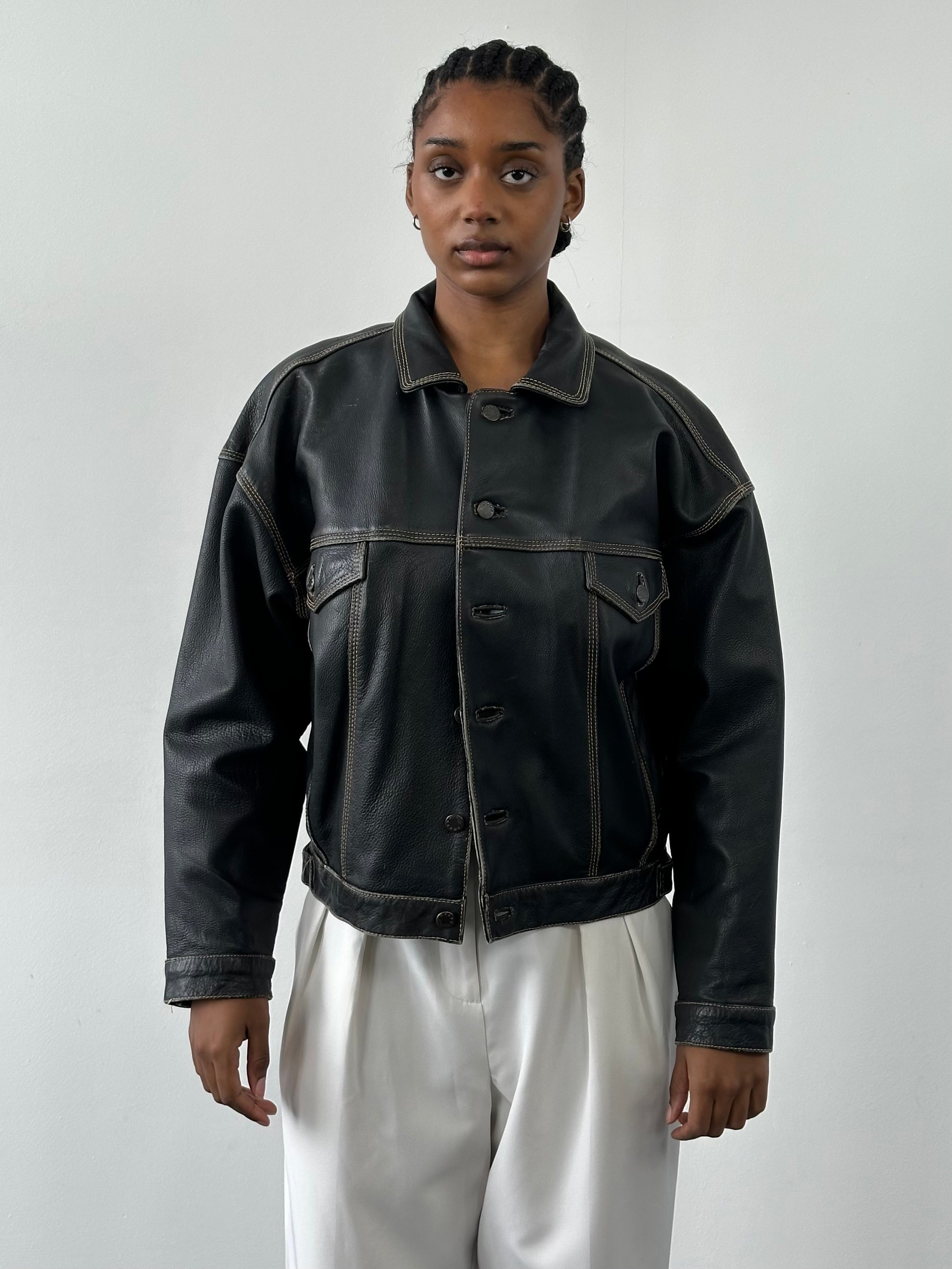 Serge Lonnet 1990s vintage boxy leather jacket in black with contrast stitching and a structured cropped silhouette. Features front button fastening, chest flap pockets and strong dropped shoulders for a relaxed vintage fit.