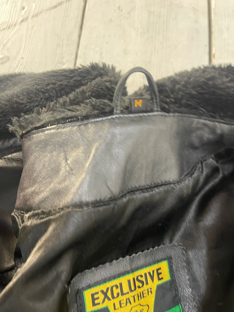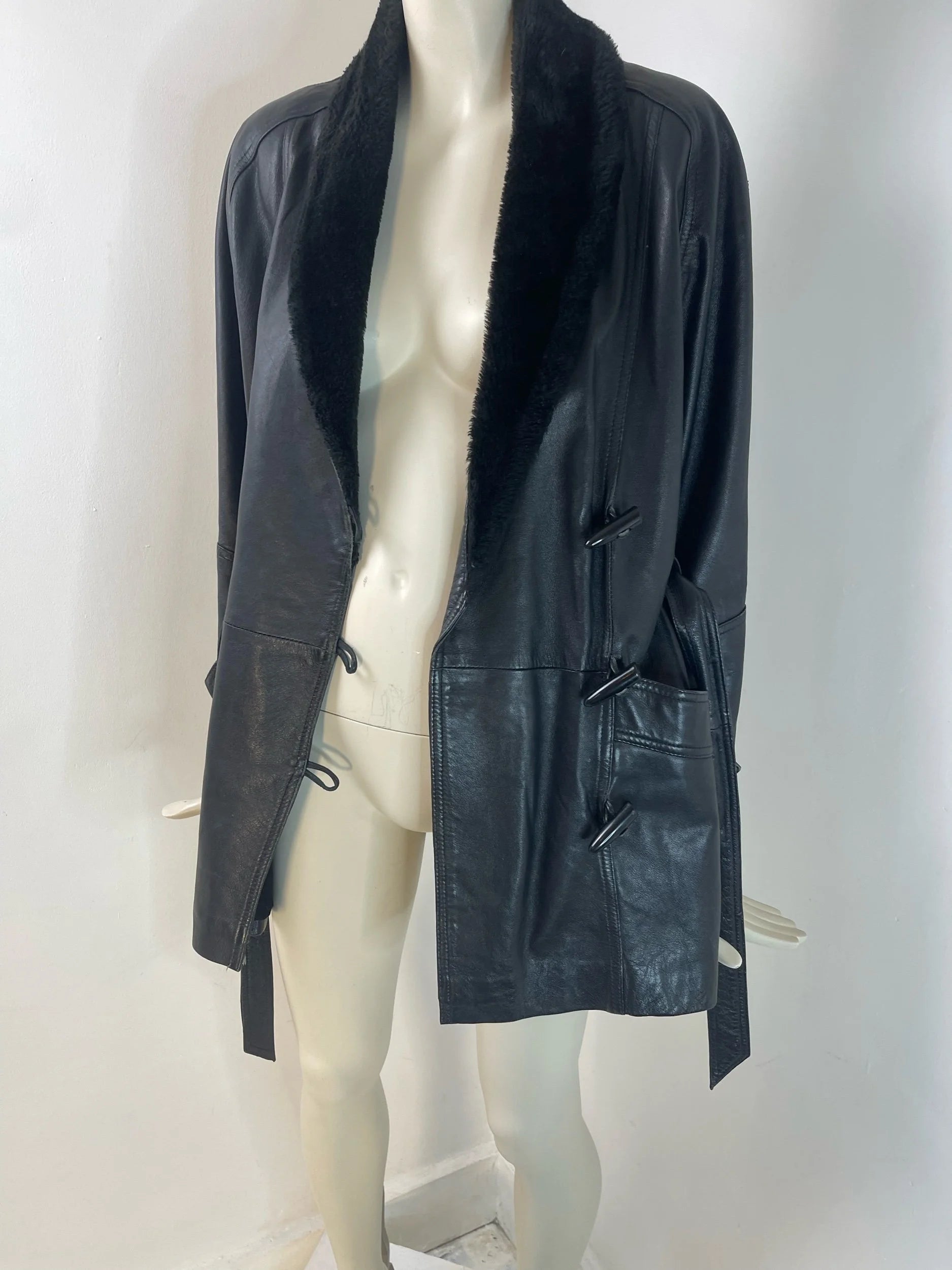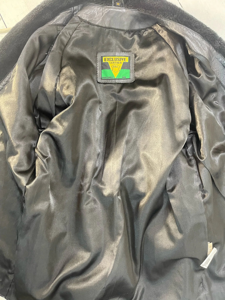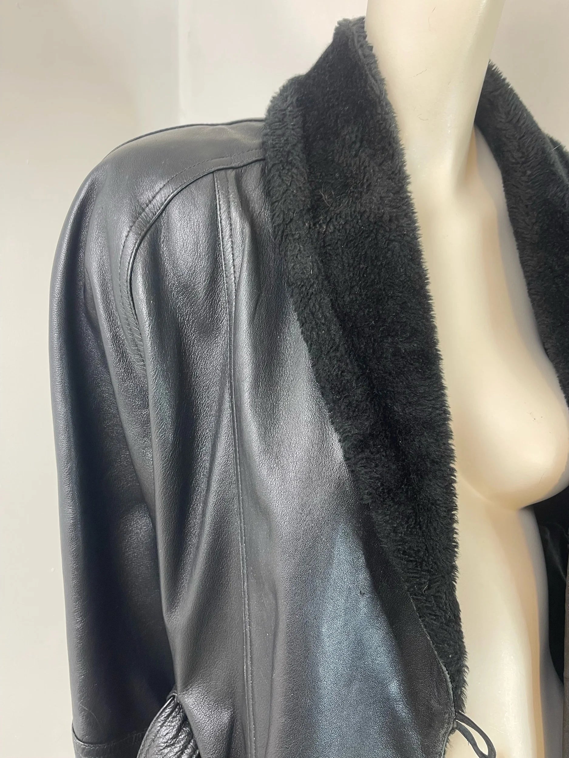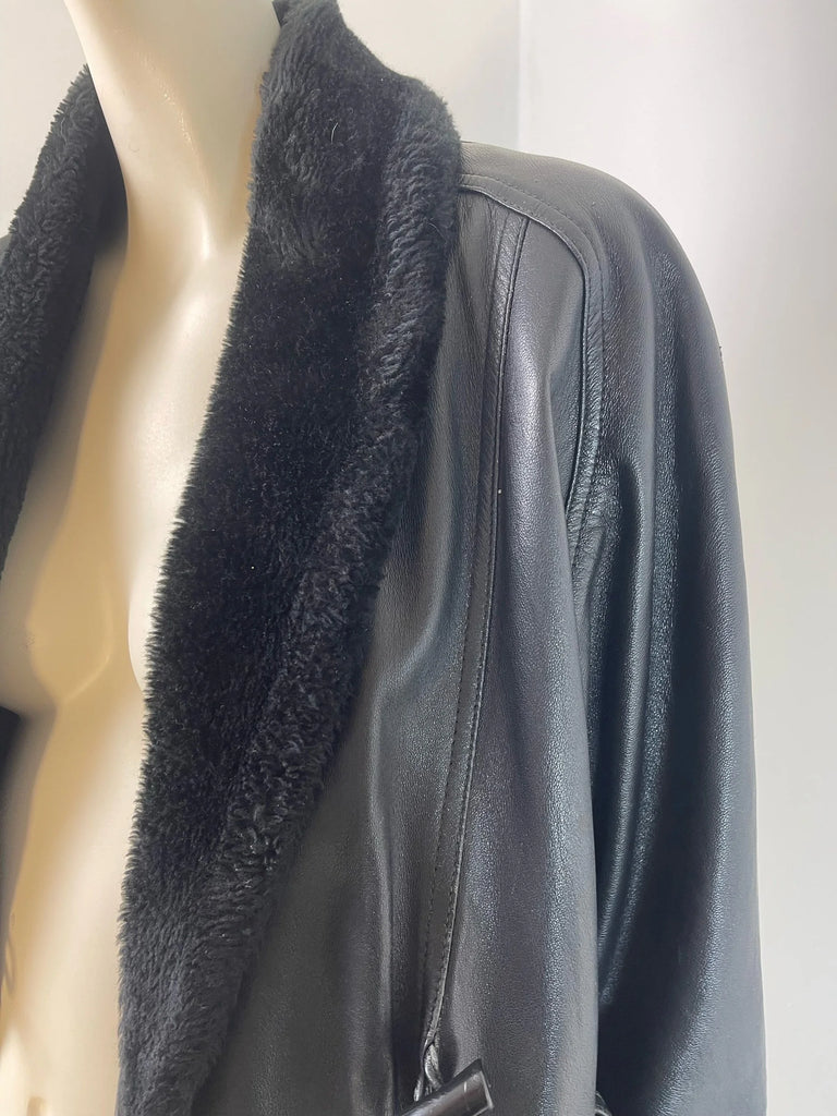 Step into timeless style with this authentic late-80s/early-90s leather and shearling jacket — a rare vintage find that blends effortless cool with functional warmth. Crafted from supple black leather and trimmed with plush shearling along the shawl collar, this piece offers both comfort and iconic retro appeal.