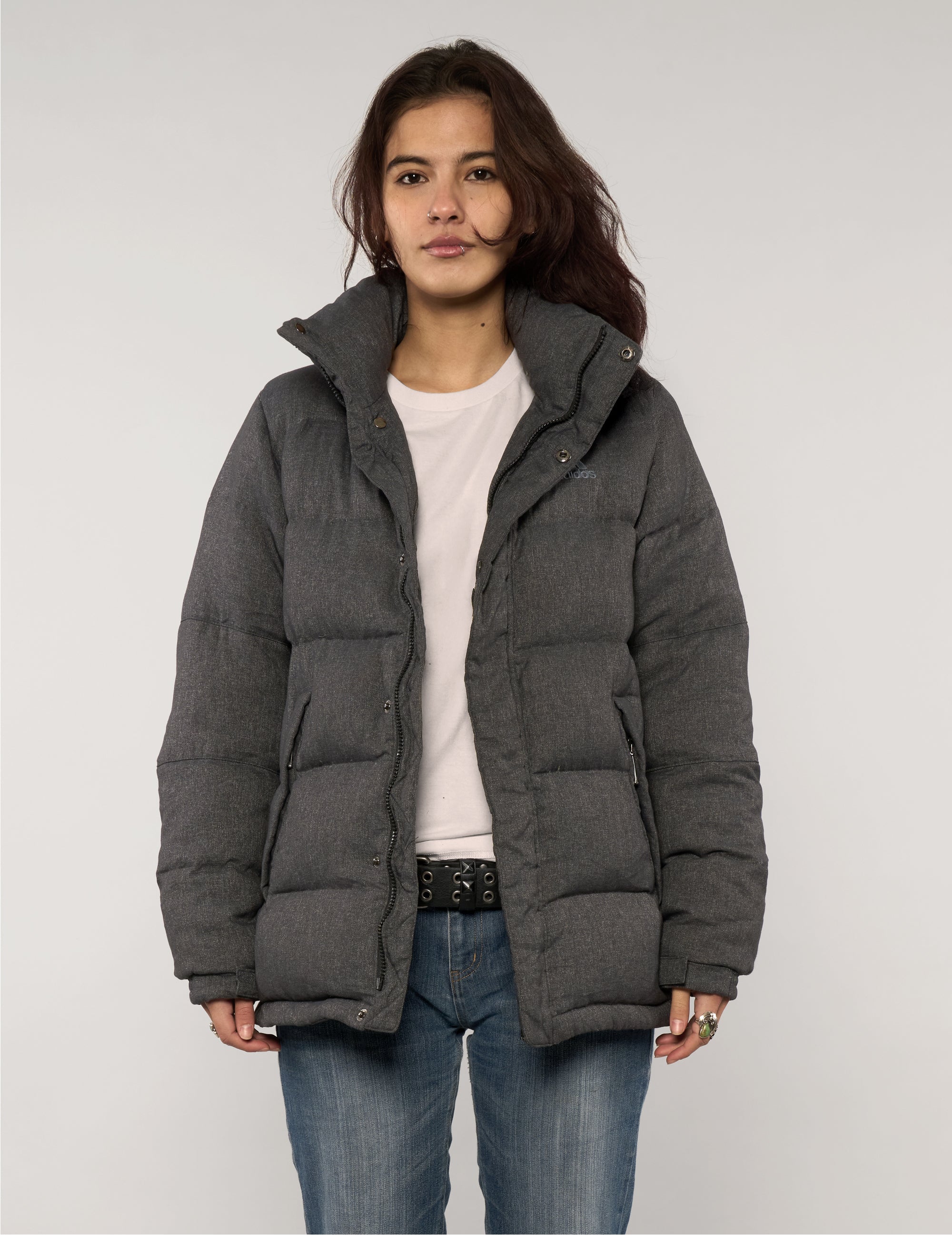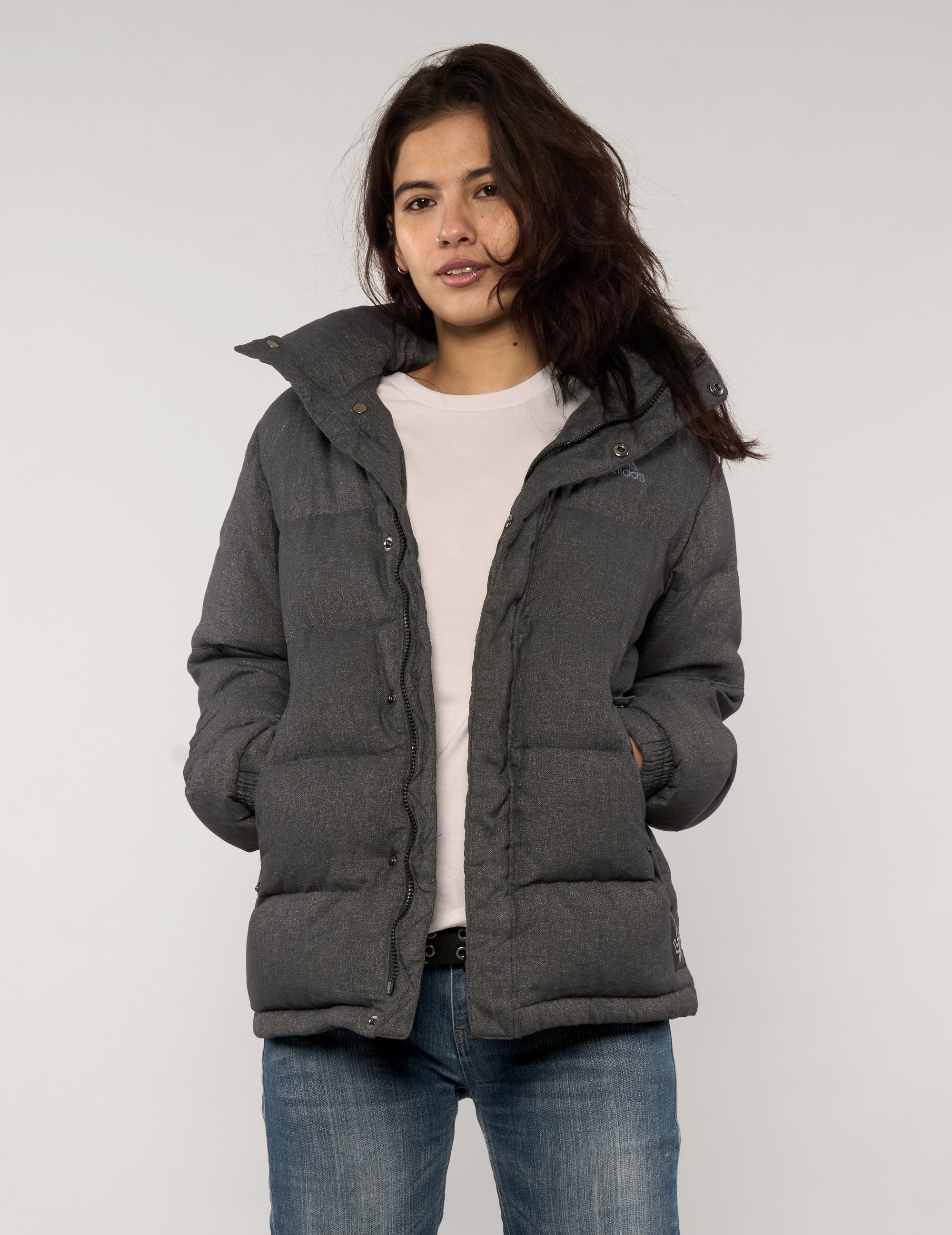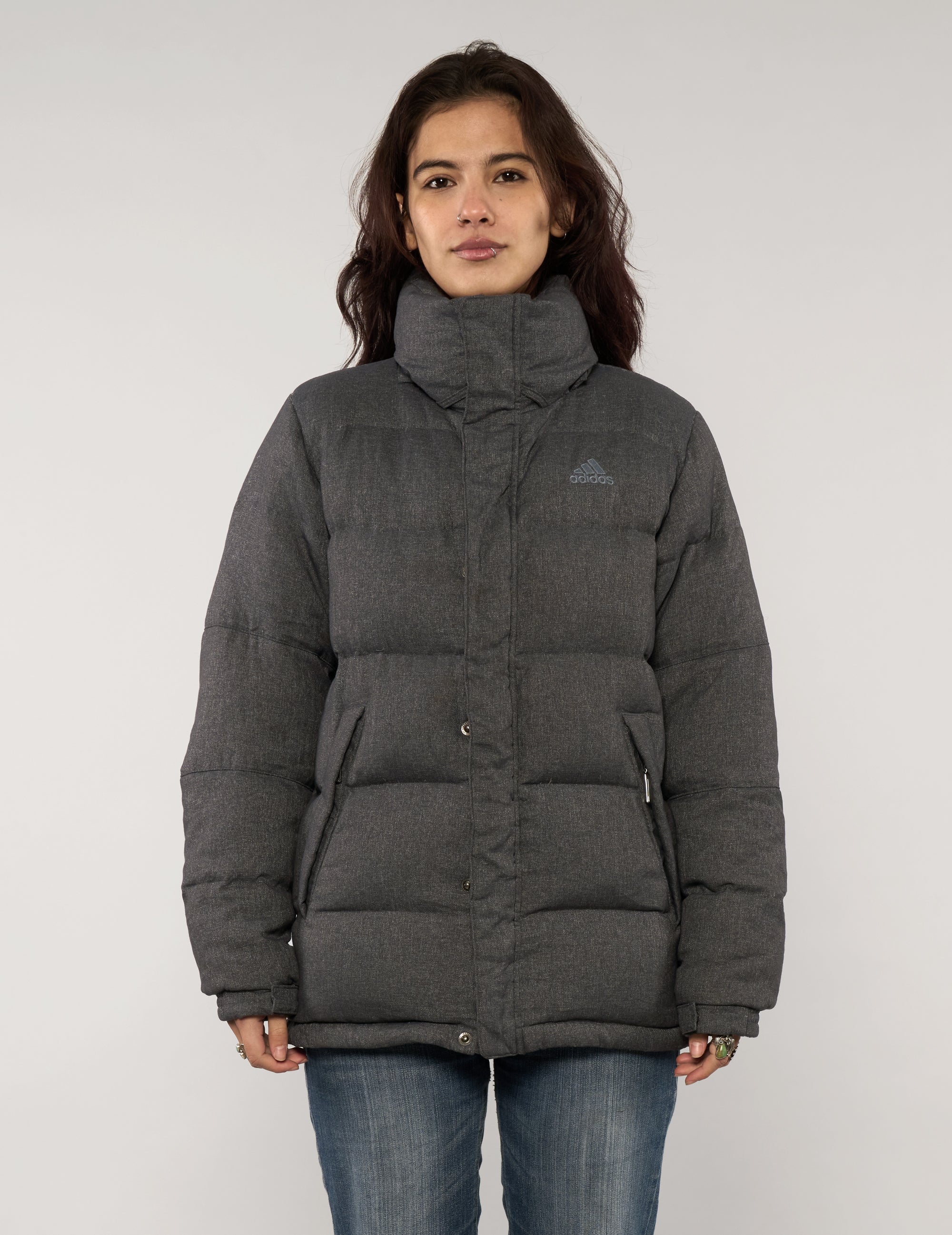Vintage 90s Adidas padded jacket designed for warmth with a clean, understated look. Cut in textured grey fabric, this style features a high stand collar, concealed front fastening, and quilted construction for everyday comfort. The relaxed fit allows for easy layering, while discreet side pockets keep the finish practical and streamlined. Simple, functional, and effortless—an essential cold-weather layer.