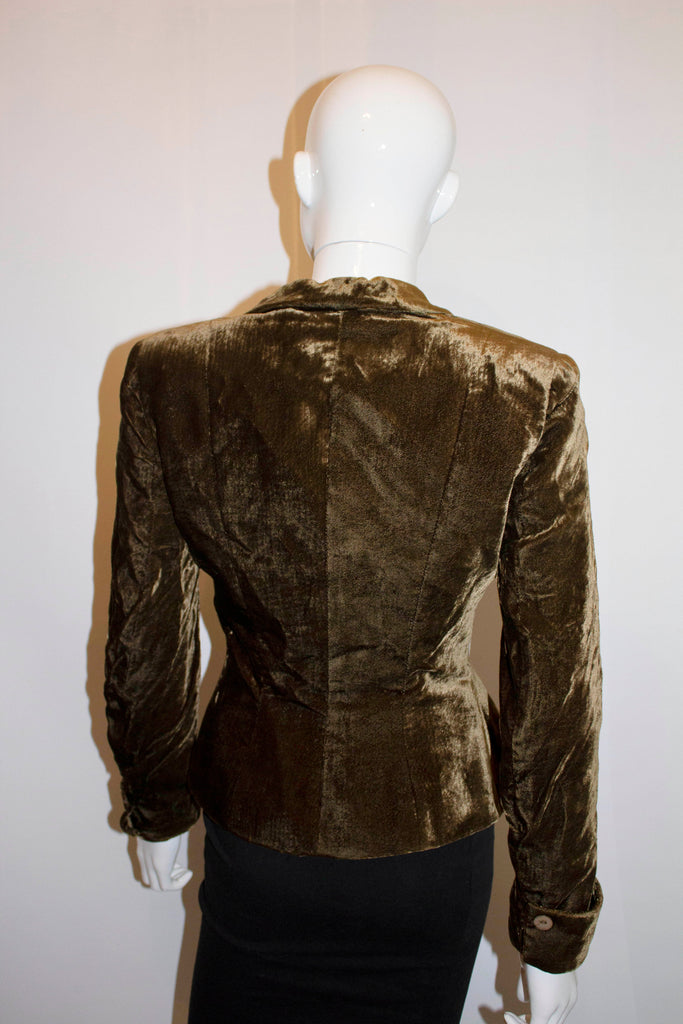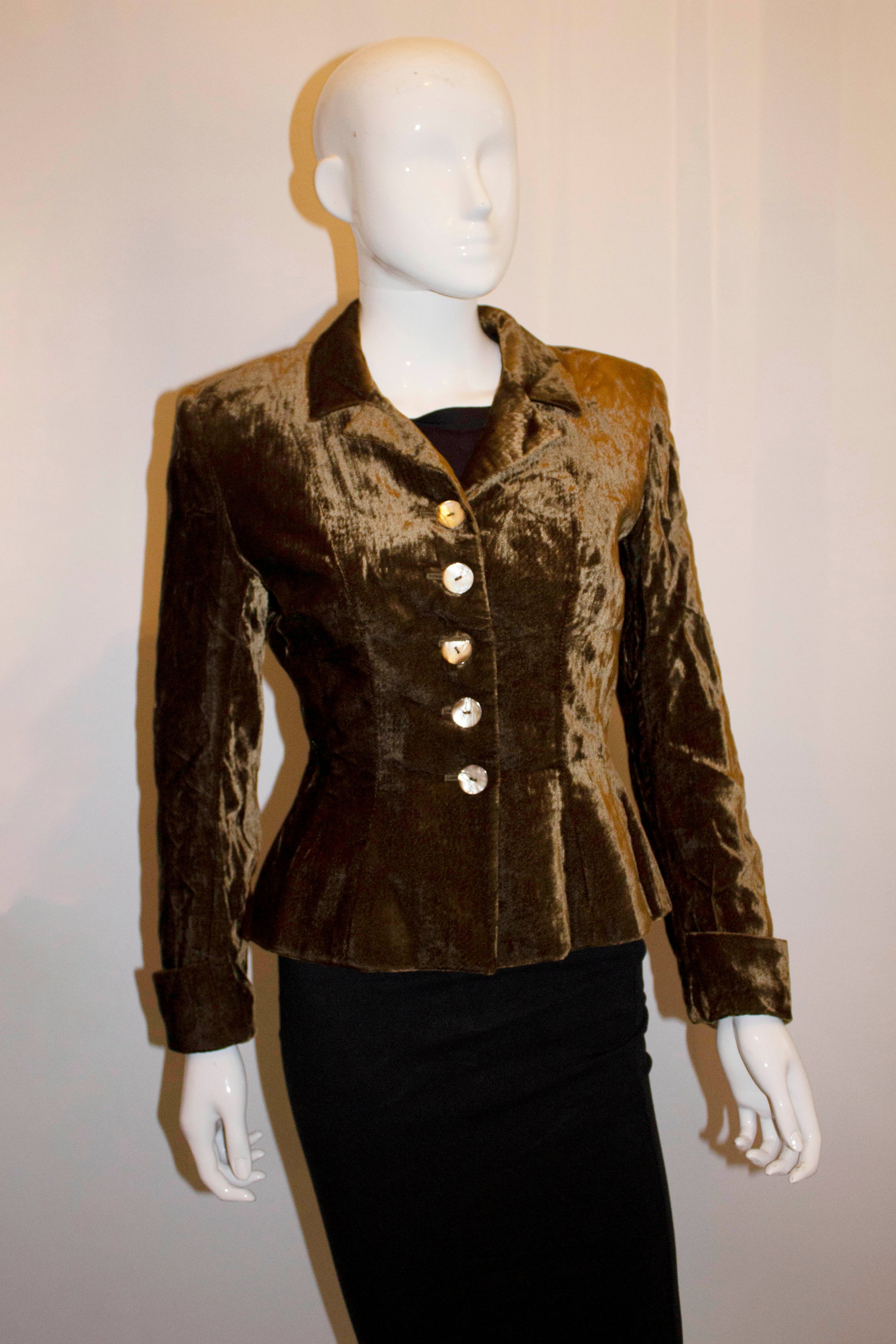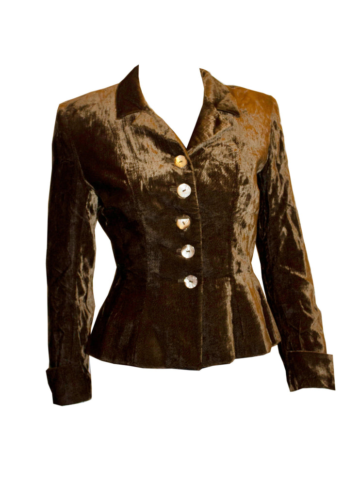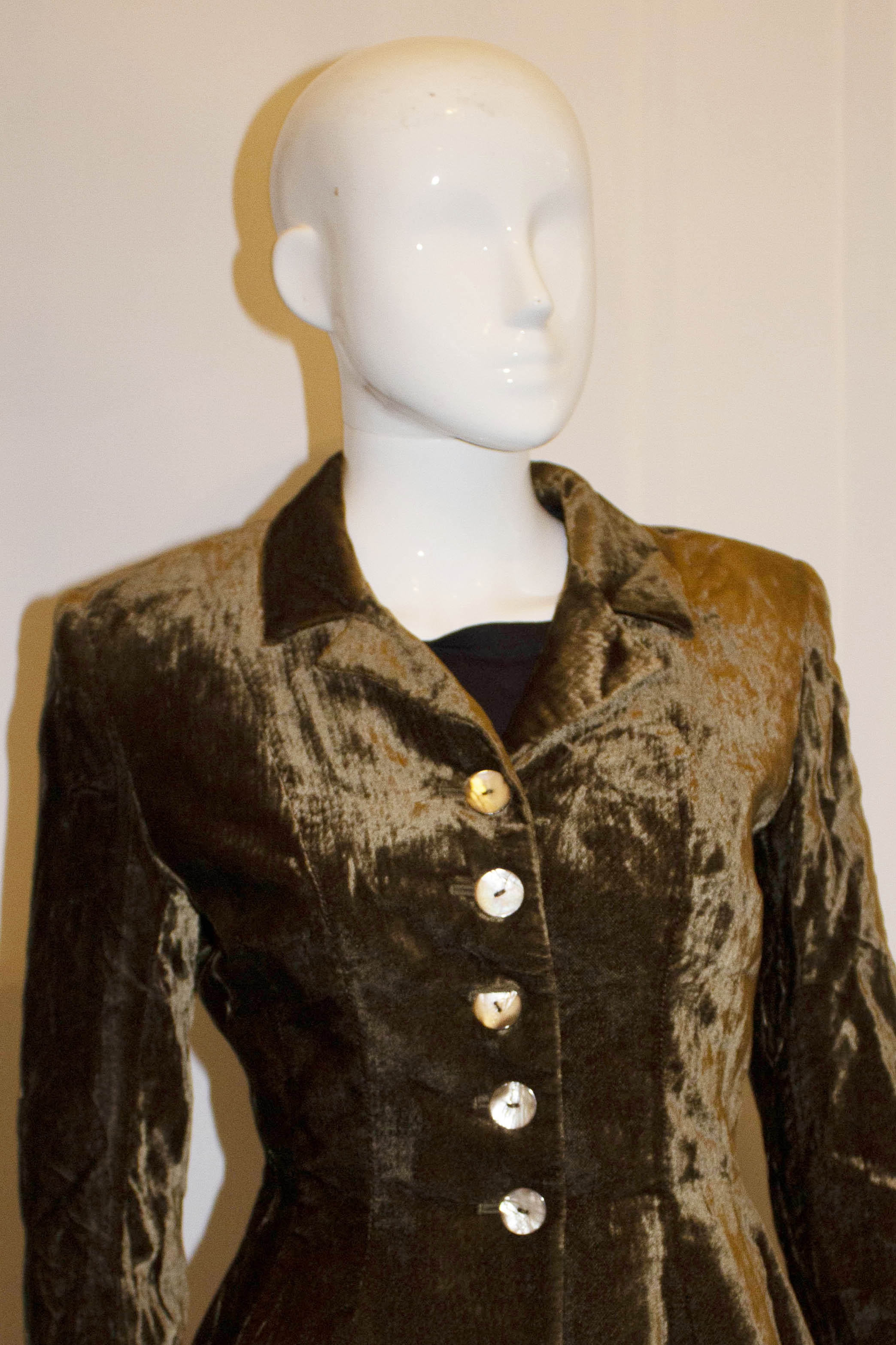 A super chic and soft vintage velvet jacket by Myreene de Premonville. In an olive brown colour with mother of pearl buttons, the jacket has a cut away collar, interesting cuff detail and is fully lined. There is enough space to move the buttons 1 '' if needed.