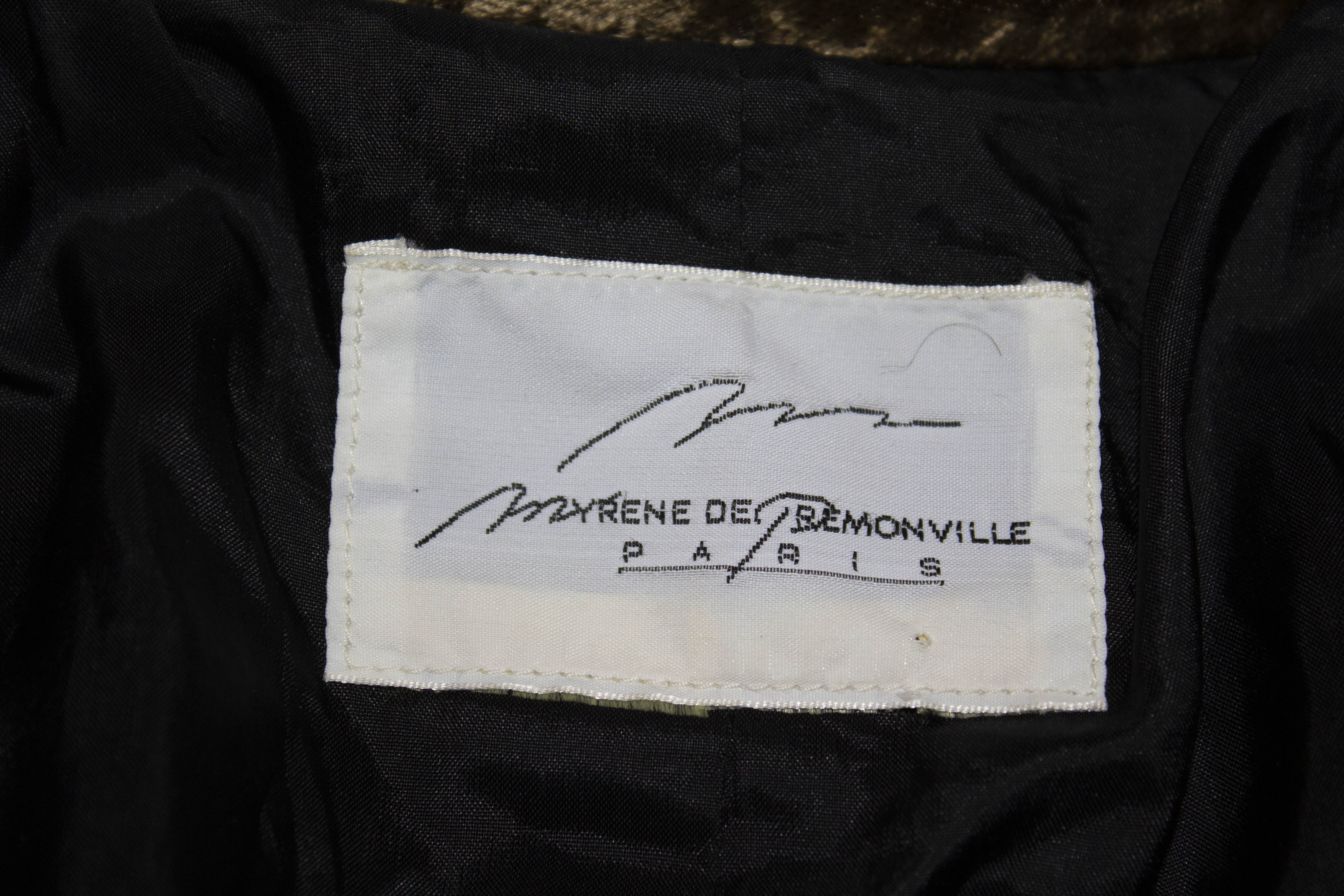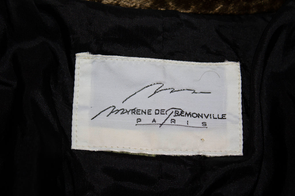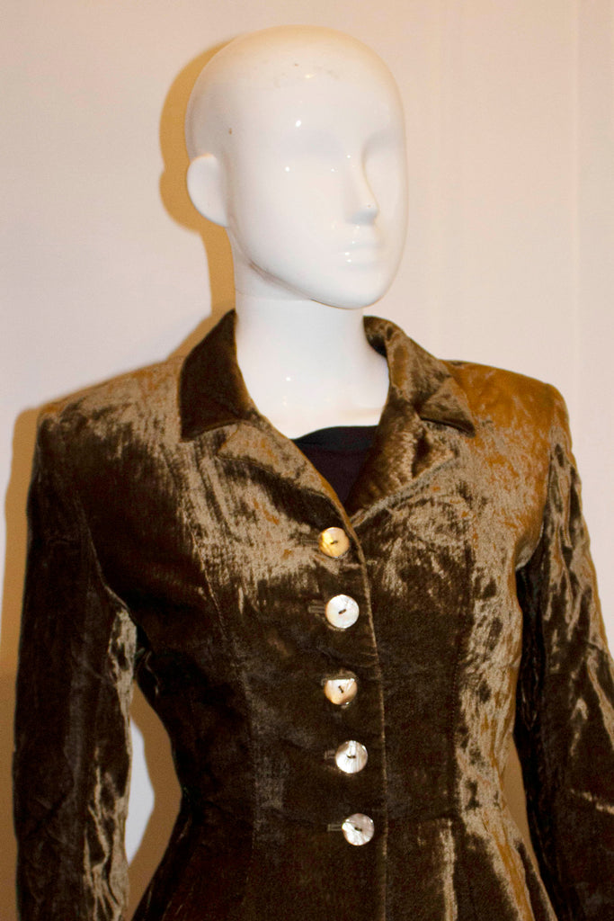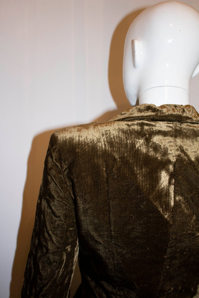 A super chic and soft vintage velvet jacket by Myreene de Premonville. In an olive brown colour with mother of pearl buttons, the jacket has a cut away collar, interesting cuff detail and is fully lined. There is enough space to move the buttons 1 '' if needed.