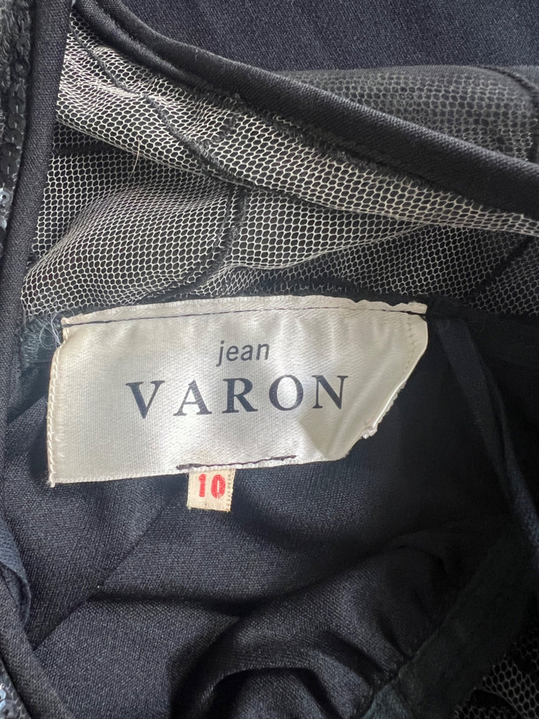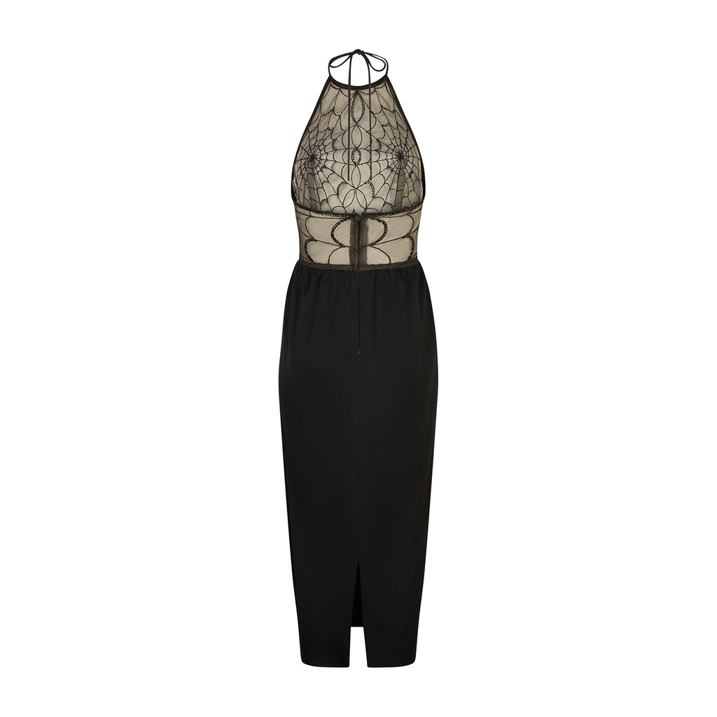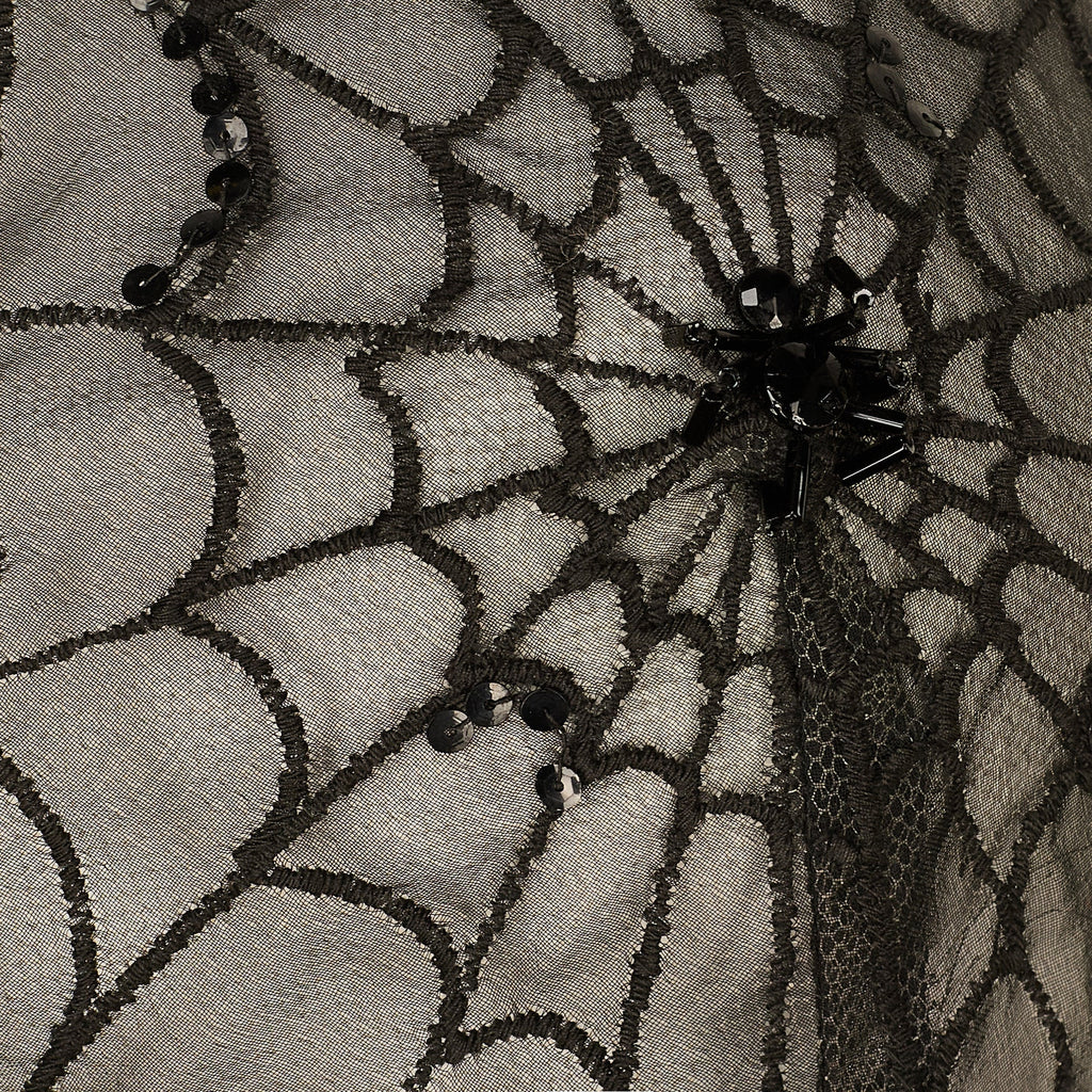 Fine and rare Jean Varon spider cobweb dress which can be dated to the designer's 1973 collection. We have featured a very famous dress with the same cobweb design from the September issue of British Vogue, also part of Circa's collection. The skirt section is fashioned from a sleek black jersey with a slight sheen and falls in a straight manner to the calf. It has a slit at the rear for ease of movement. The detail across the halter-neck top of this dress is incredible; tailored from sheer black mesh, it is embroidered all-over with black cobwebs and glistening sequins. The bust is shaped and each breast forms the centre of a cobweb, detailed in the centre with a spider cleverly crafted from high-shine black beads to form a body, head and legs which move with the wearer. The embroidered tulle panels with applications of beads and sequins forming spiders crawling around cobwebs and has made this collection the most prized among collectors. They rarely come up for sale. The dress is unlined and fastens at the back with a hidden tonal zip and hook-and-eye.