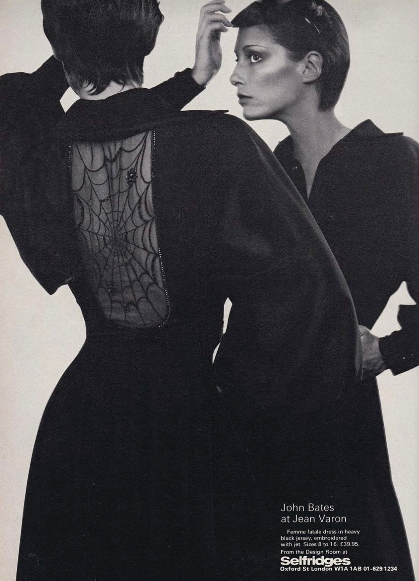Notes on Designer: John Bates was a highly regarded British designer who began his label Jean Varon in 1959. Famous for sheer panels, short hemlines and bare midriffs, he was one of the pioneers of the miniskirt and trousers for women. He chose the name Jean Varon in order to appear to be French and also because it meant he was the only designer under the letter 'V' in the rag trade book. In 1965, he designed outfits in Op Art prints for Diana Rigg for her role as Emma Peel in The Avengers. John Bates, along with Ossie Clark, Gina Fratini and Bill Gibb, pioneered a romantic and dramatic mood in fashion in the early 1970s.