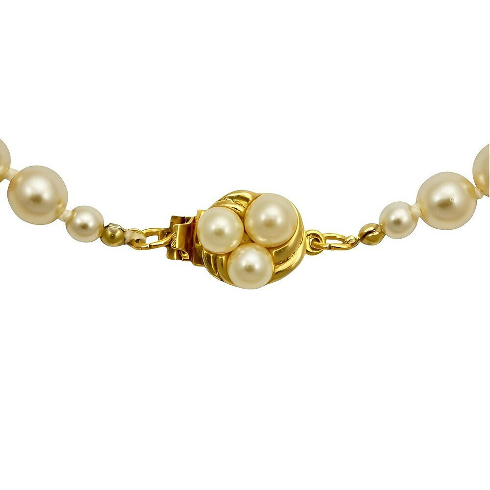 This is a classic faux pearl necklace with a lovely gold plated clasp. Circa 1980s.