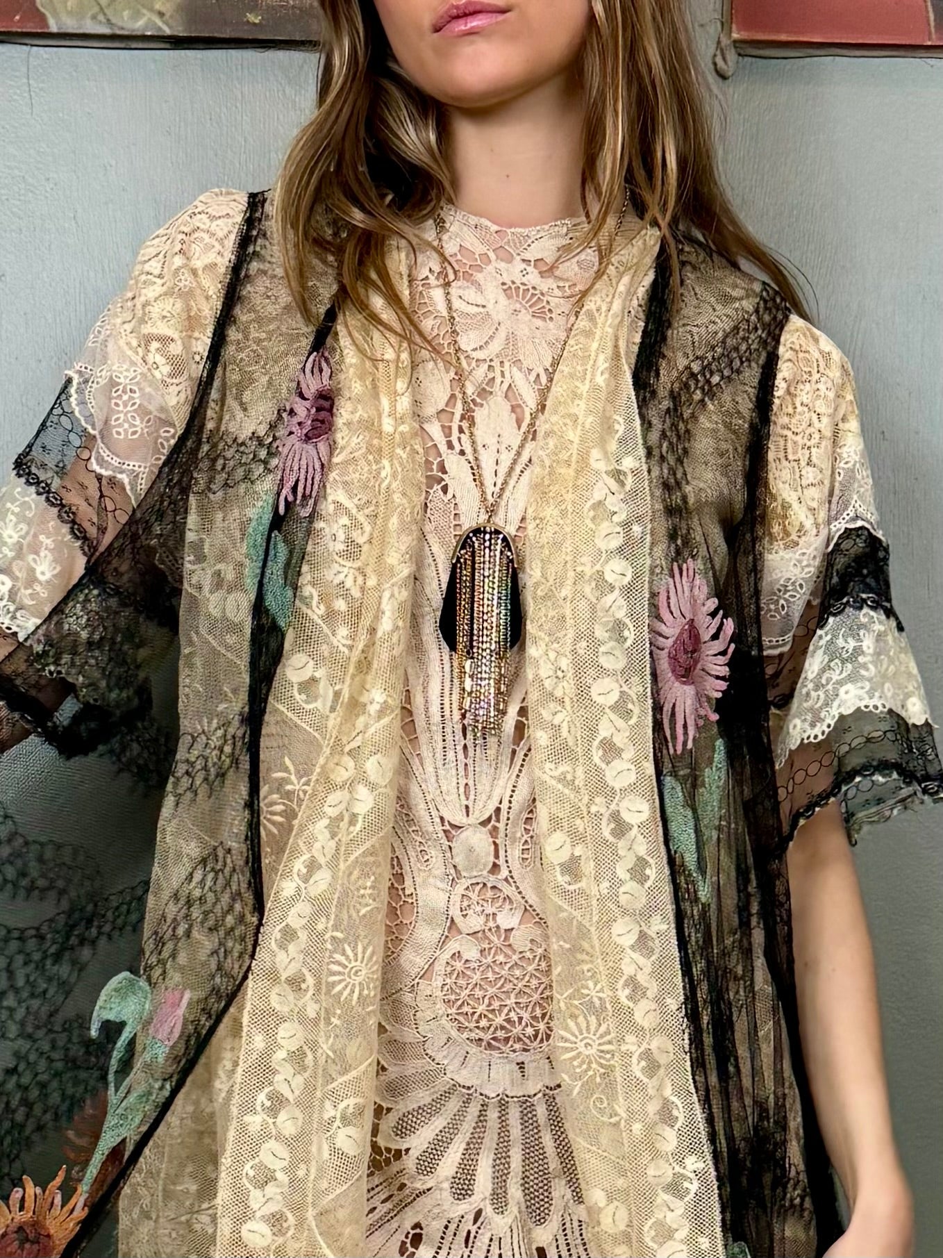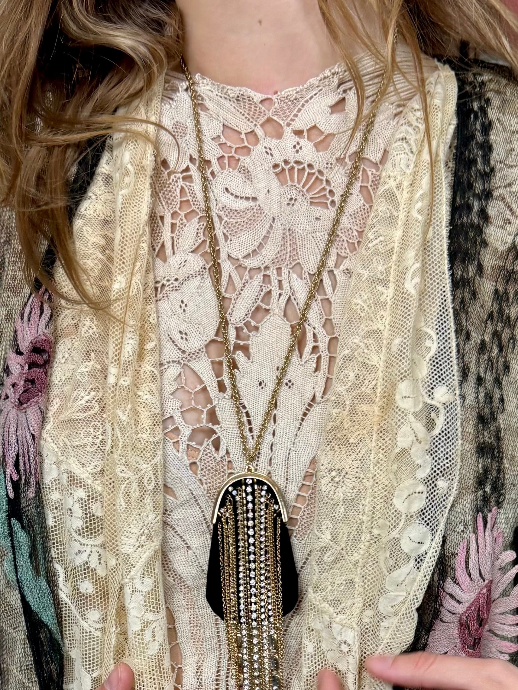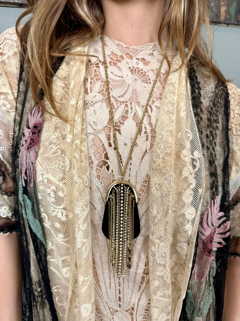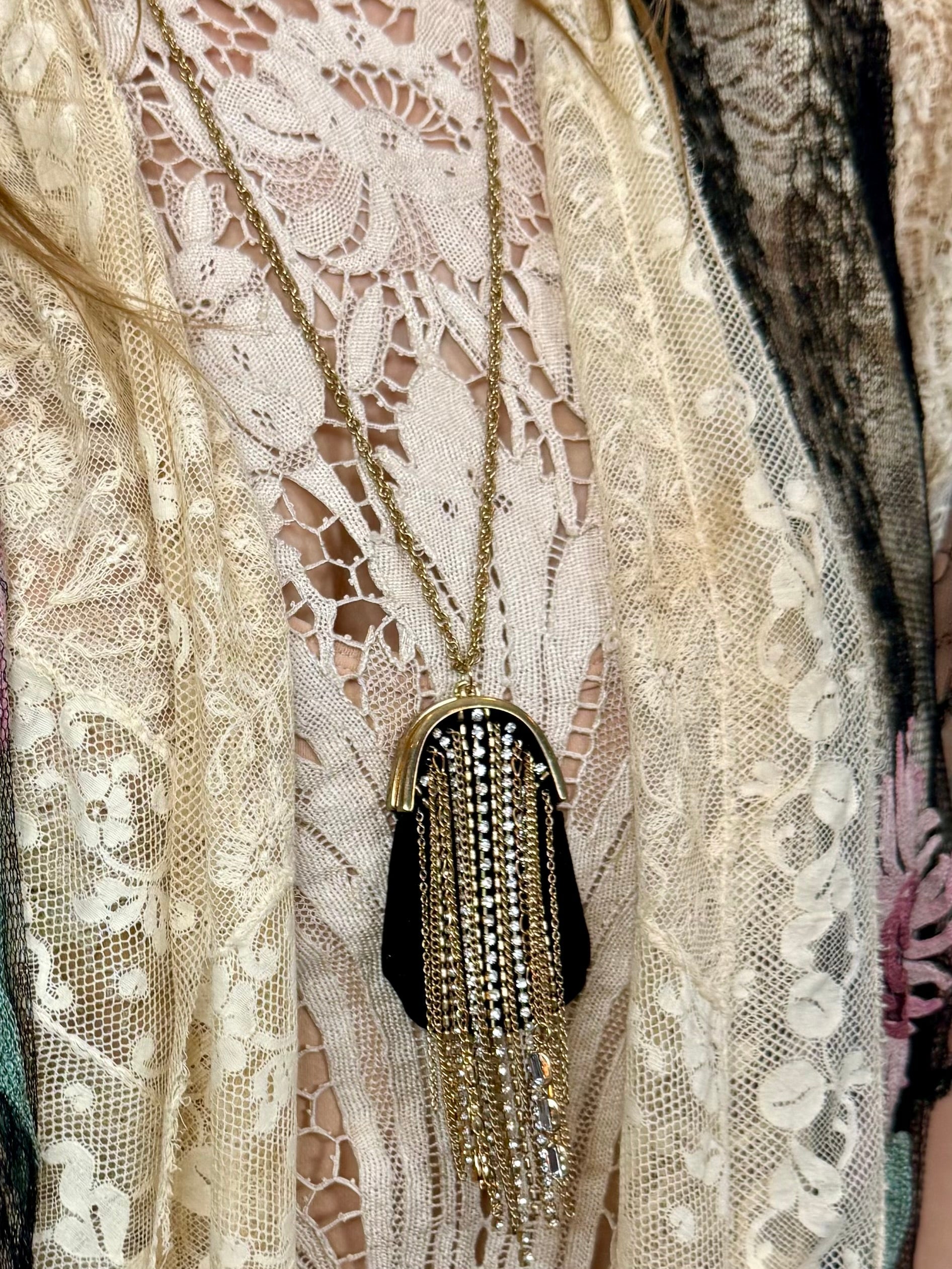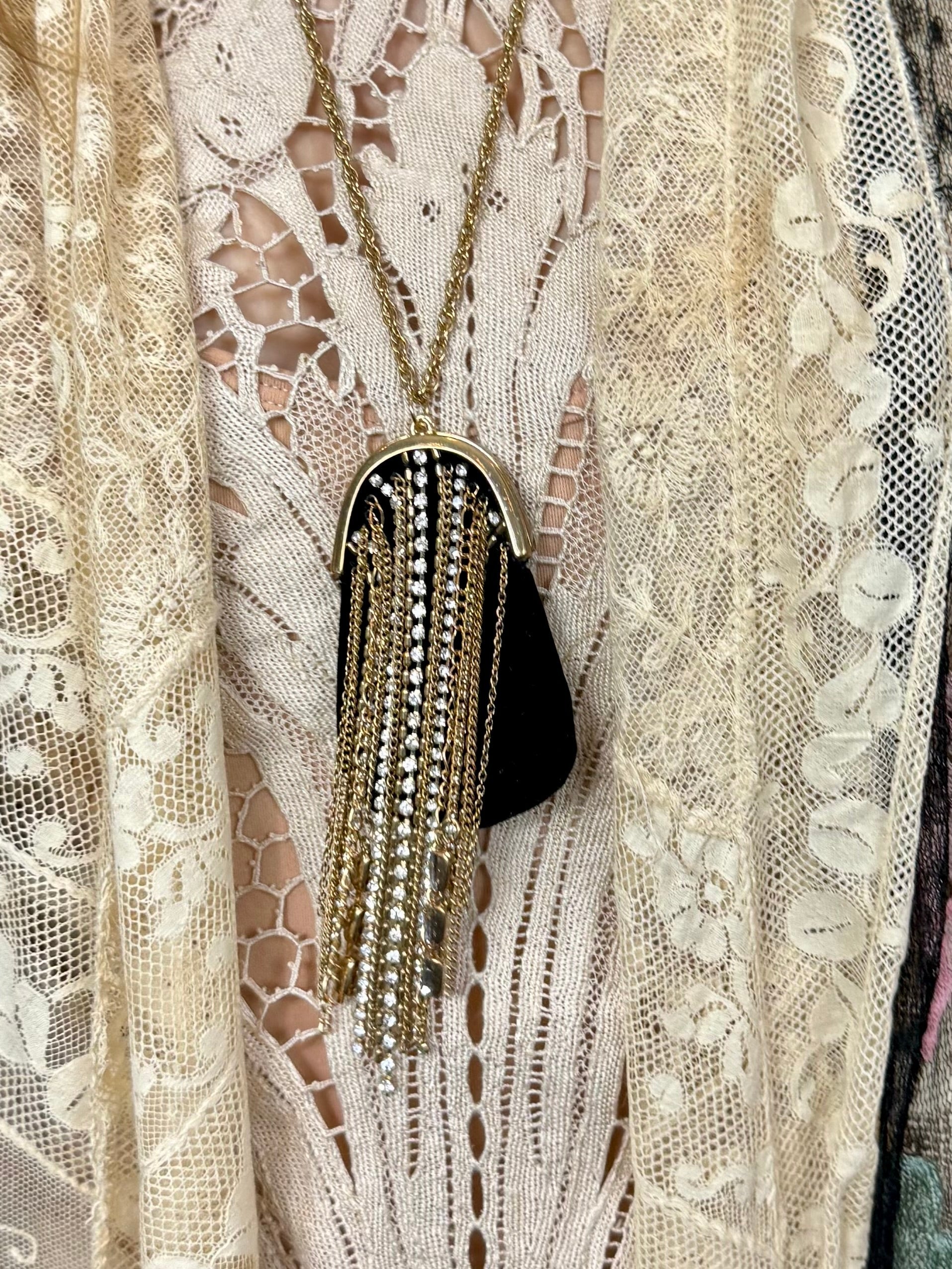 This 20s black mini velvet purse necklace features elegant fringing, sparkling diamanté strands, and a gold plated chain. Elevate any outfit with this unique accessory, perfect for a night out or special occasion. Purse doesn't open and its as a charm.