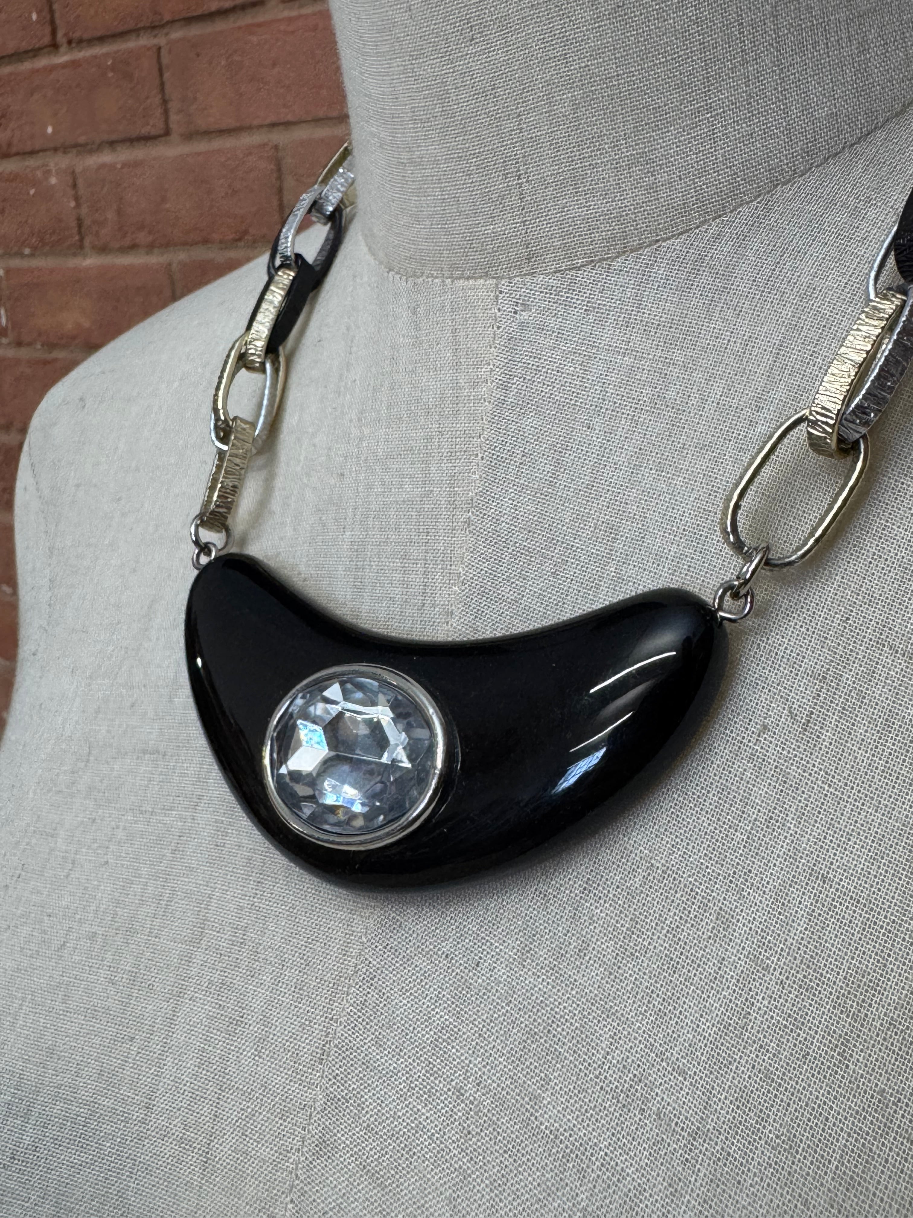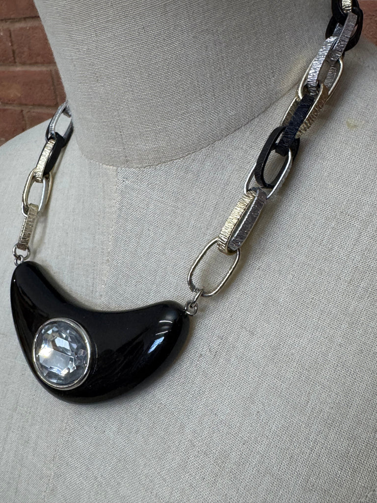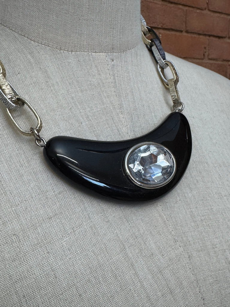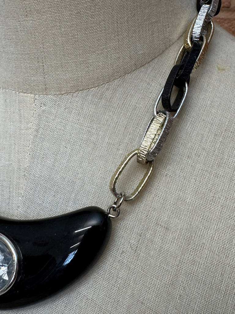 This one-of-a-kind reworked vintage statement piece showcases Jasmir's distinctive craftsmanship, featuring a 70s Bakelite  half moon design and central crystal element. The substantial silver chain mail necklace creates dramatic visual impact while maintaining wearability with a secure back fastening. A rare collector's piece that embodies the era's bold aesthetic with contemporary sensibility.