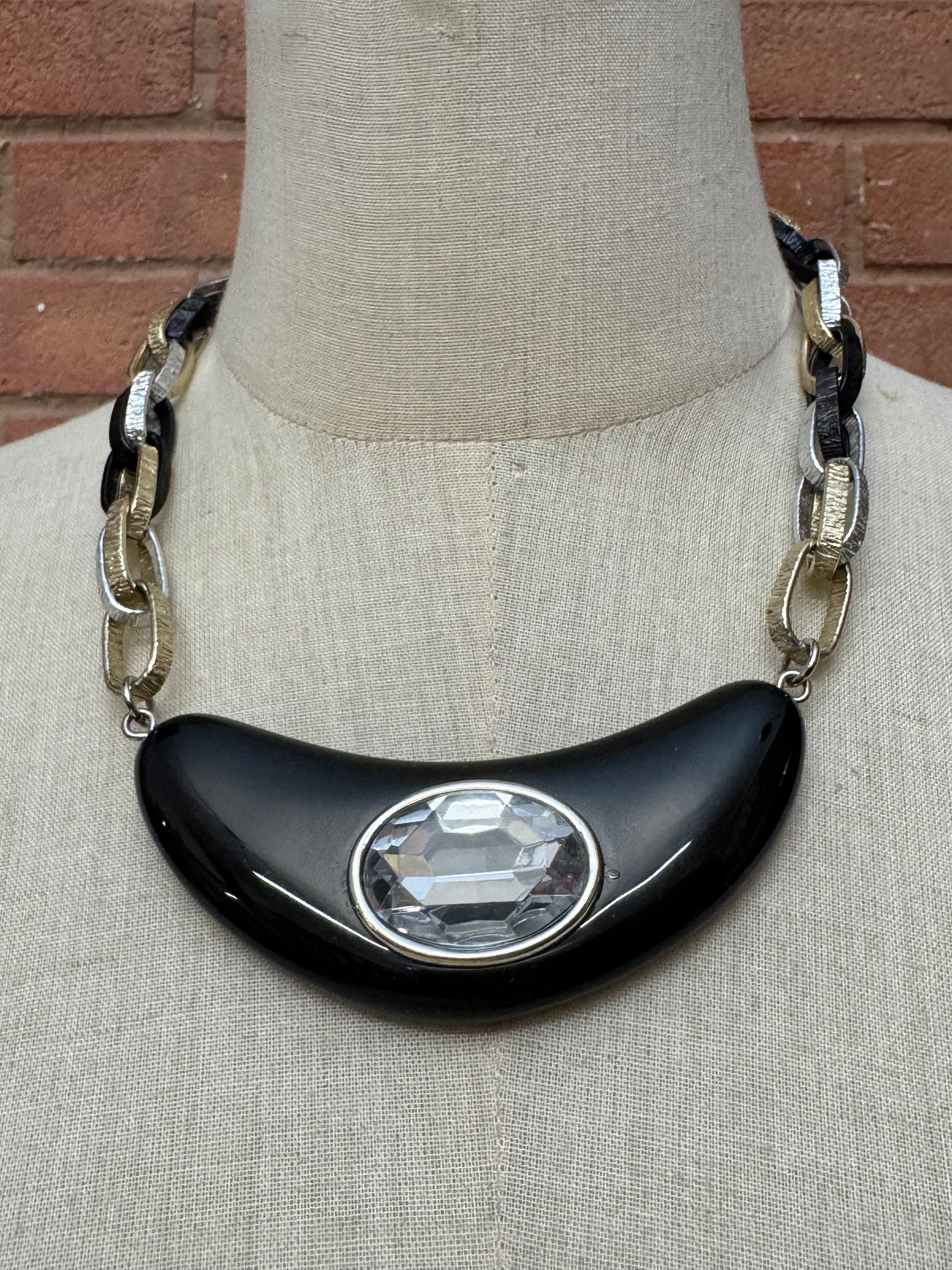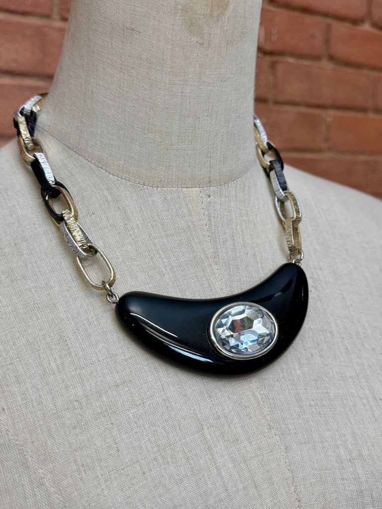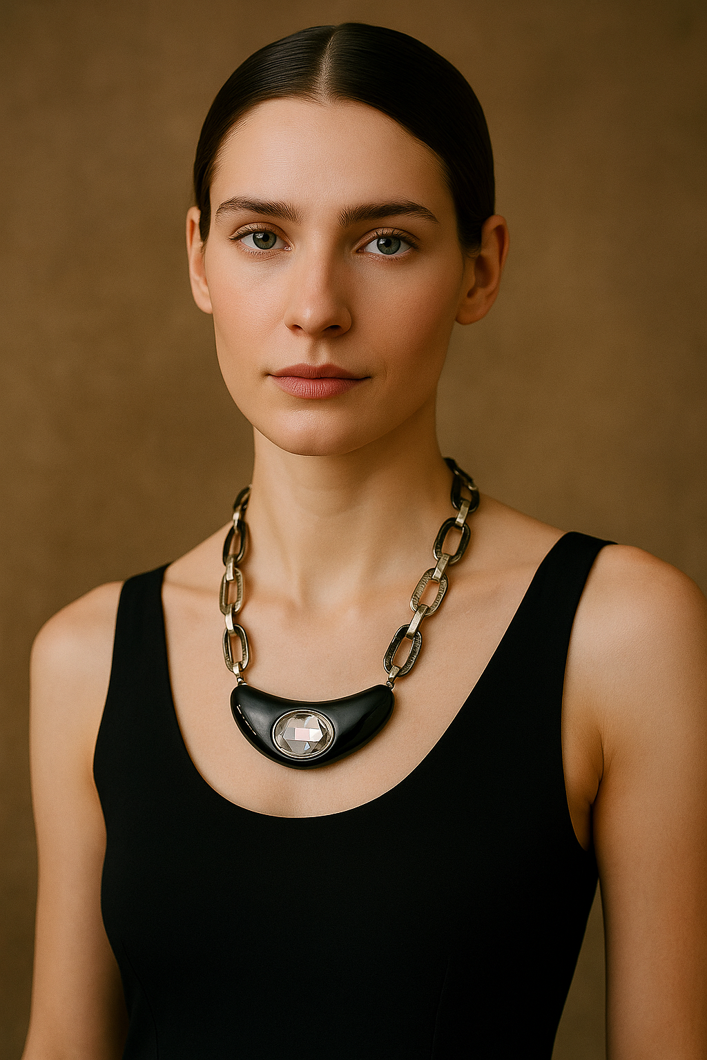 This one-of-a-kind reworked vintage statement piece showcases Jasmir's distinctive craftsmanship, featuring a 70s Bakelite  half moon design and central crystal element. The substantial silver chain mail necklace creates dramatic visual impact while maintaining wearability with a secure back fastening. A rare collector's piece that embodies the era's bold aesthetic with contemporary sensibility.