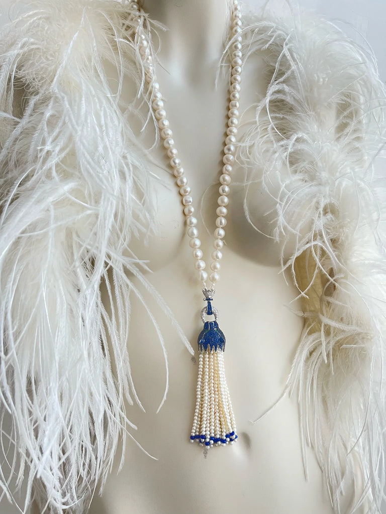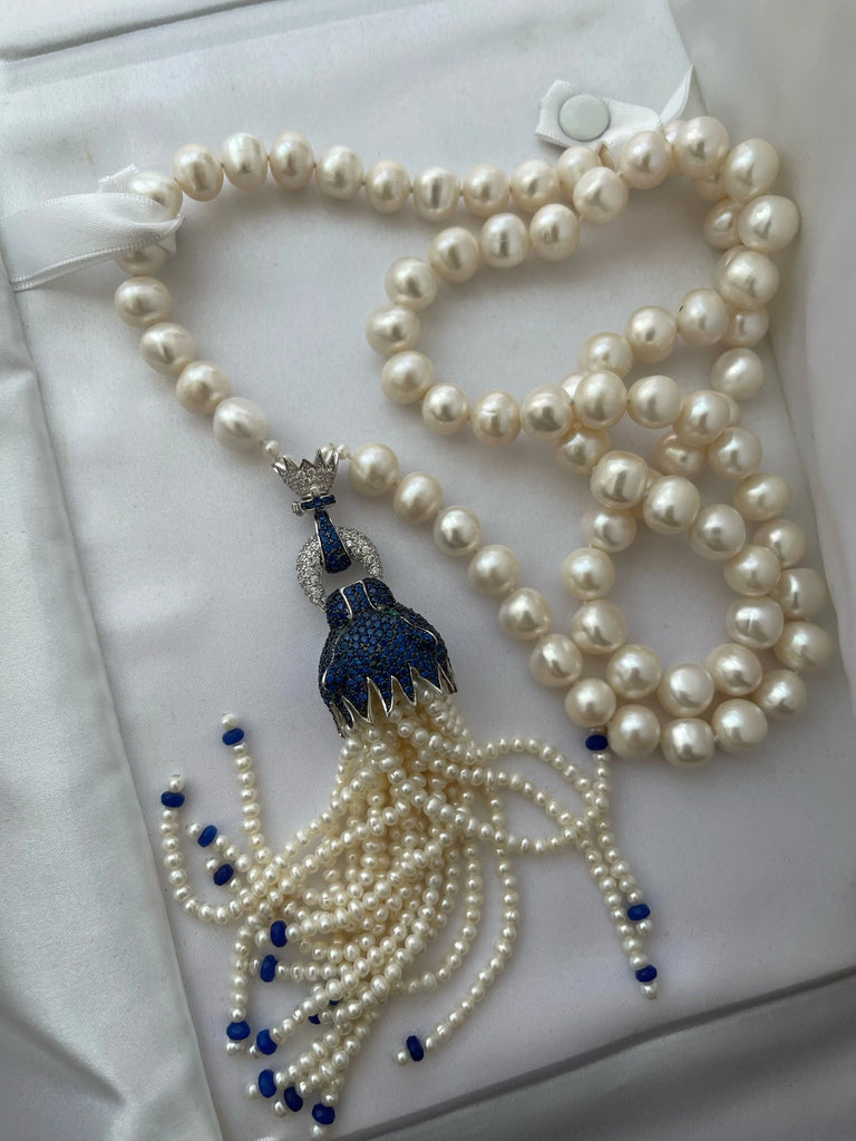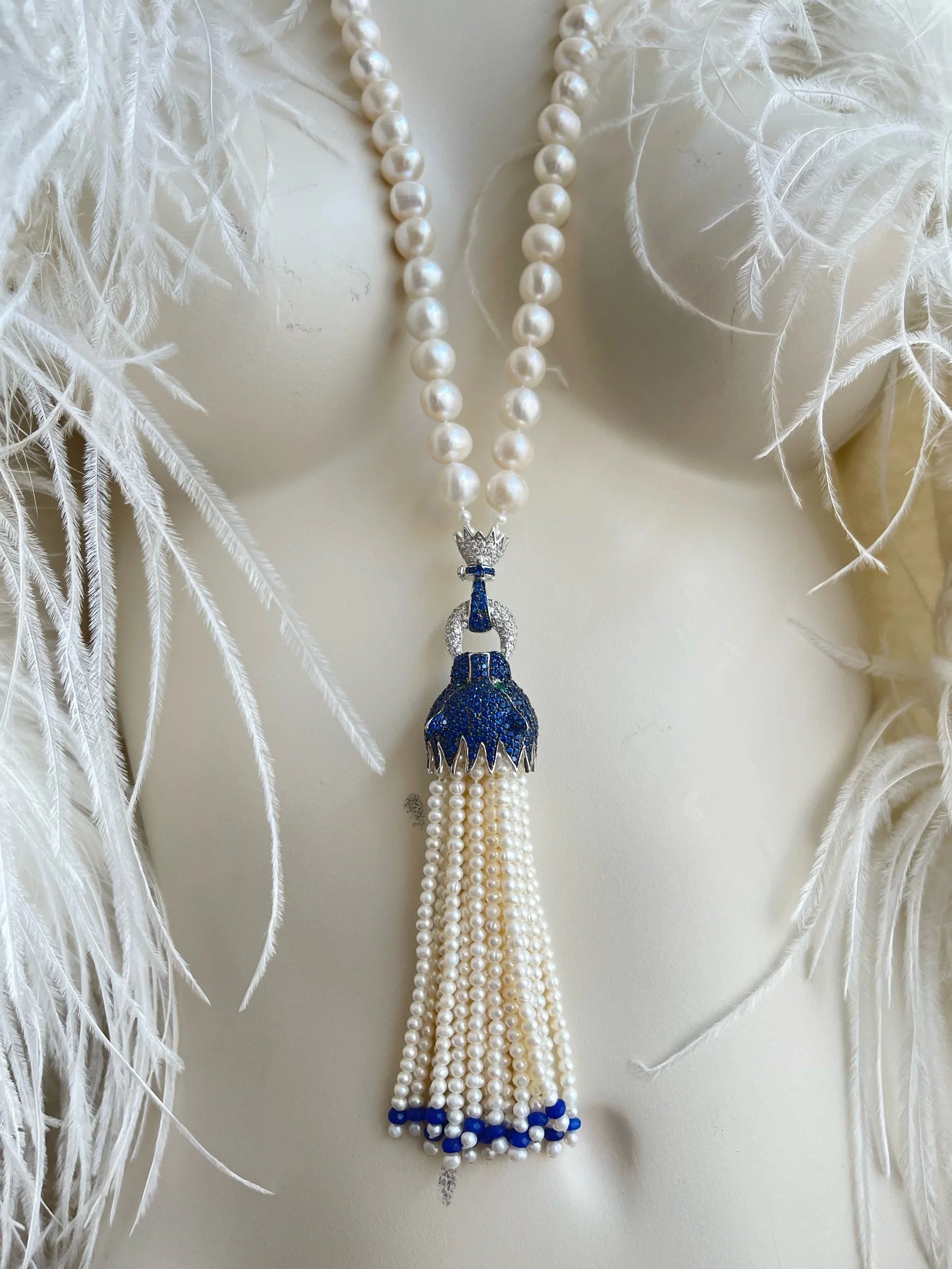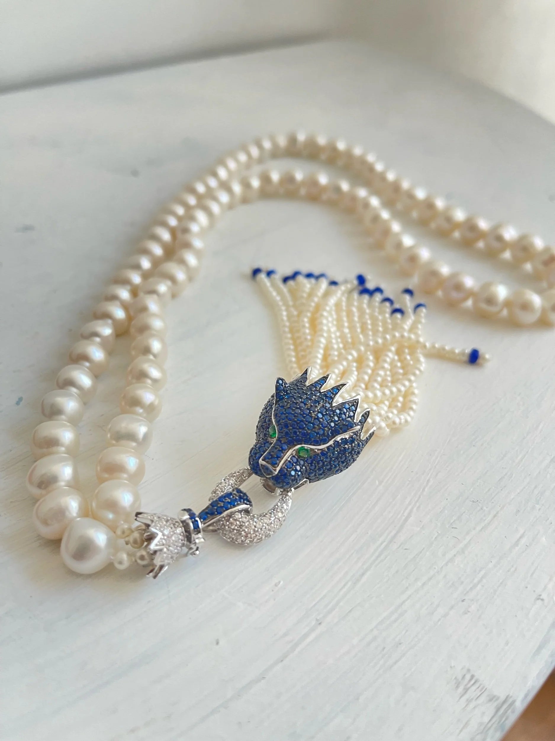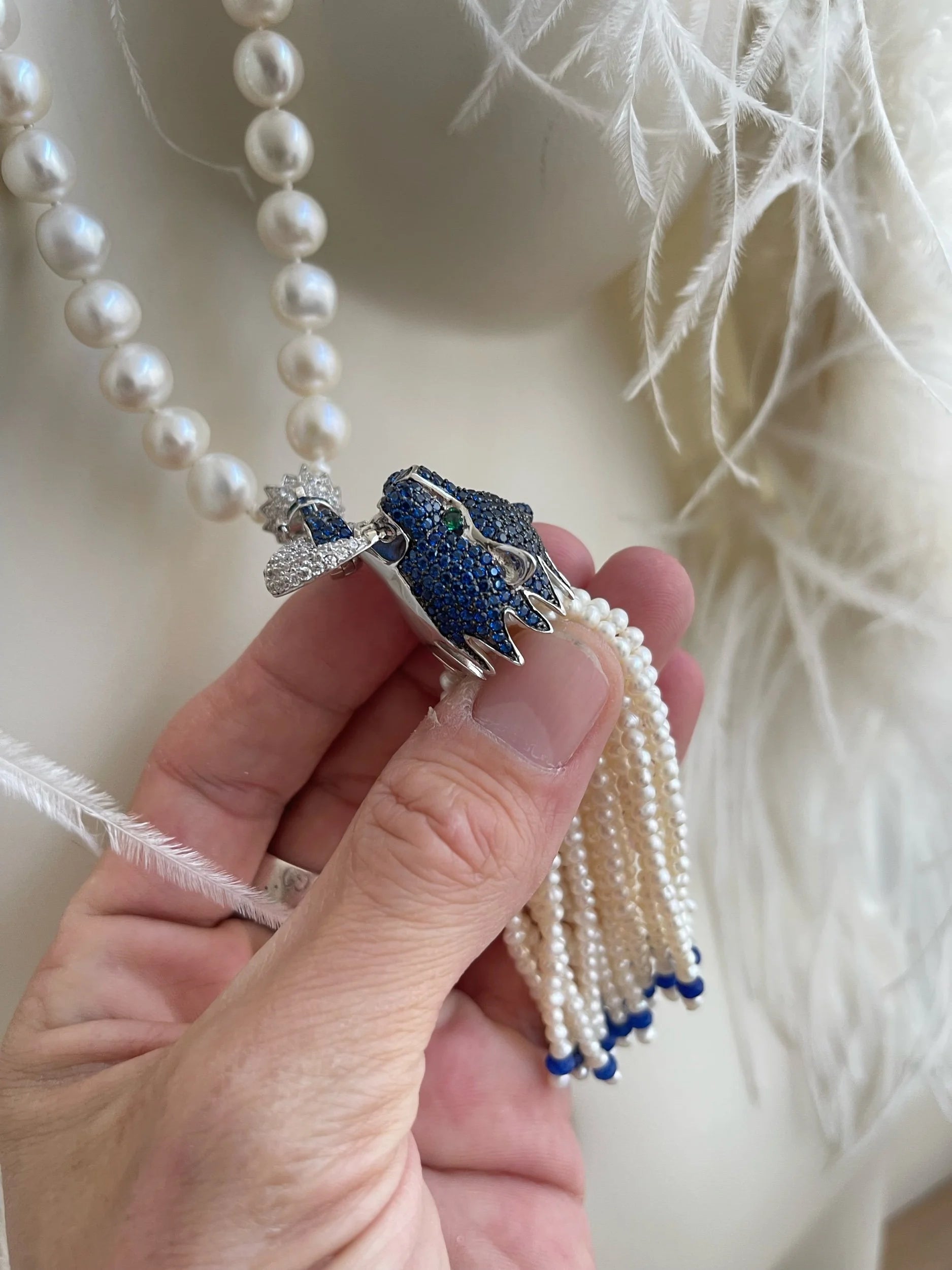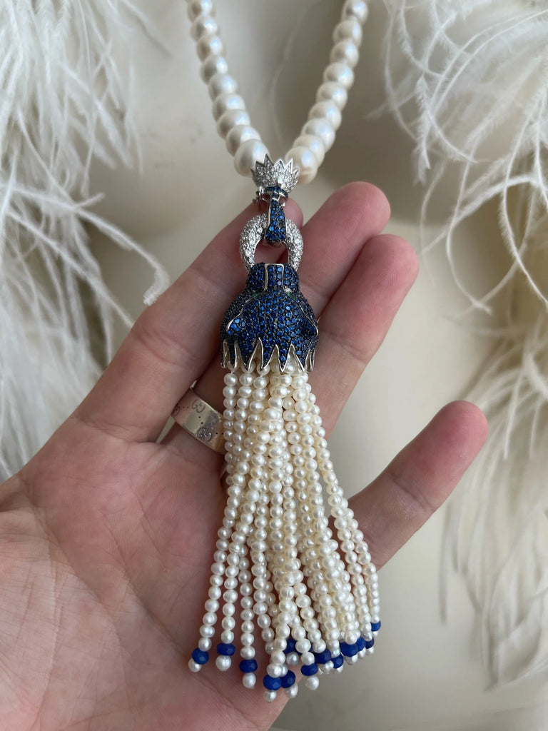 An exquisite statement necklace featuring a striking silver-plated panther head, encrusted with shimmering blue and green crystals. From the panther’s mouth hangs a luxurious tassel of lustrous pearls, adding movement and elegance to this dramatic design.