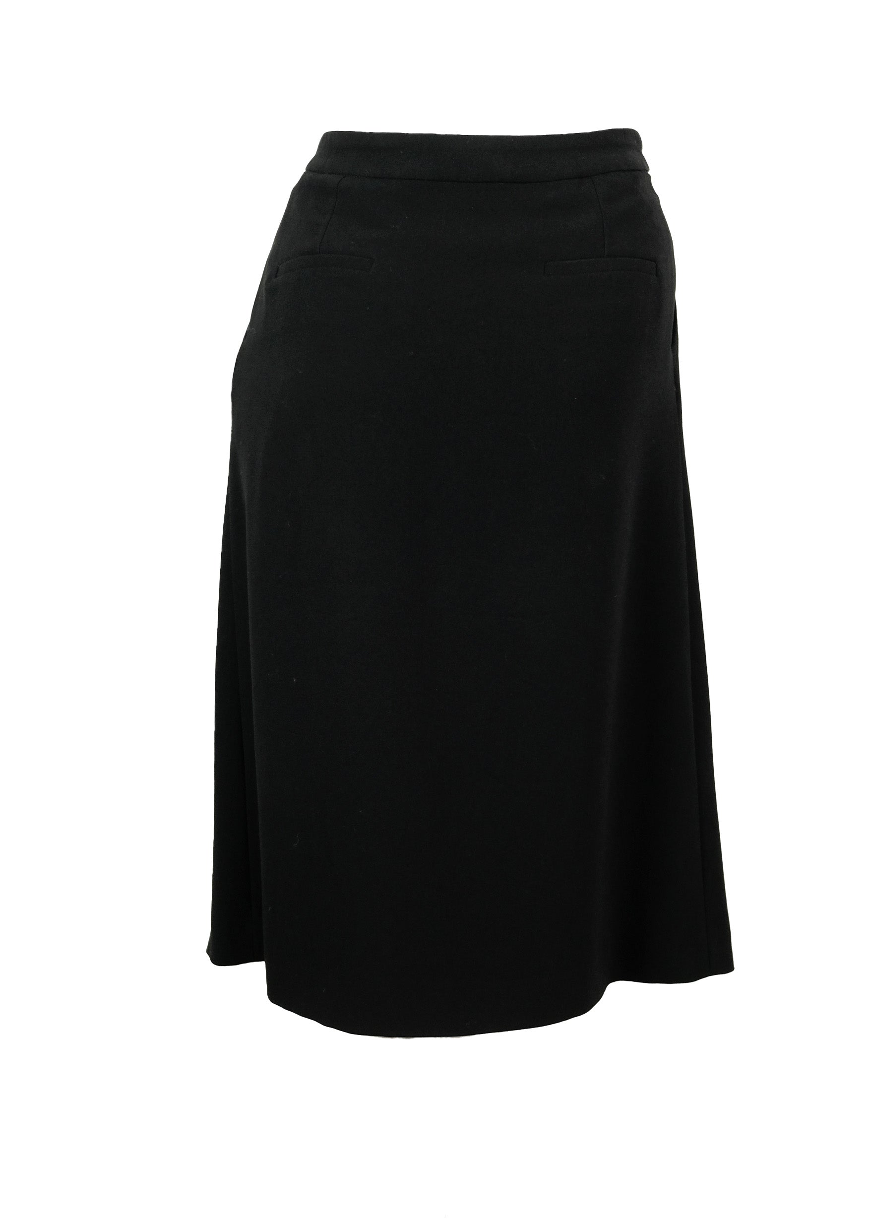 A flattering A-line skirt in black crepe by Joseph, featuring a high front split with double facing pleat. It ends below the knee and has a central zip fastening with side pockets and shallow back pockets. Fully lined.