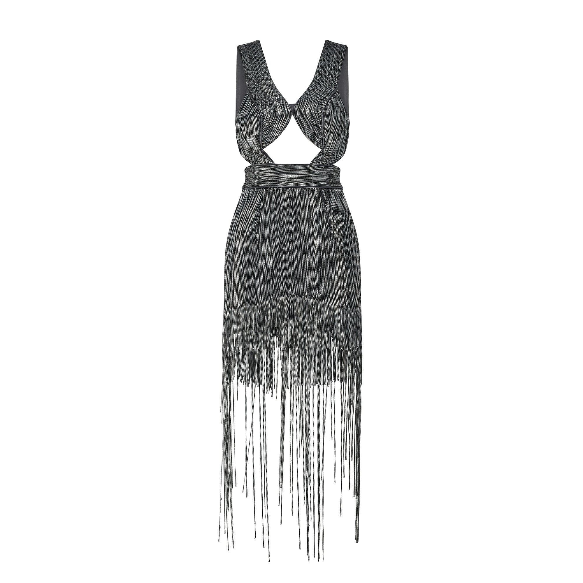 We believe this dress was one of the stand-out pieces from this show, walking the runway as the final look and ensuring a dramatic and memorable ending. Tailored from thick black cotton with black leather piping at the hems, it has a body-con, hourglass silhouette. The top is crafted in a racer-style with a cut-out at the waist and a sensuous open-back. The heavy chainmail embellishment and thick fabric are cleverly placed to weave across the body and protect the wearer’s modesty. What appears like beadwork is actually revealed to be silver-tone metal chains up-close. These echo the curves of the body, falling from the bottom hem of the mini-skirt to create a multi-length fringe. The dress is lined with smooth black silk for a comfortable, luxurious wear. It fastens at the back of the skirt with a silver-tone exposed zip and at the back with three black hook-and-eye clasps.