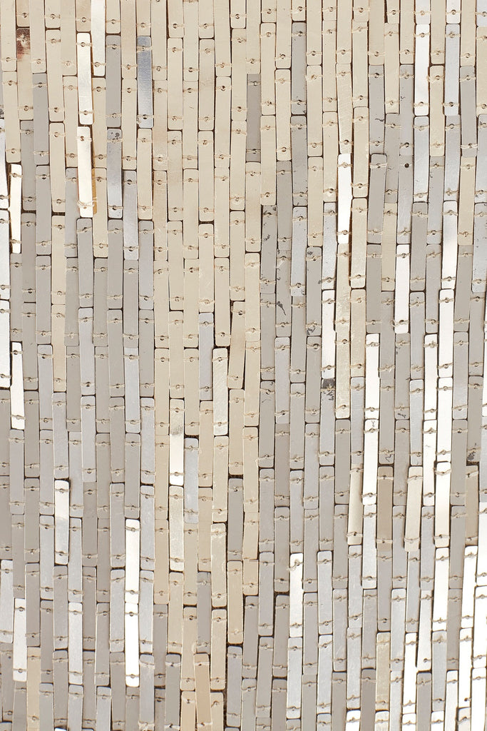 This glittering two-piece walked the runway as look 45/57. Tailored from a fine mesh in a pale nude hue, both pieces are tailored to a body-con fit. This ensemble is elaborately sequinned all-over with large rectangular paillettes in gold and silver. These form subtle horizontal zig-zags across the cloth, making the pieces appear to shine both colours at once. The paillettes are all individually stitched at each end with a tonal pale thread onto the mesh. The top is tailored to a cropped style with a rounded neckline and boxy armholes. At the back, it fastens with a large exposed gold-tone zip with chunky zip-pull. It is lined with beige silk. The skirt is cut to a pencil silhouette with a wide, high waistband that shapes the waist. Below this, mesh cut-outs give a sensuous skin-flashing look. The skirt has a high slit at the rear, and fastens at the back with a large exposed gold-tone zip with chunky zip-pull. The skirt is unlined.