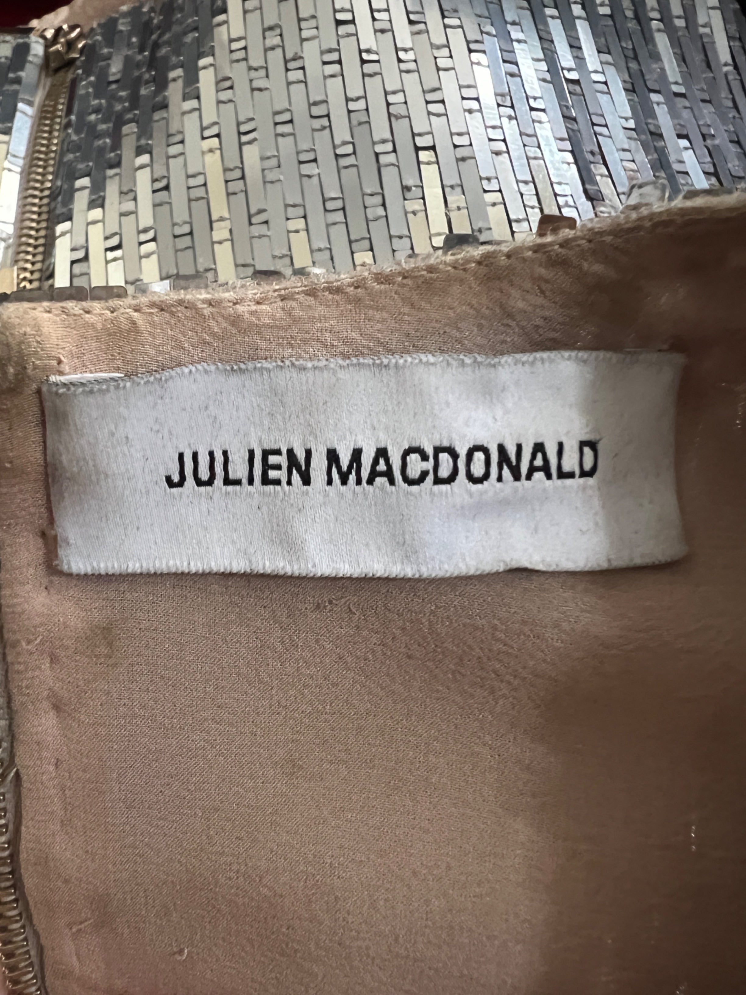Note on the designer: Julien Macdonald OBE rose to prominence in the late 1990s. After graduating from the Royal College of Art, he was hired by Karl Lagerfeld to work at Chanel, and was later appointed chief designer at Givenchy. In 1997, Macdonald launched his eponymous label and it was here that he cemented his reputation for high-octane, couture-level craftsmanship. He was named “British Fashion Designer of the Year” at the 2001 British Fashion Awards and, in 2006, he was awarded an OBE for services to fashion. Macdonald is known for his meticulous handwork, opulent fabrics, and body-sculpting silhouettes that marry traditional techniques with unabashed sensuality. His designs, often featuring intricate beading, feather work, and lacework, have made him a red carpet favorite and a key figure in modern fashion, celebrated for reviving the spectacle and decadence of haute couture in a contemporary context.