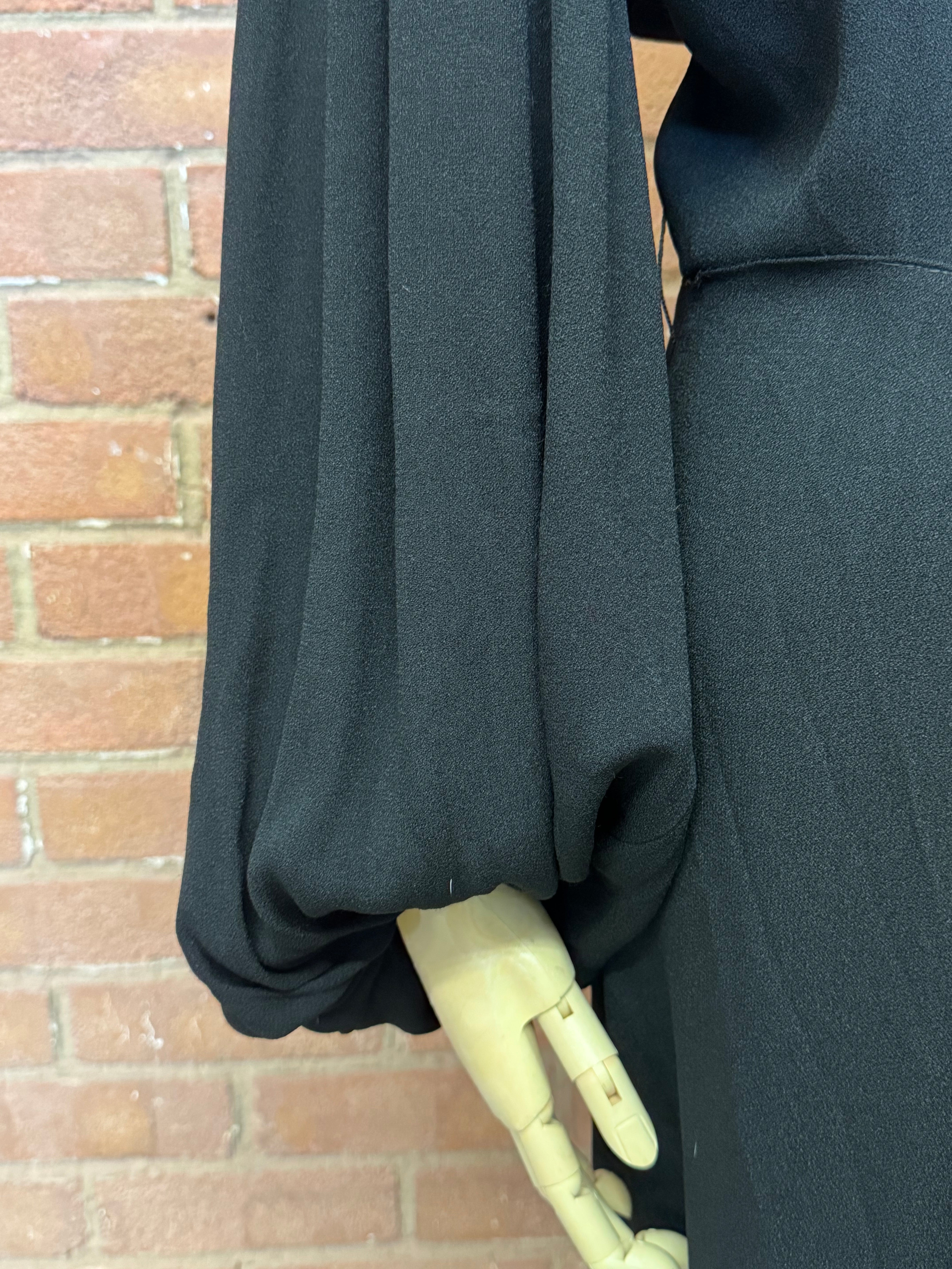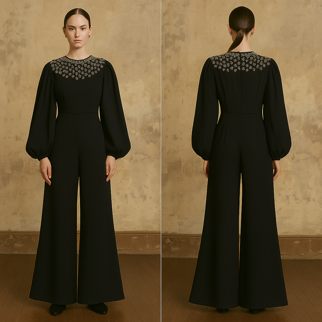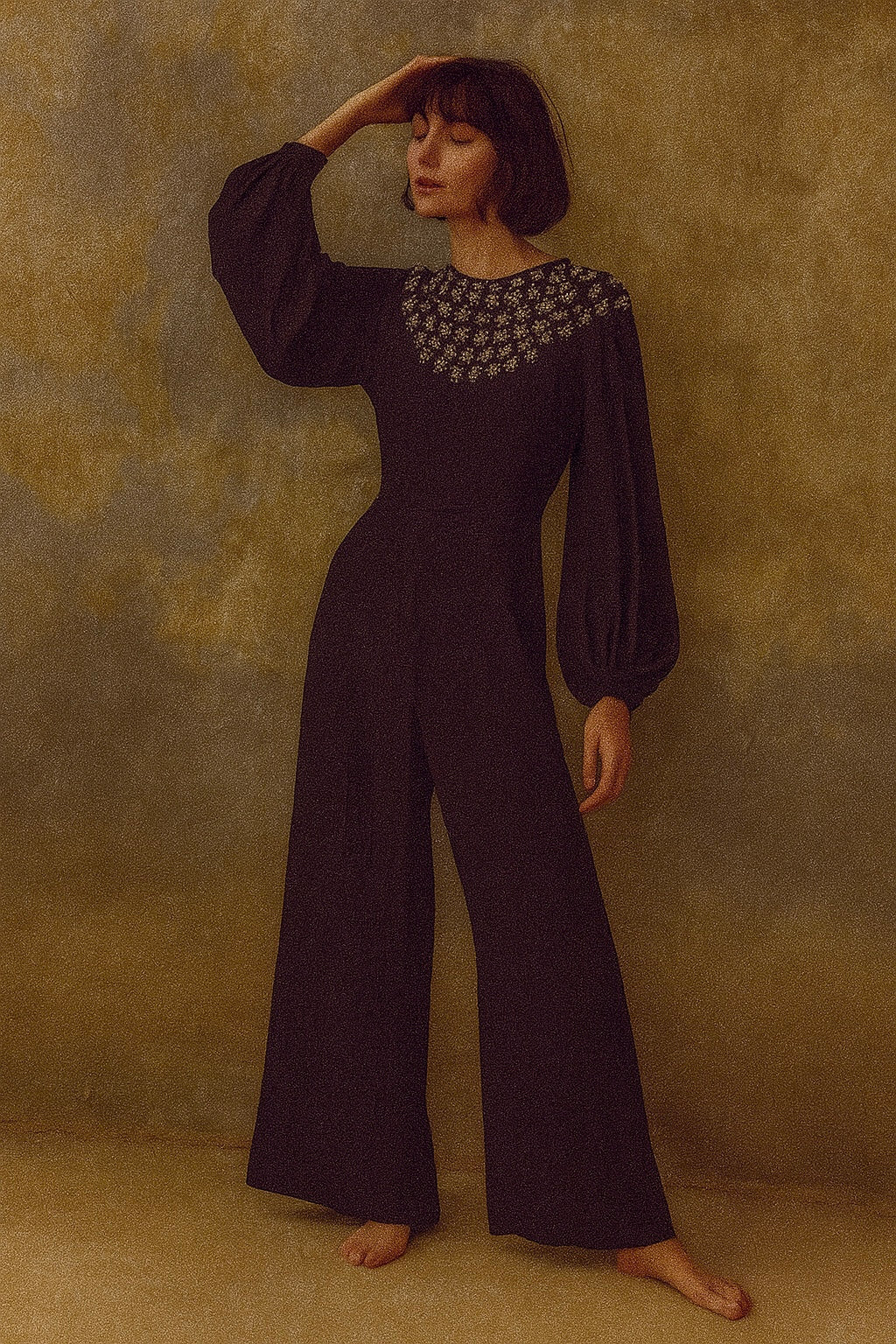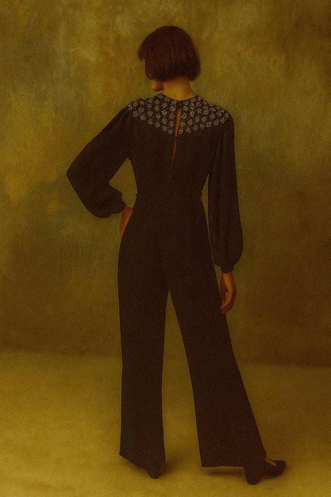 Beluga, reworked 30s black crepe and rhinestone jumpsuit with balloon sleeves