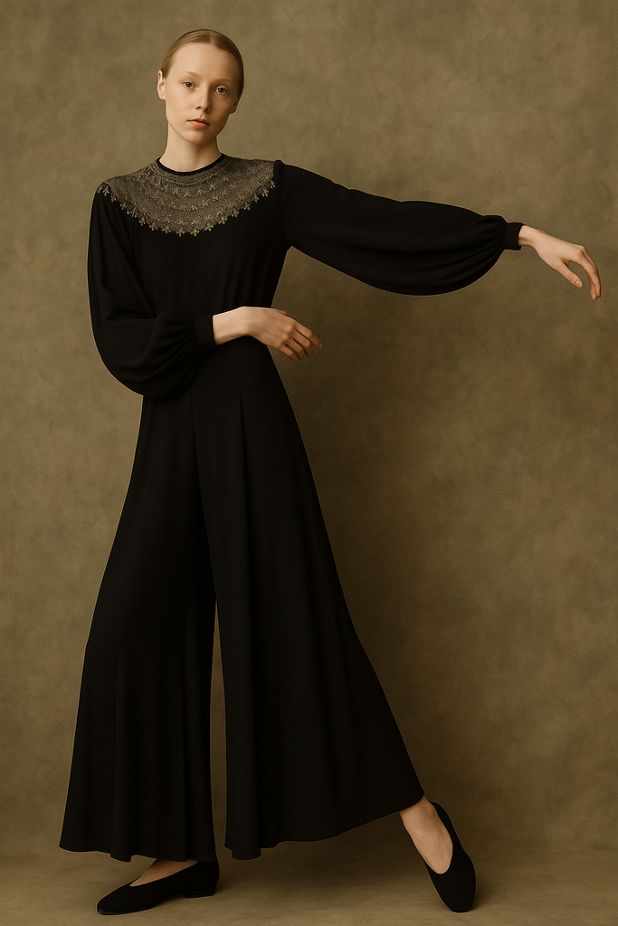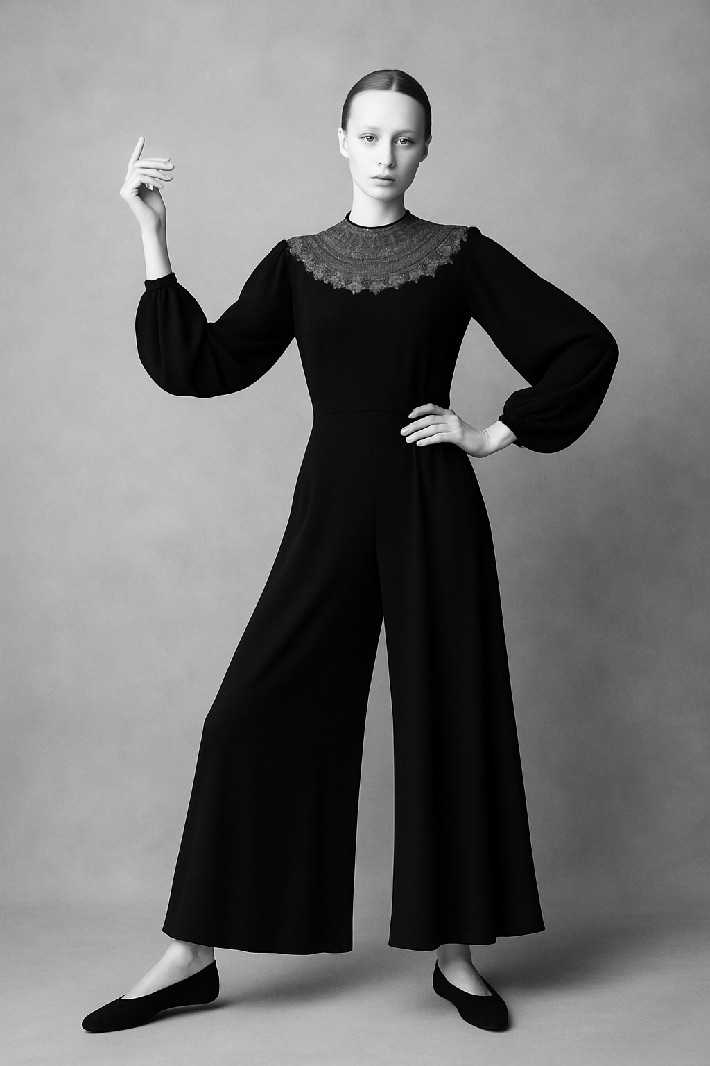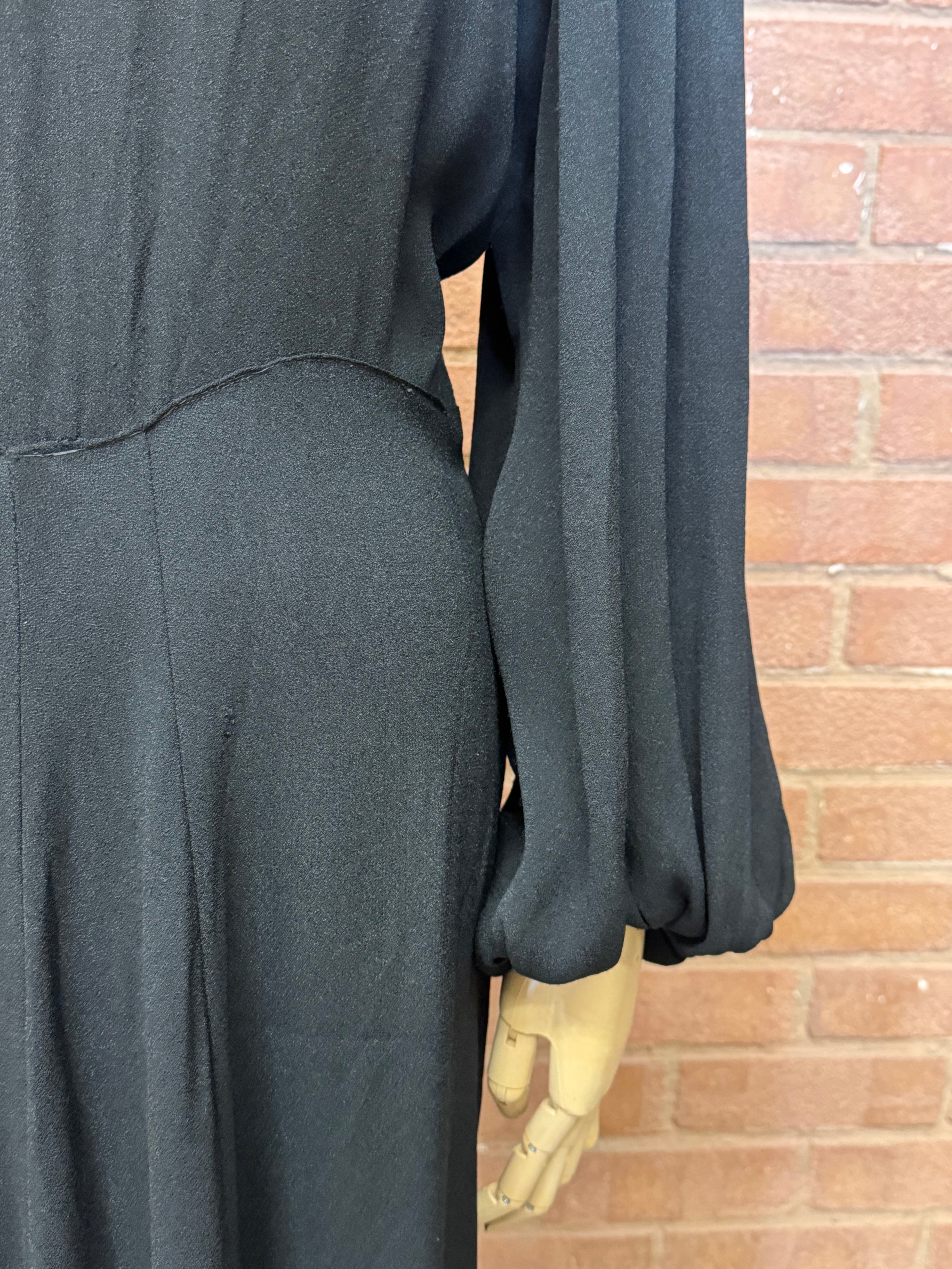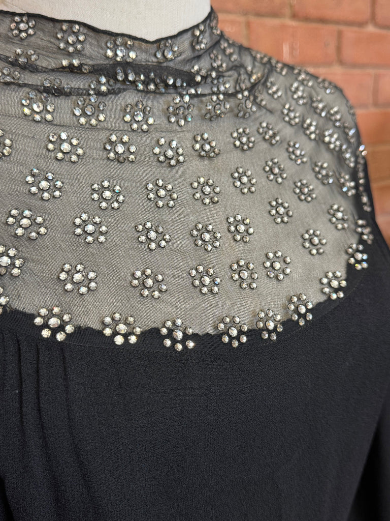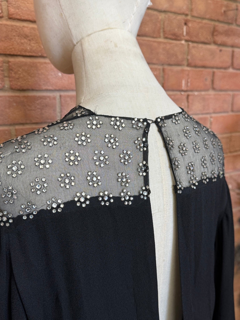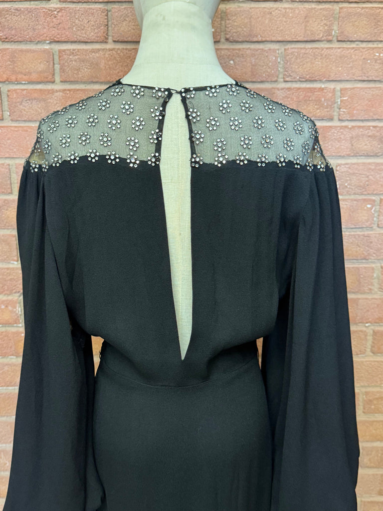 This expertly reworked 1930s black crepe jumpsuit combines vintage elegance with refined detailing. It features a round neckline in nude mesh adorned with delicate rhinestones, balloon sleeves finished with neat button cuffs, and a flattering flare silhouette that gracefully reaches the ankle. The back includes a keyhole opening, enhancing both comfort and style. Perfect for those seeking a timeless piece with distinctive craftsmanship.