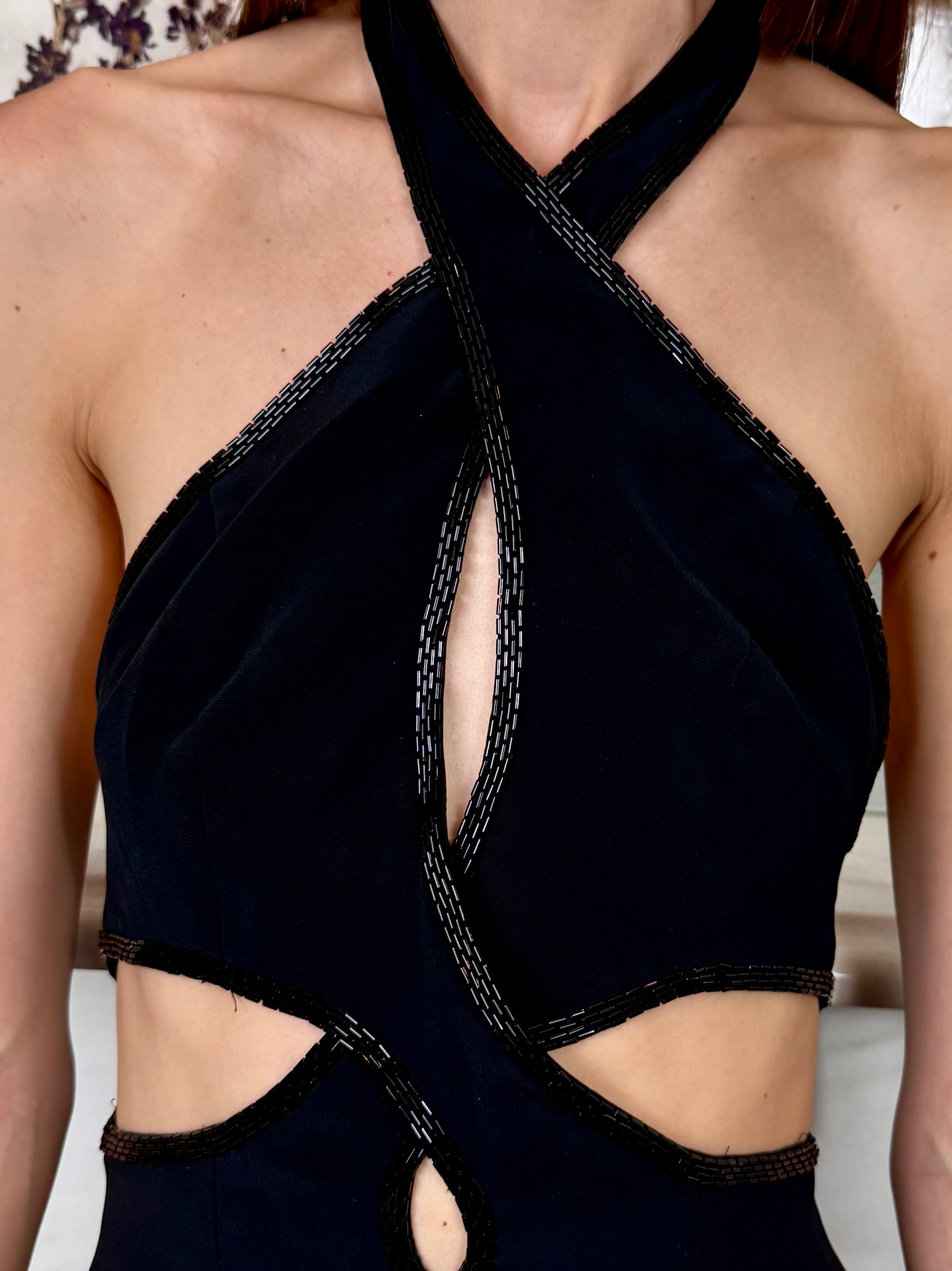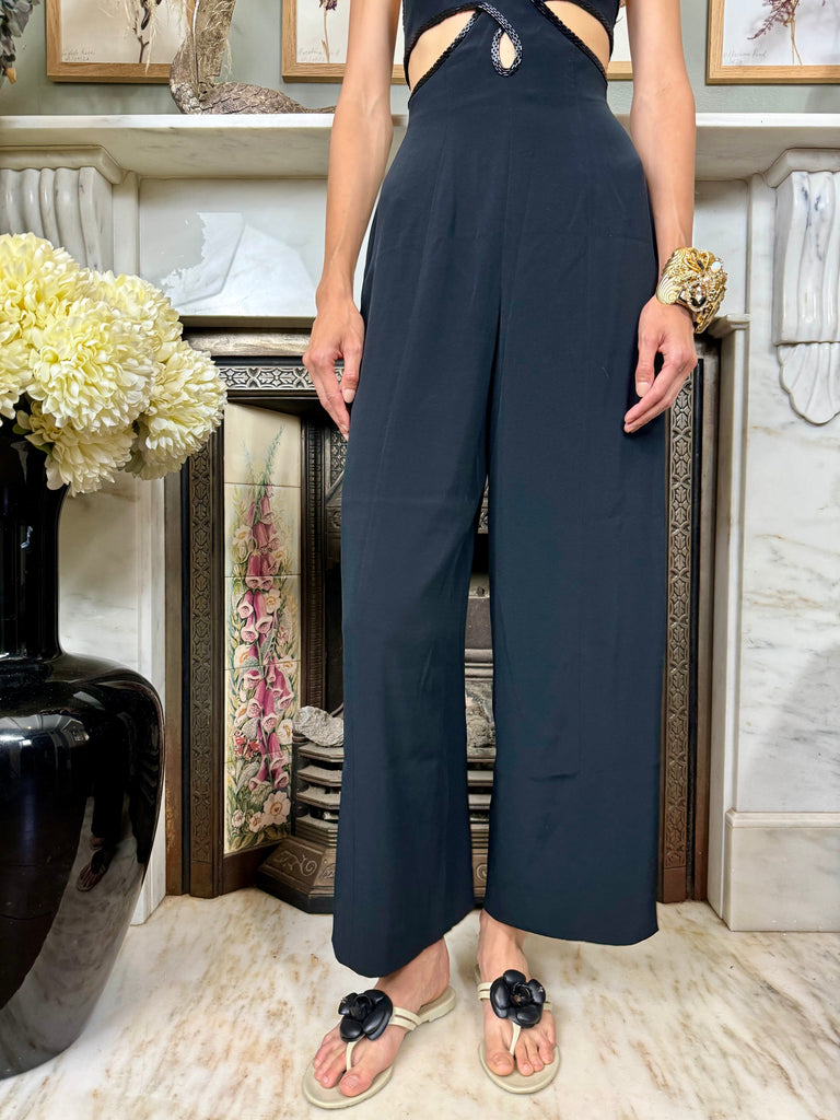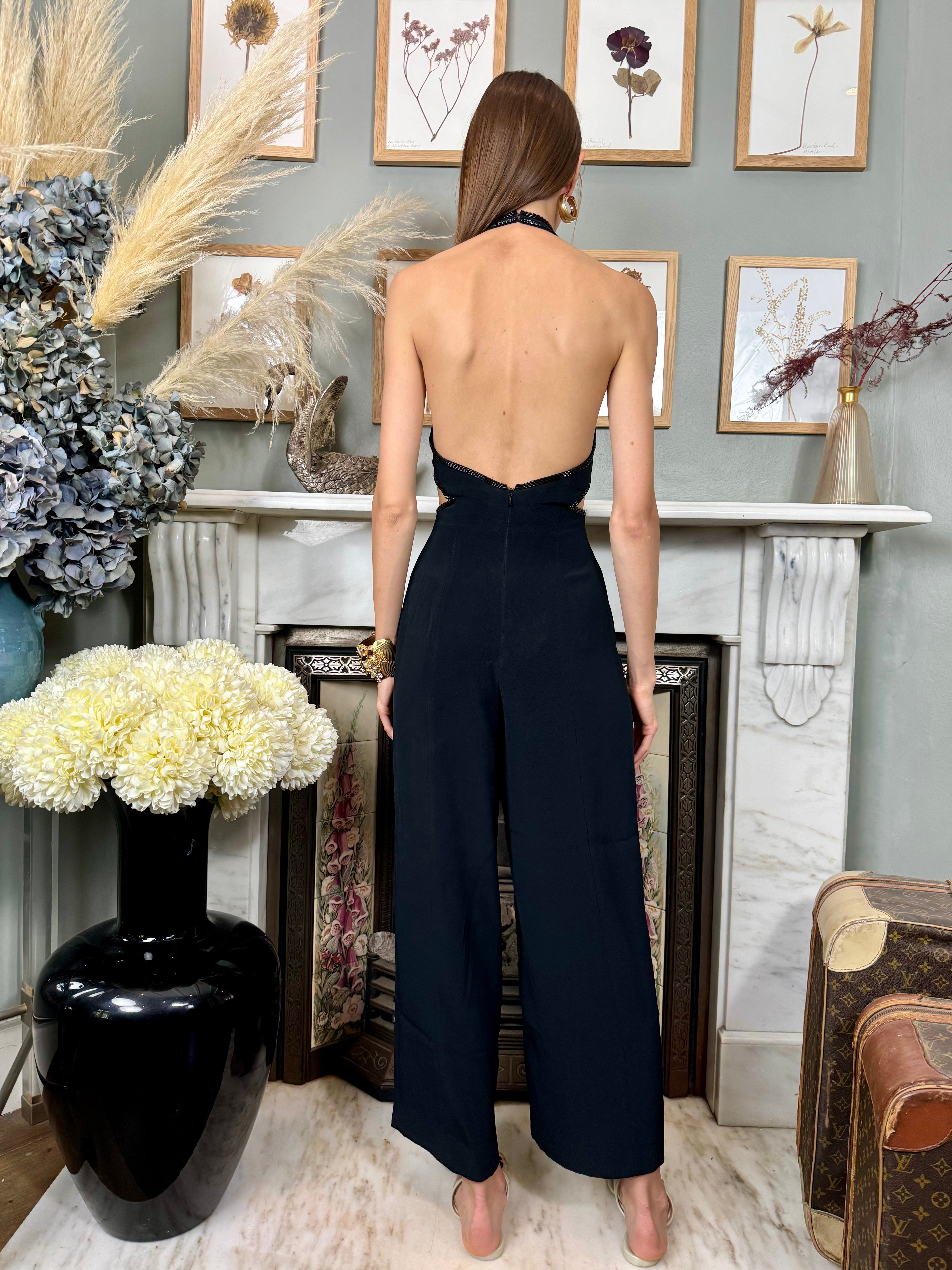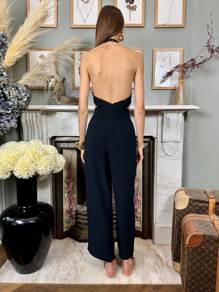 Expertly crafted with stunning black silk, this jumpsuit's 80s design will make a bold statement. Its halterneck design, back zip, and keyhole detail on the bust create a unique and elegant look. Dress it up with heels or simply pair iot with flat sandals.