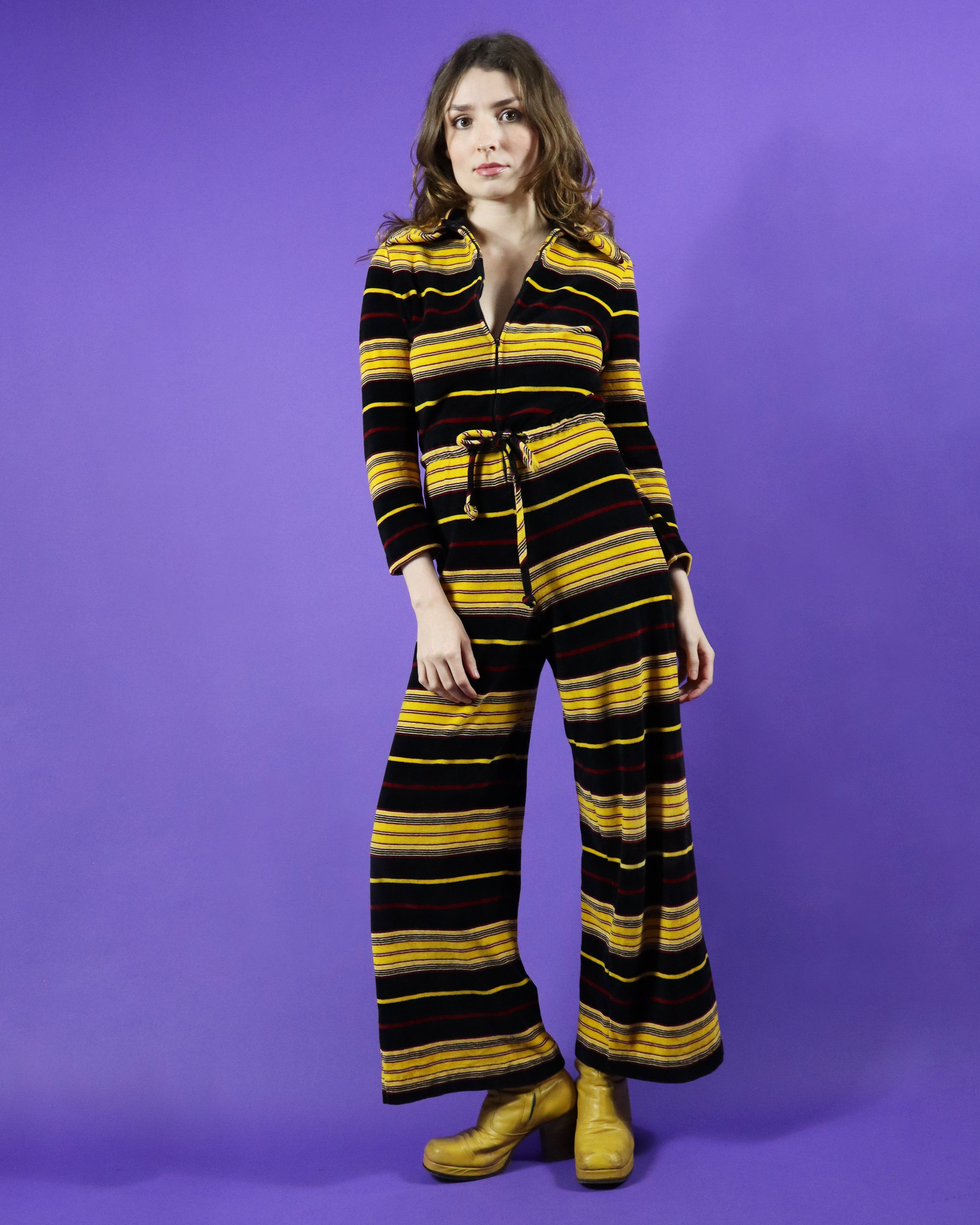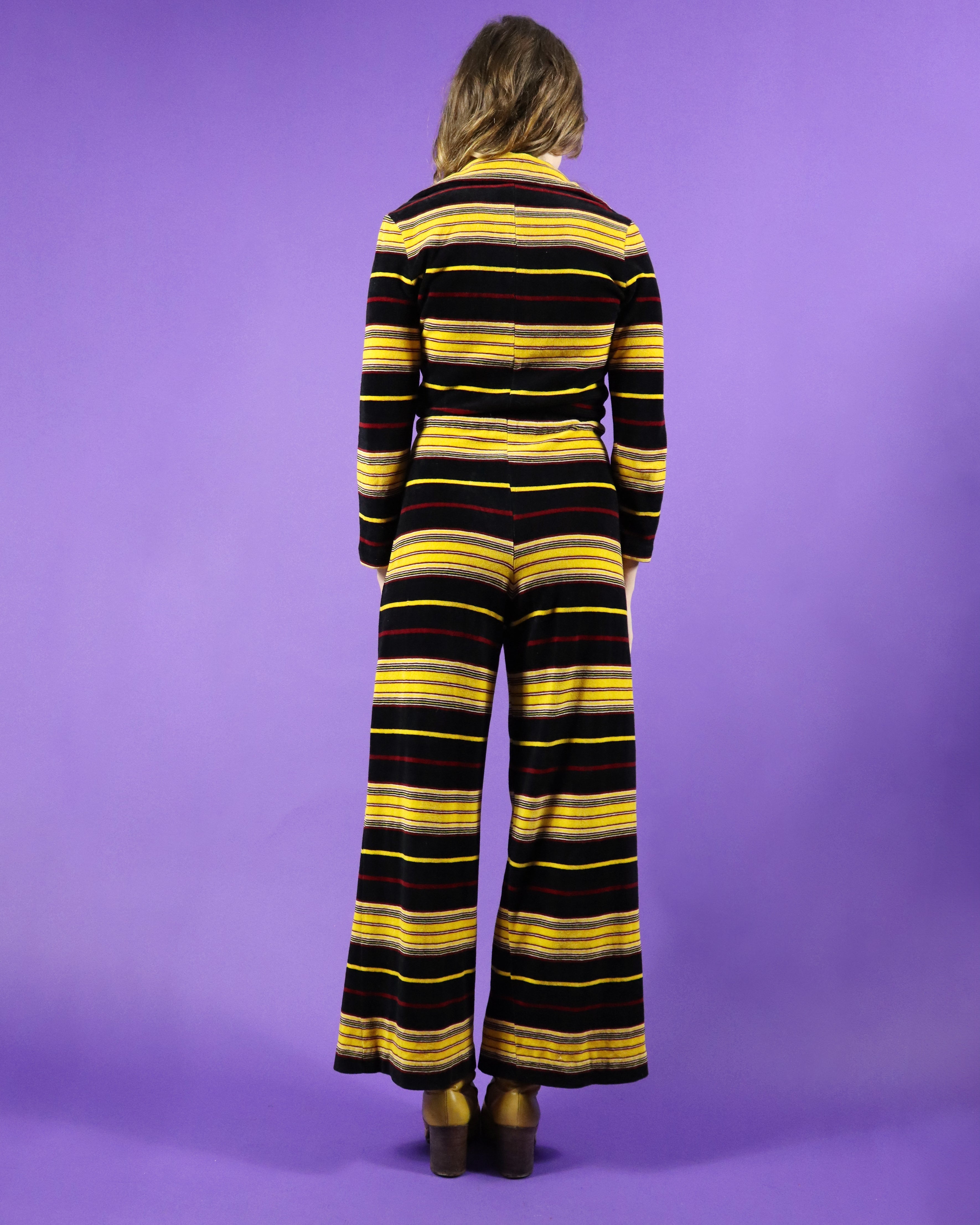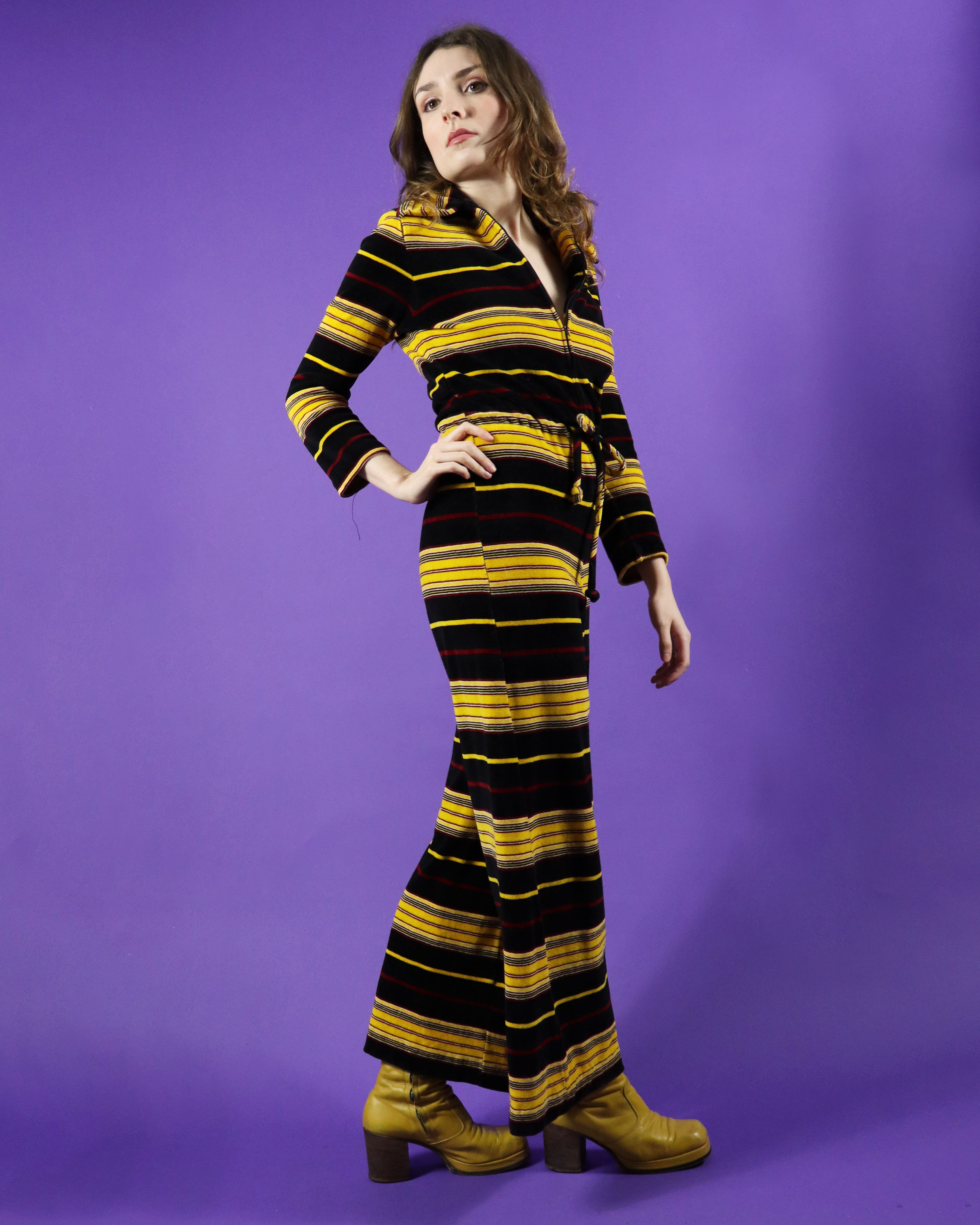 Vintage 1970s luscious velour jumpsuit. Striking stripe design in black / warm yellow / burgundy red colourway. The velour velvet used is thick and super soft- feels so great on wear! Cut with a large dagger collar, tie waist belt & wide leg flares. Could be styled up or down. A very special outfit!
