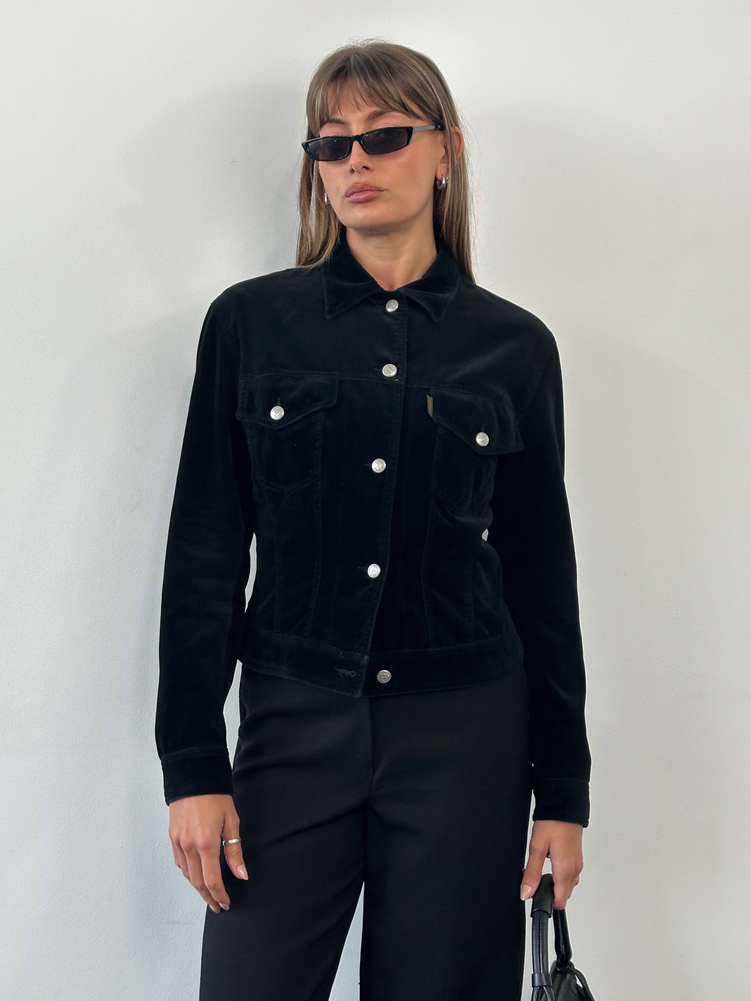 Vintage 1990s black denim jacket by Katharine Hamnett Denim, cut in Italy from pure cotton with a structured cropped silhouette and classic workwear detailing. Clean snap fastenings and a soft brushed handle.