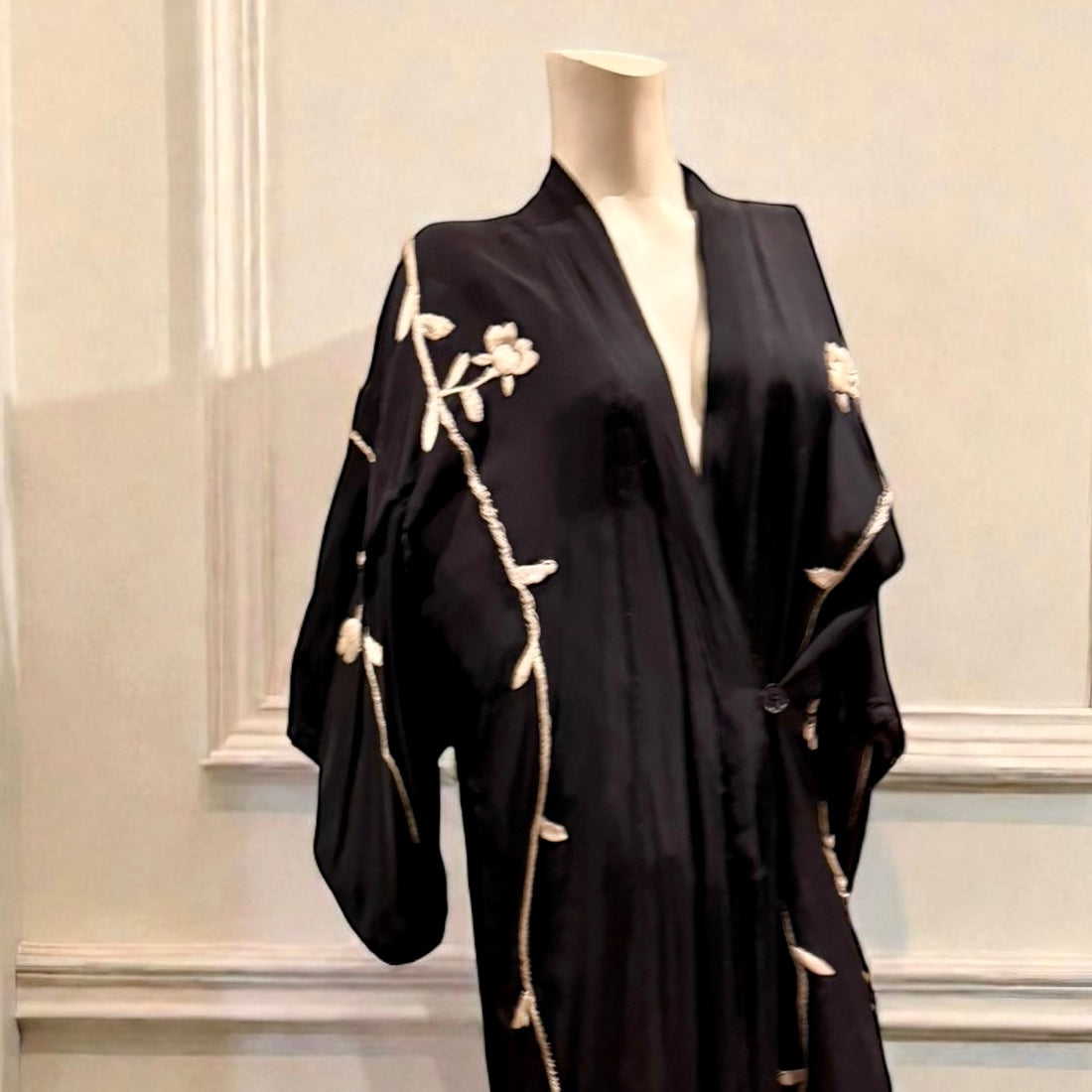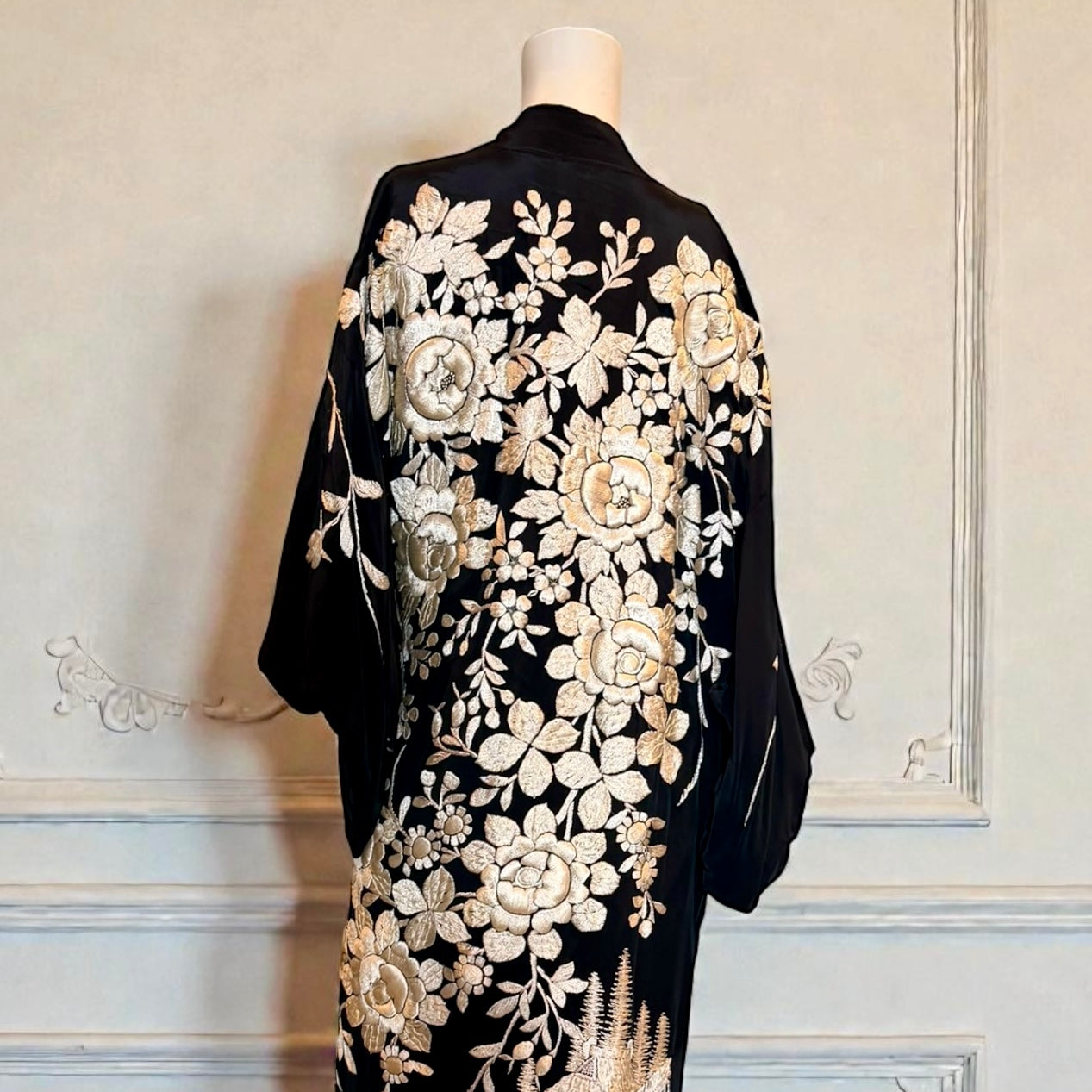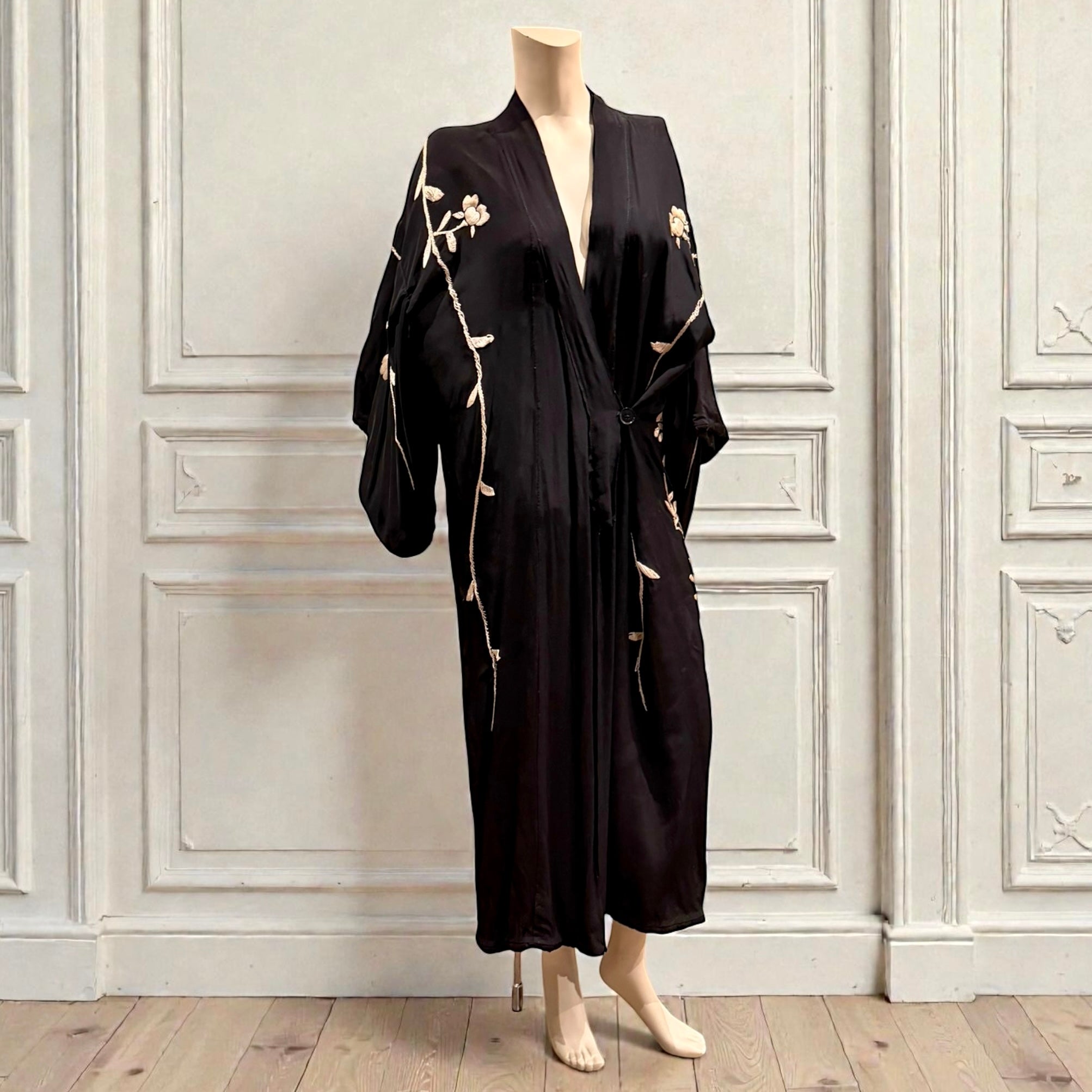 Embrace the allure of Oriental timeless  with this original handmade kimono, an exquisite piece steeped in the artistry of the 1940s. Crafted from sumptuous black silk, it showcases intricate white floral embroidery that gracefully adorns both the front and the back, echoing the delicate poetry of nature. The traditional sleeves and defined straight fit, complemented by a refined cross button and loop, ensure a silhouette that both flatters and enchants.