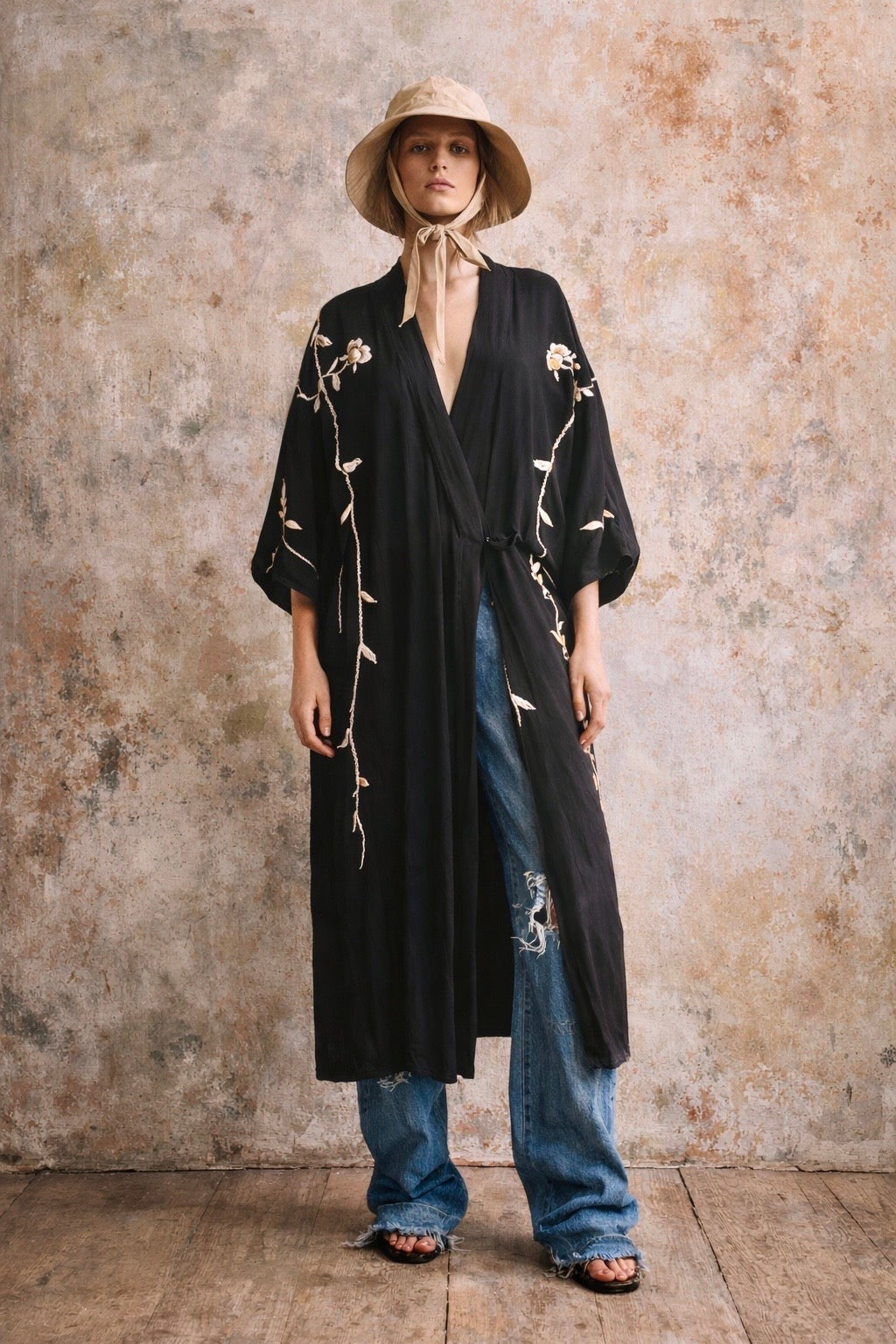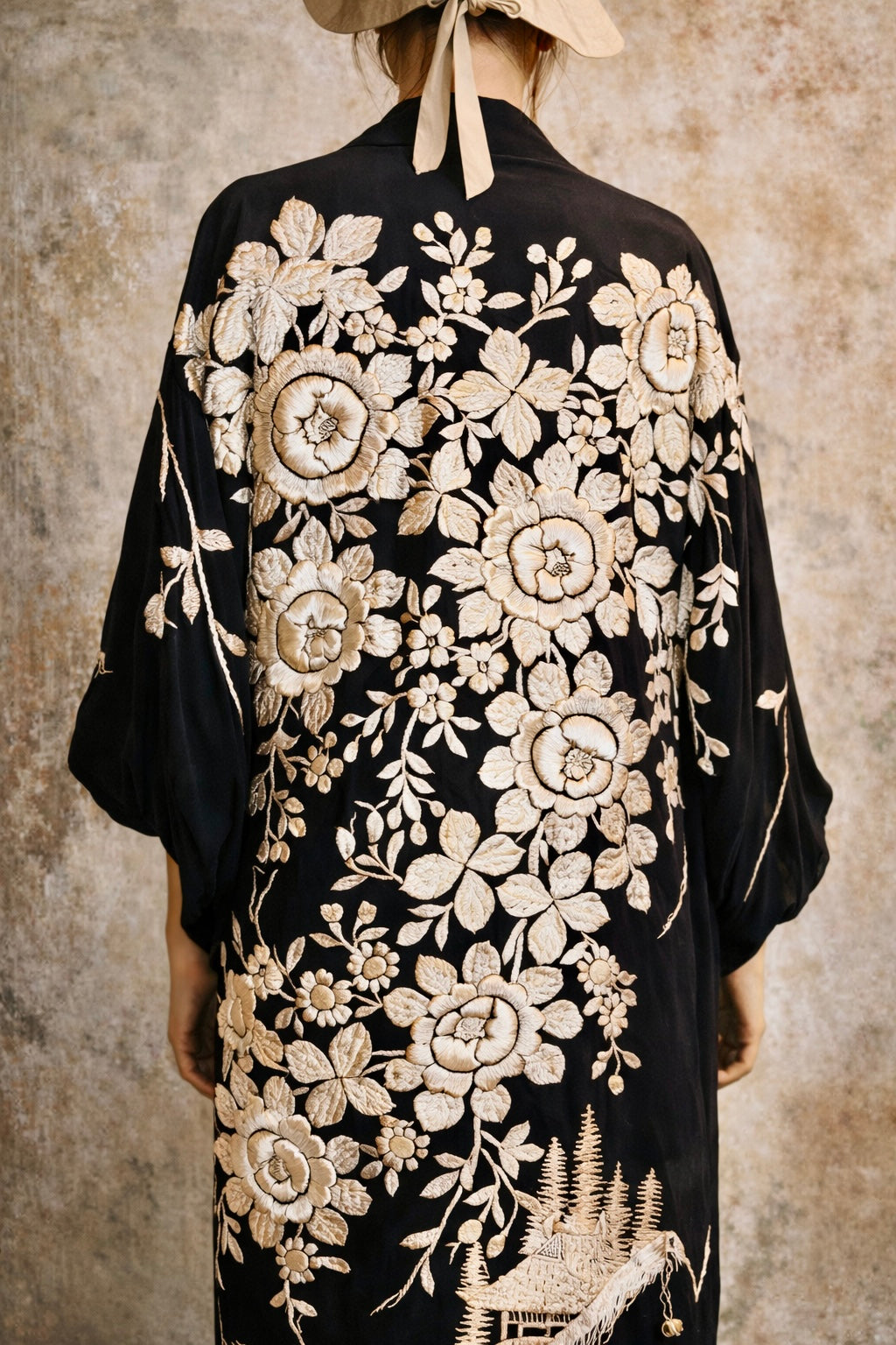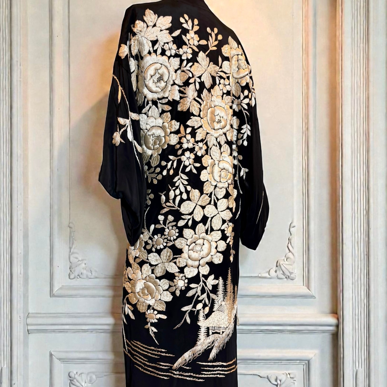 Embrace the allure of Oriental timeless  with this original handmade kimono, an exquisite piece steeped in the artistry of the 1940s. Crafted from sumptuous black silk, it showcases intricate white floral embroidery that gracefully adorns both the front and the back, echoing the delicate poetry of nature. The traditional sleeves and defined straight fit, complemented by a refined cross button and loop, ensure a silhouette that both flatters and enchants.
