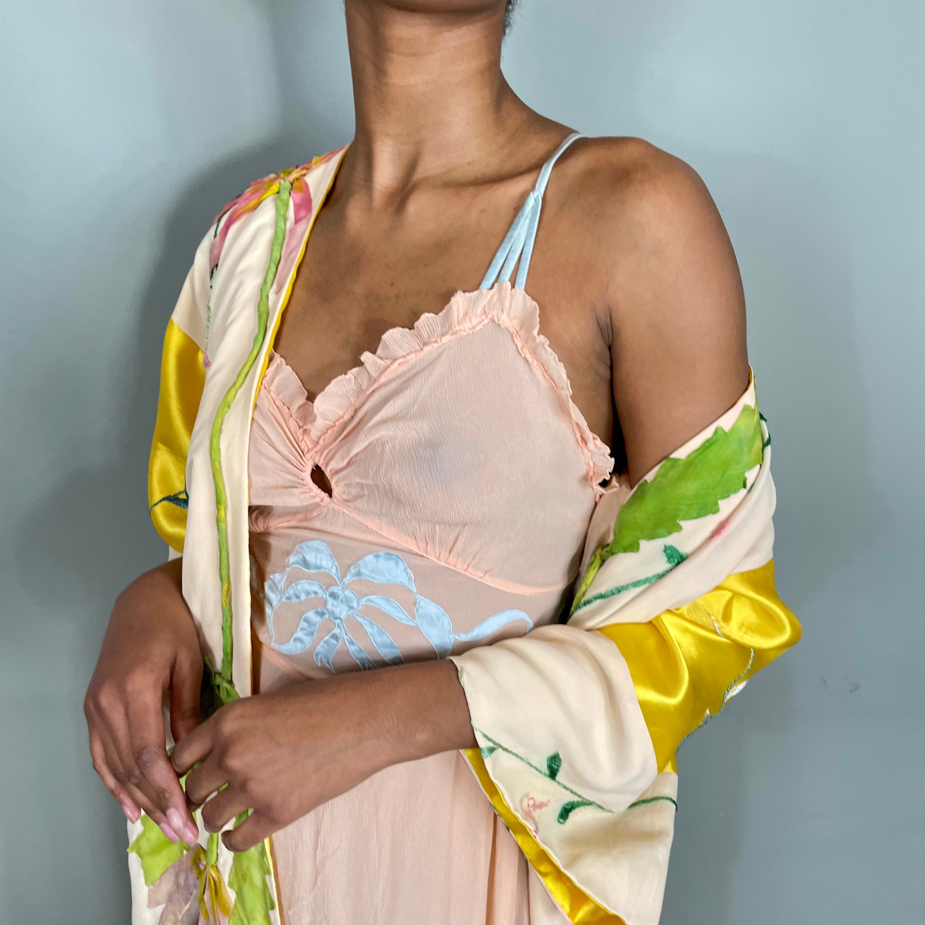 Bright and lush, reworked silk embroidered kimono. A piece like no other, this kimono has been tailored in a neat straight cut silhouette with straight wide sleeves with a contrasting nude silk. The front has a series of silk floral appliqué with open petals and muted colours and the back has a vibrant embroidered florals in sharp hues. All together a magnificent house robe or bikini cover up.